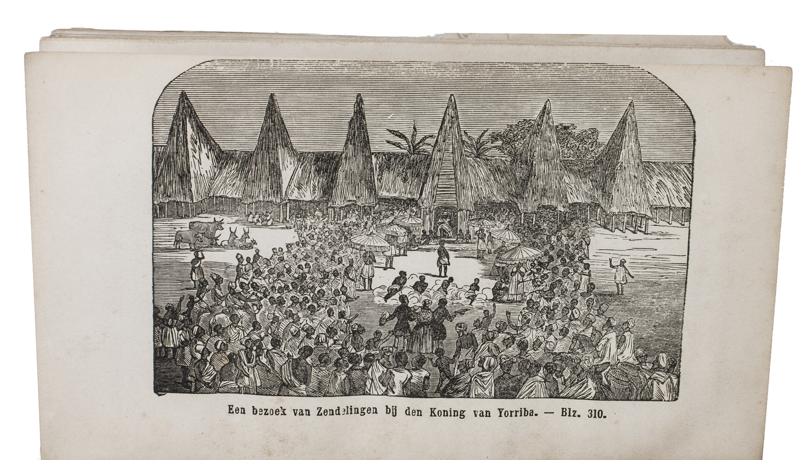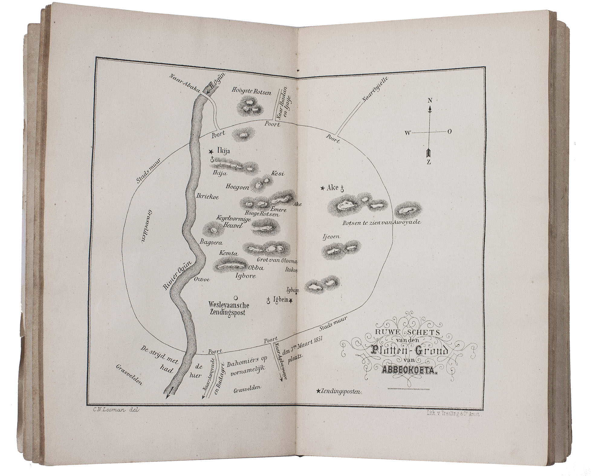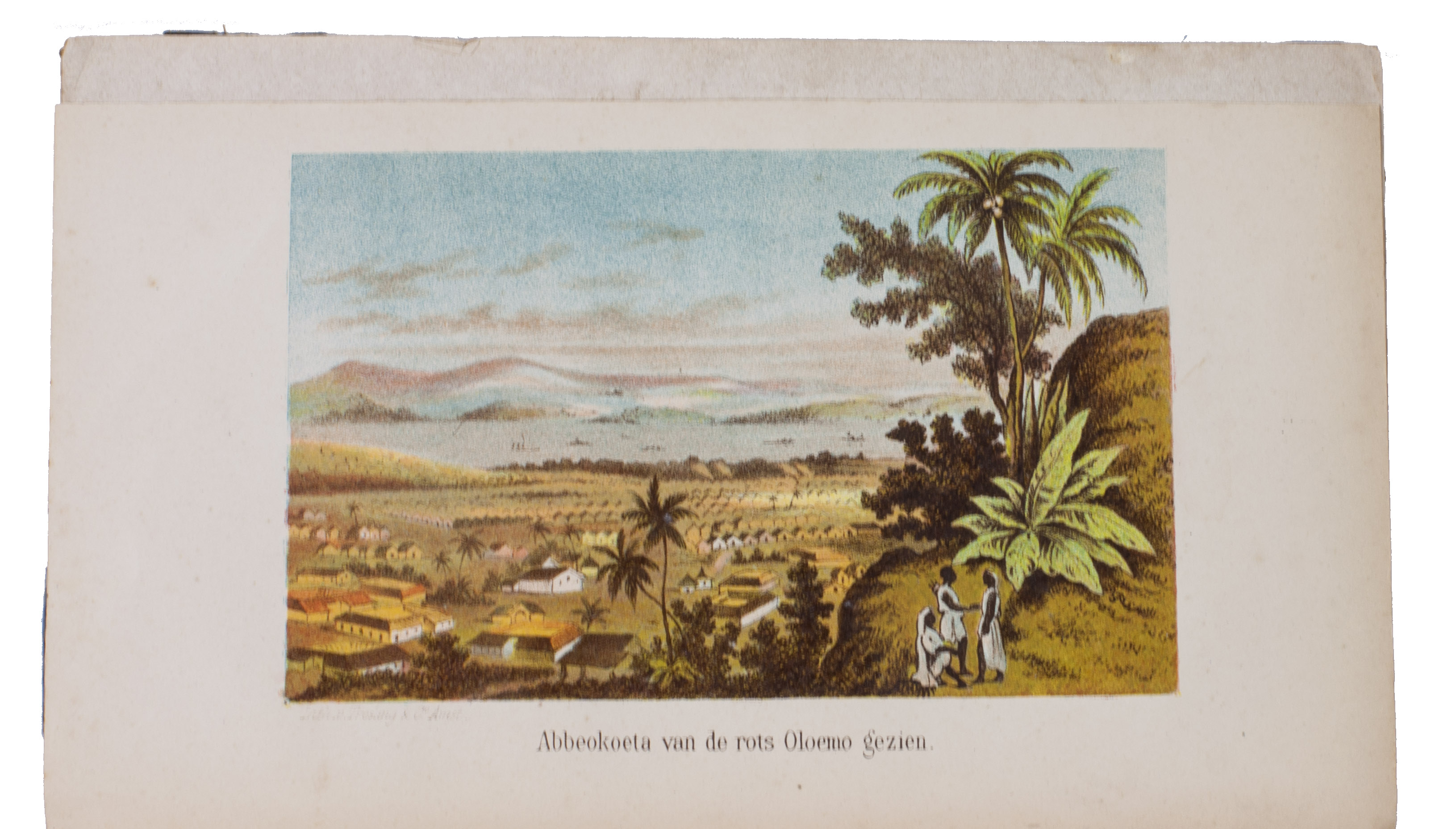 First and only edition of the expanded Dutch translation of Abbeokuta, or Sunrise within the tropics by Charlotte Maria Tucker (1821-1893), translated and expanded by Theodorus Matthijs Looman (1816-1900). It is a description of Yorubaland, West Africa, and the Christian mission. The book opens with a chapter on the slave trade -- the Yoruba people were among the most heavily targeted -- followed by chapters on the Muslim Fula people, the Niger-expedition, Abeokuta, etc. It includes maps of West Africa, Yorubaland and Abeokuta, and several other illustrations.