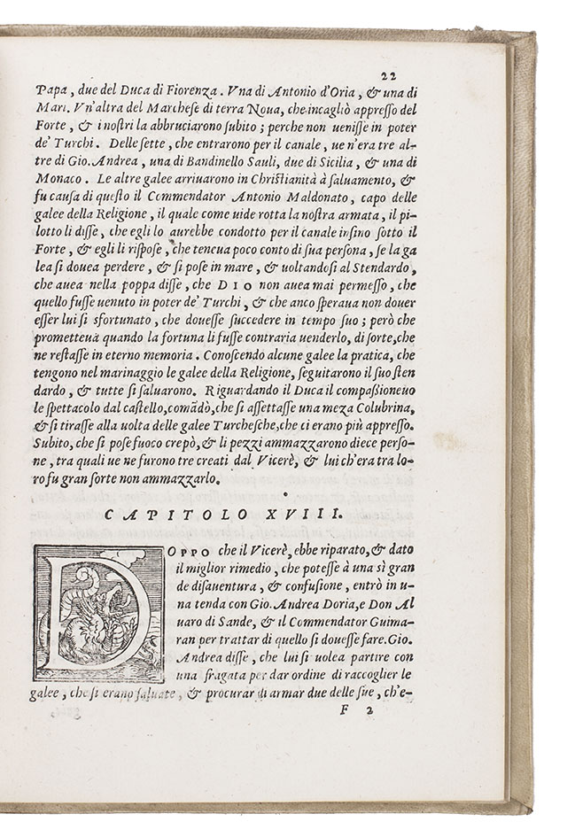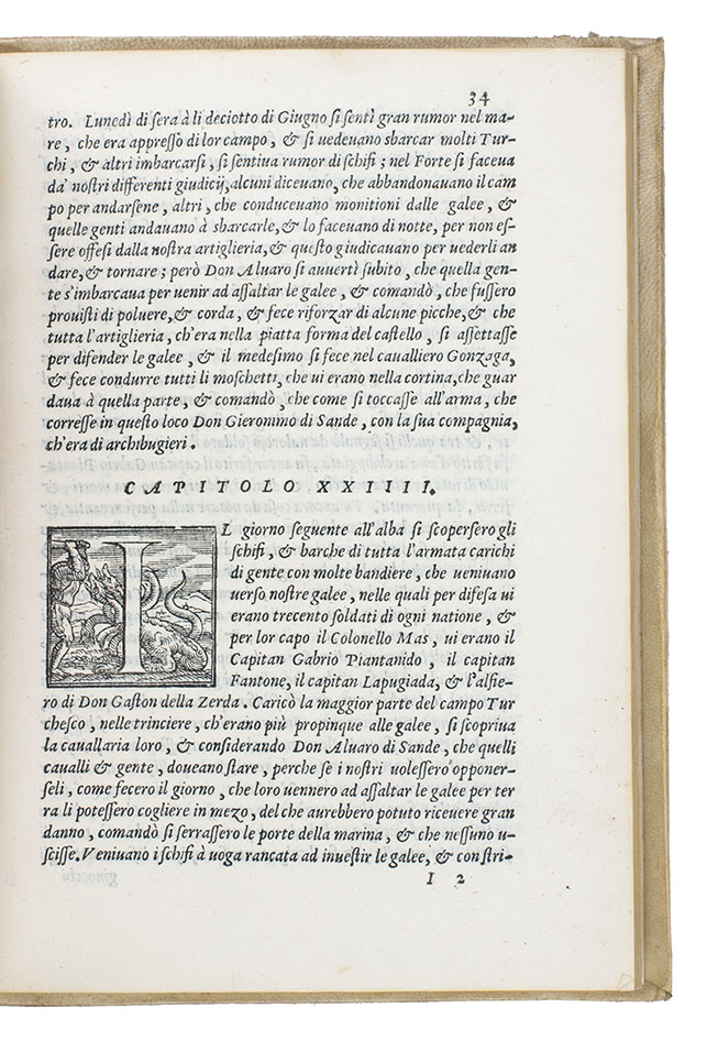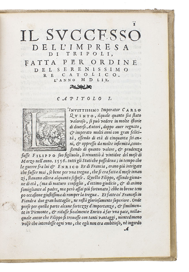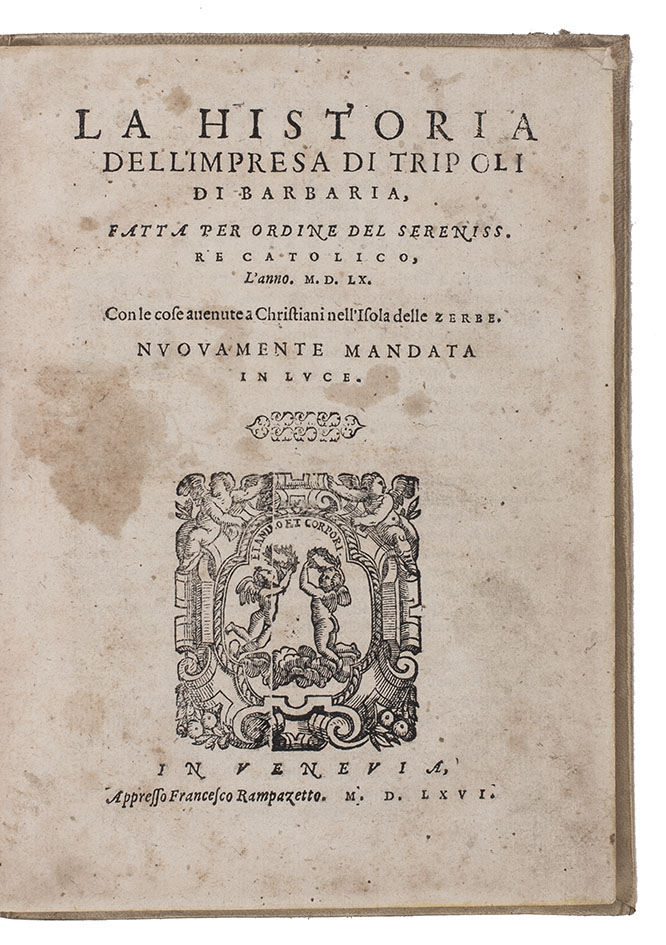 Second edition (first dated), of Alfonso de Ulloa's account of the Siege of Tripoli (1551), the Battle of Djerba (1560) and the Great Siege of Malta (1565): a series of conflicts between a large Christian Mediterranean Alliance and the Islamic Ottoman Empire for control of the Mediterranean.