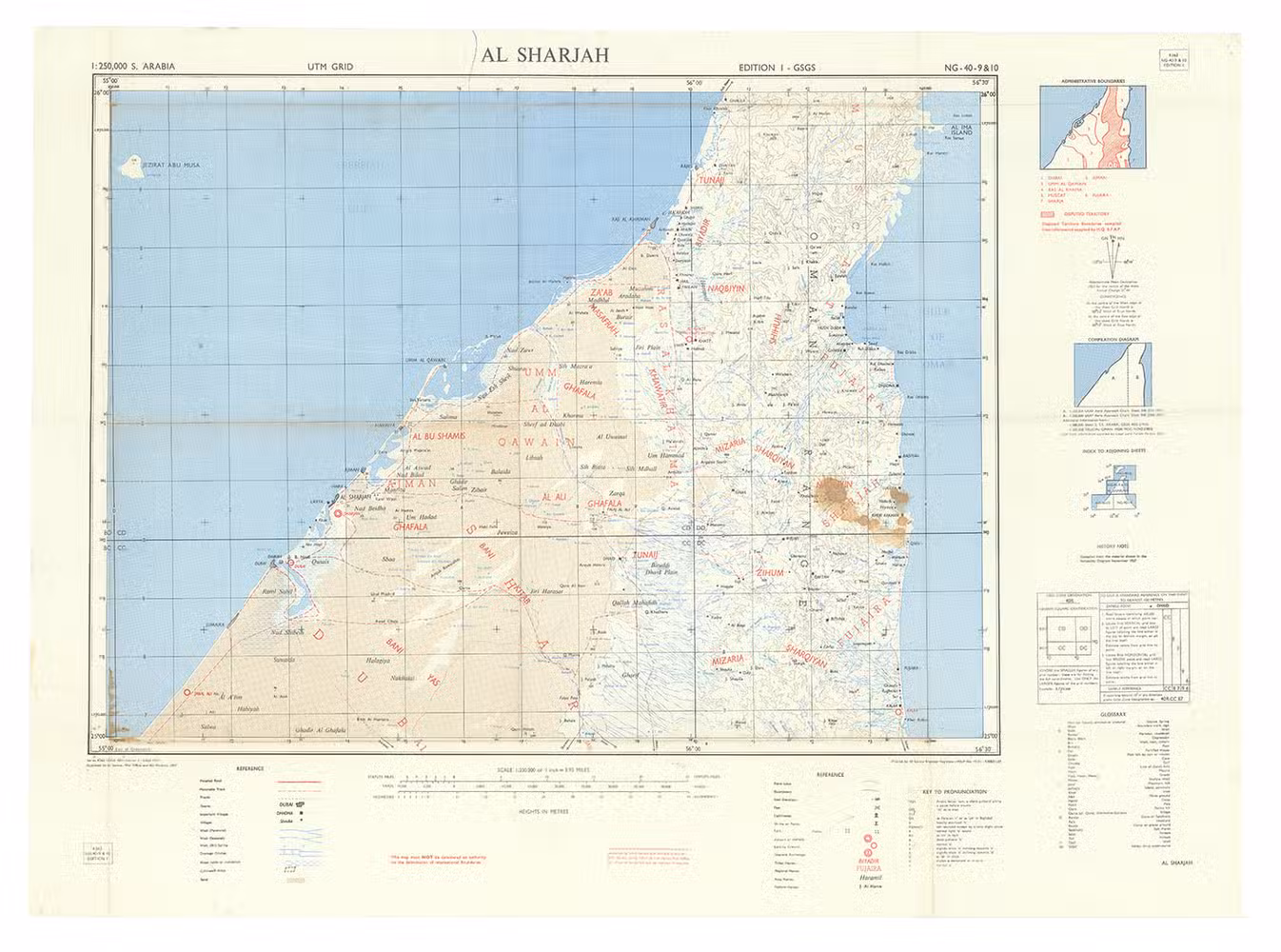An extremely detailed map of what are today the northernmost six Emirates of the UAE (at the time of issue, the Trucial States): Dubai, Sharjah, Ajman, Umm al Quwain, Ras al Khaimah, and Fujairah, also marking the names of all the tribes holding power in the various areas. Issued by the Geographical Section, General Staff (GSGS) as part of their 1:250,000 scale map series of Arabia. The GSGS, also known as MI 4, operated under the Director of Military Operations and Intelligence. Its role was to supply maps to the British armed forces, collect data on foreign survey networks, provide training, and prepare survey data for Expeditionary Force mobilisation.