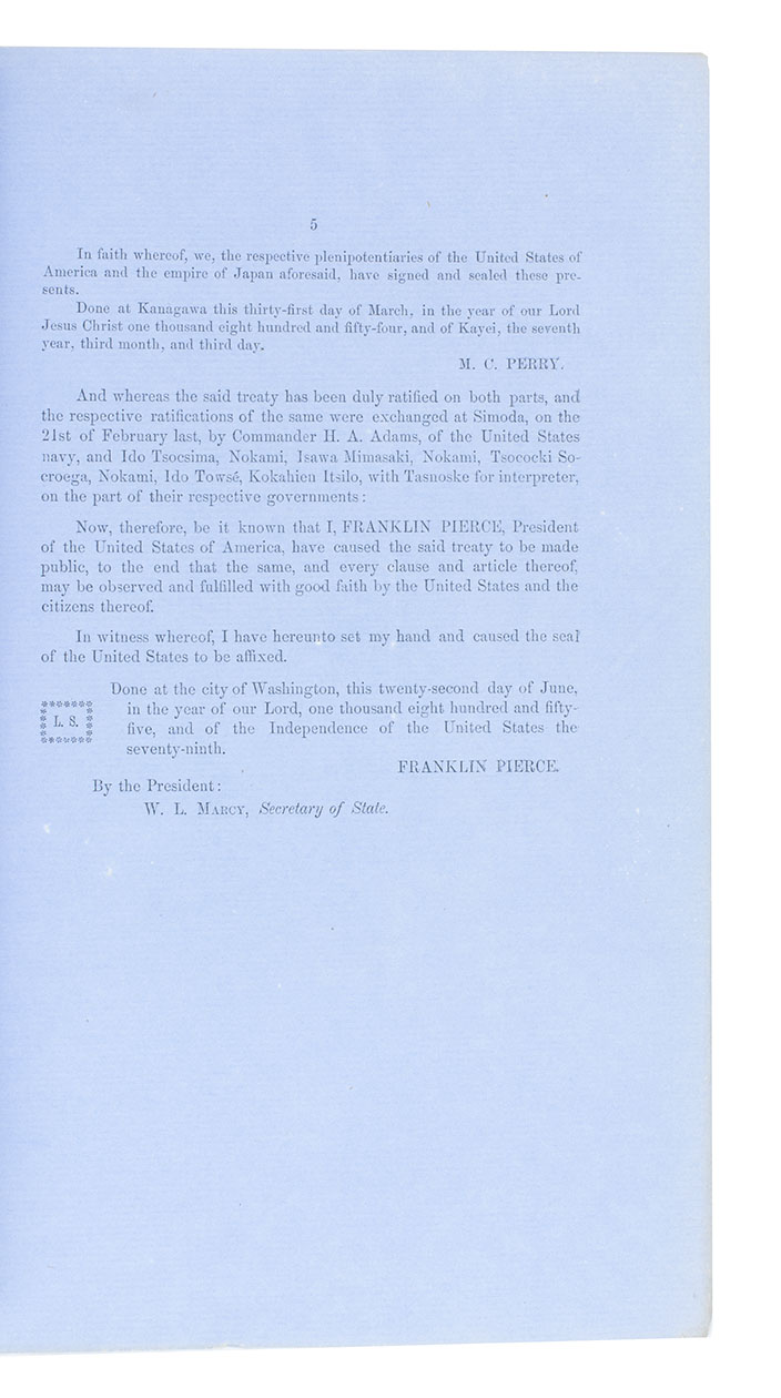 [Washington, D.C., 1855]. Folio. Signed in type by Franklin Pierce as President and by W. L. Marcy as Secretary of State. Original printed self-wrappers, stitched. 5, [1 blank] pp.