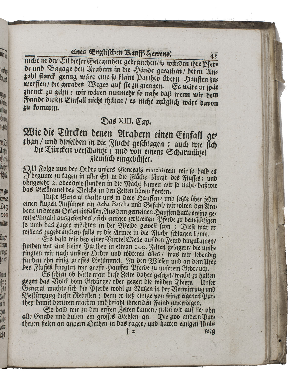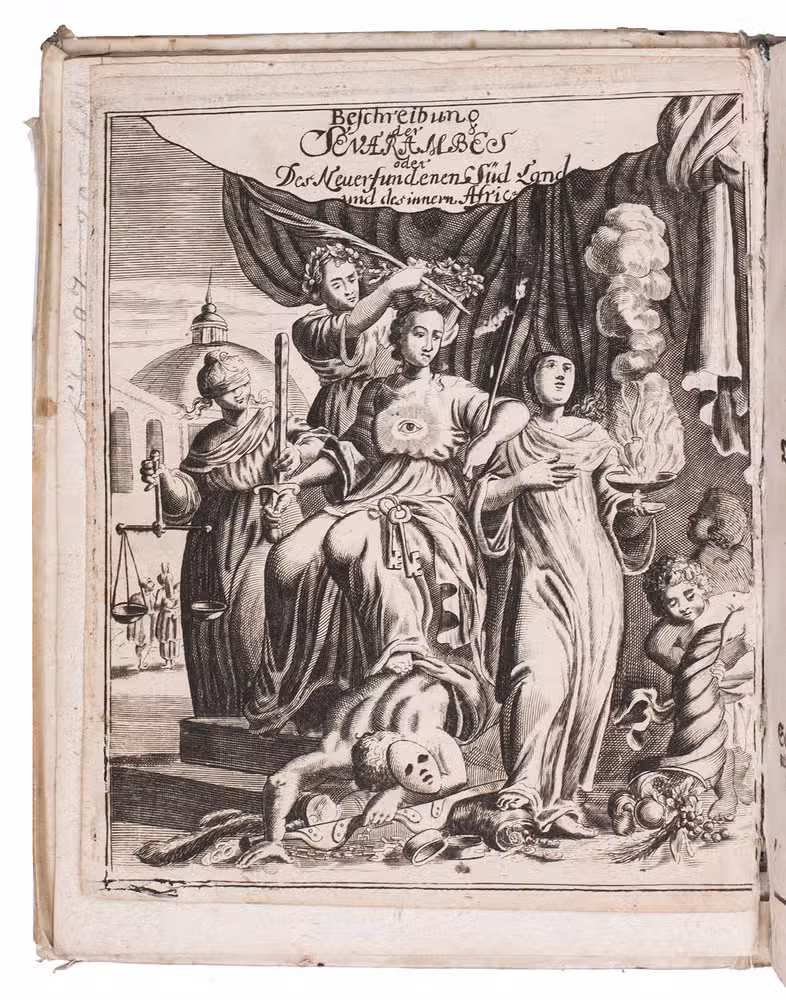 First edition of the German translation of the utopian novel Histoire des Sevarambes (History of the Sevarambians) by the French writer Denis Vairasse (ca. 1635-1700). It describes an imaginary journey to Australia and gives the history of the people living there, in the style of Thomas Moore's Utopia. It tells the story from the perspective of one Captain Siden [Denis], whose ship discovers the great kingdom Sevarambia. Presented in the manner of the contemporary geographical and anthropological works, the book provides a direct criticism of imposed religions, in particular attacking 17th-century Catholicism (Vairasse himself was a Protestant). Remarkably, this edition also includes the first German translation of Thomas Smith's account of slavery in Africa, in the original English entitled The adventures of an English merchant, taken prisoner by the Turks of Algiers, and carried into the inland countries of Africa.