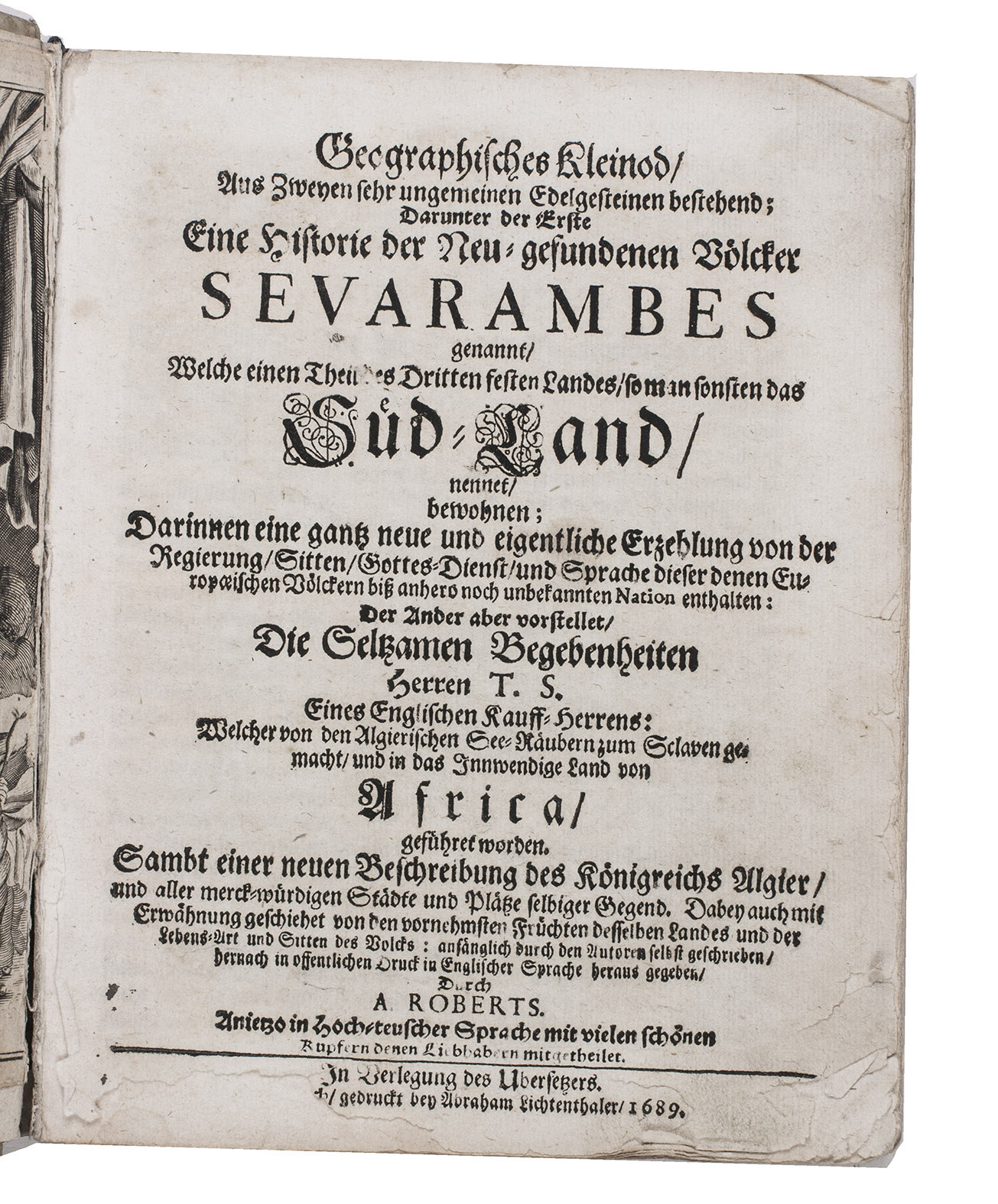 Geographisches Kleinod, aus zweyen sehr ungemeinen Edelgesteinen bestehend; darunter der Erster eine Historie der New-gefundenen Völcker Sevarambes genannt, ... Der Ander aber vorstellet die seltzamen begebenheiten herren T.S. eines englischen Kauff-Herrens...