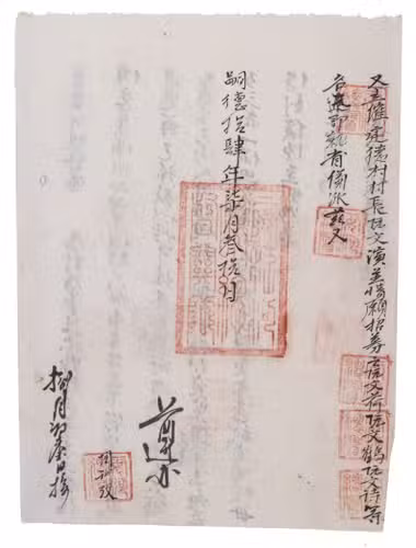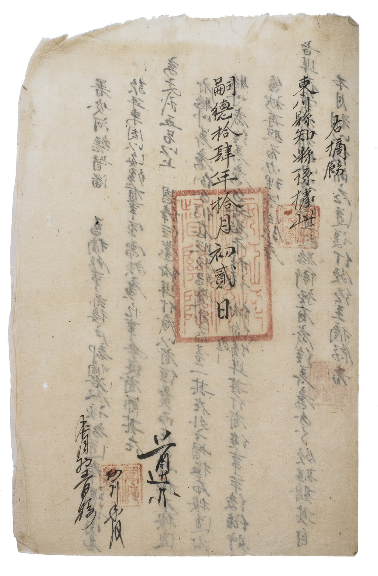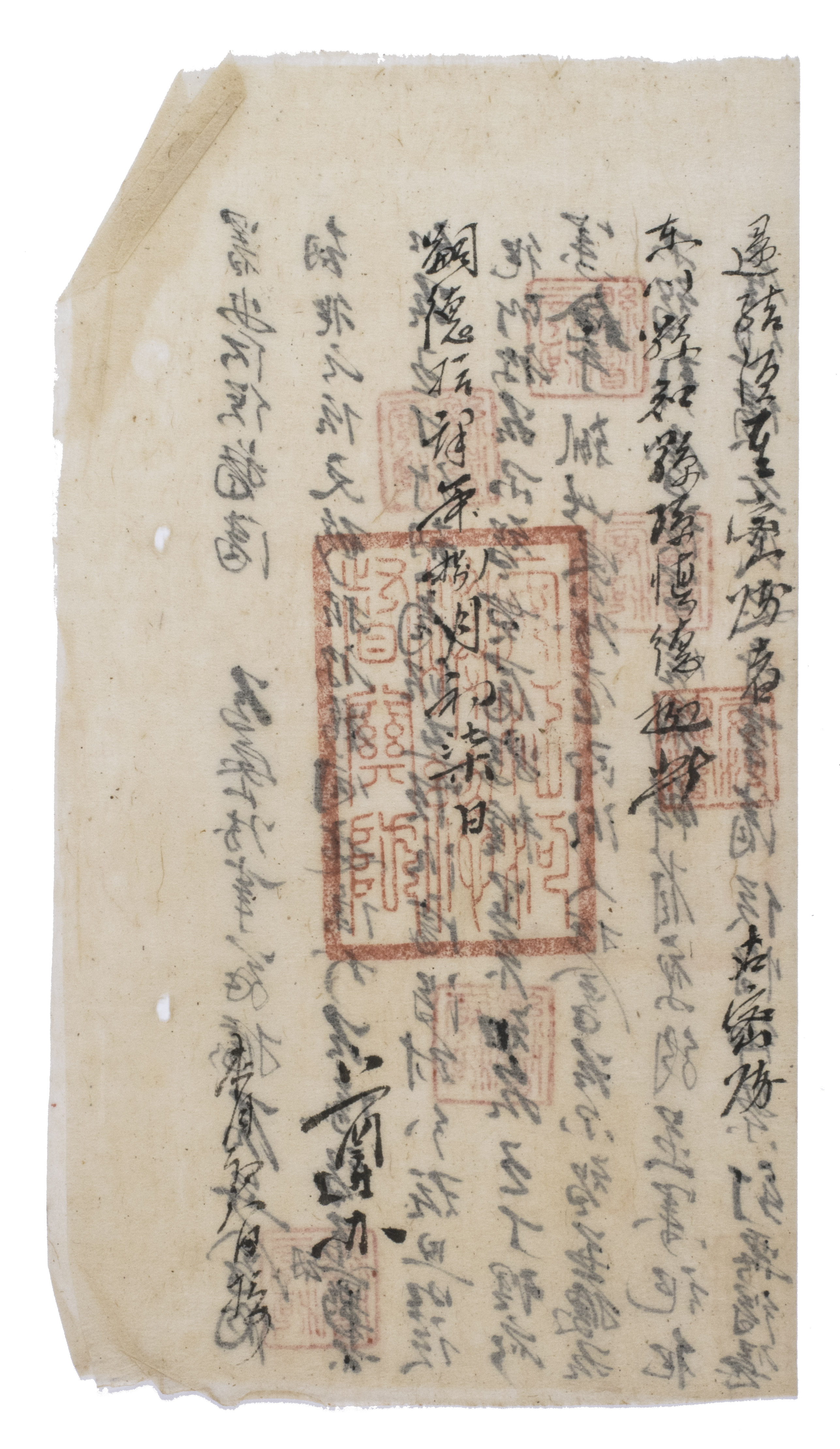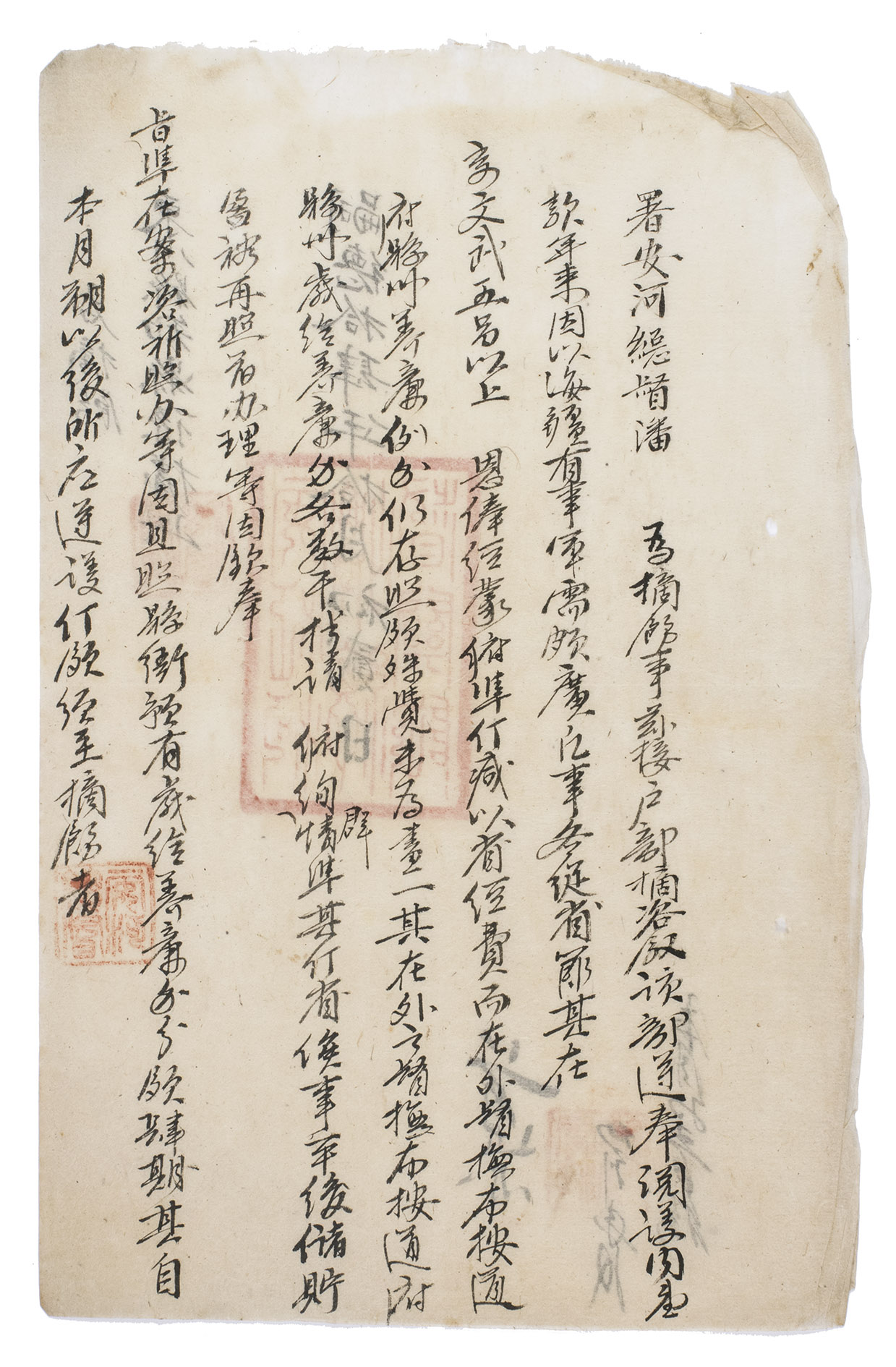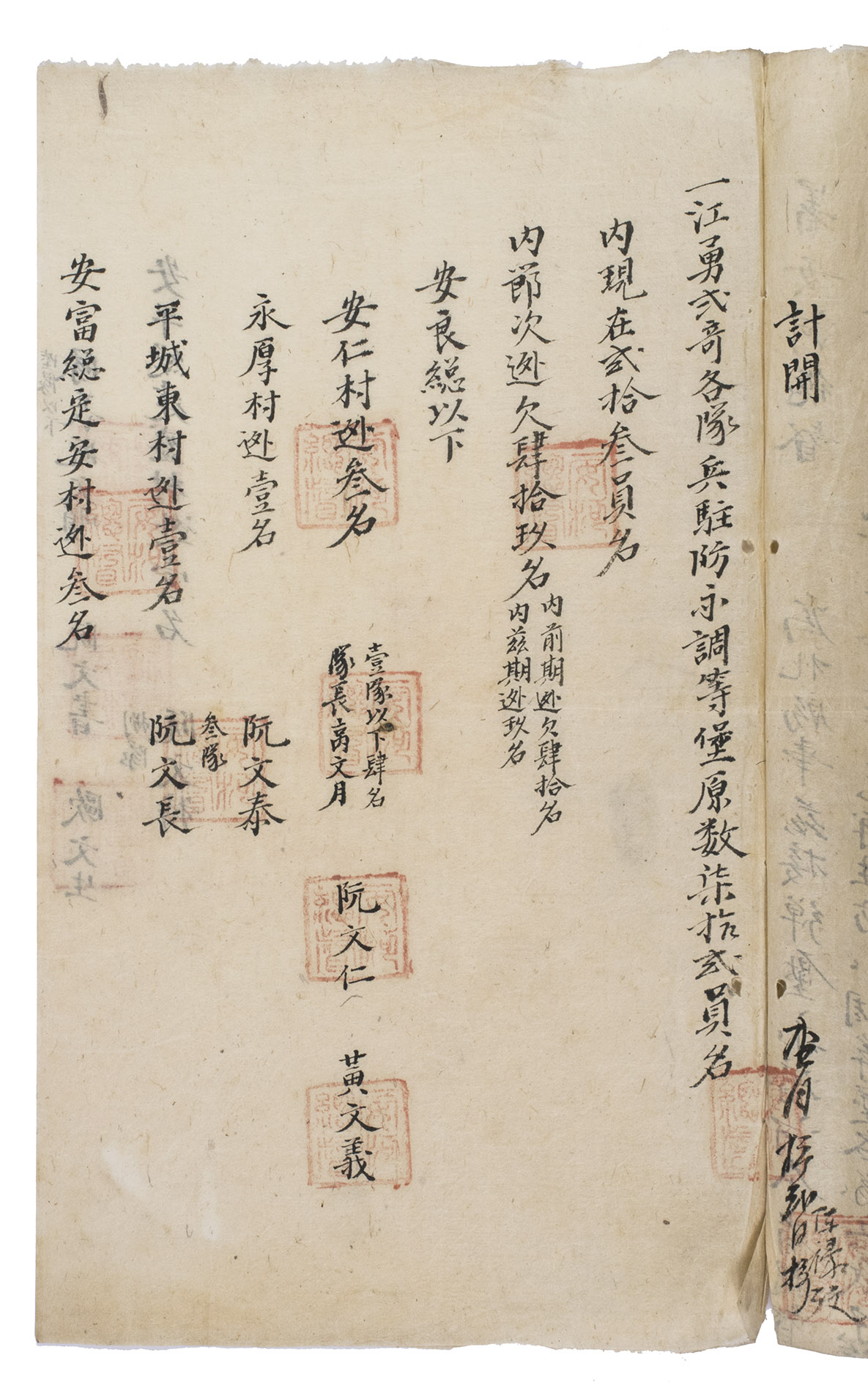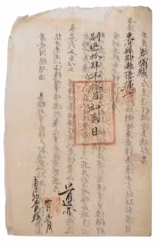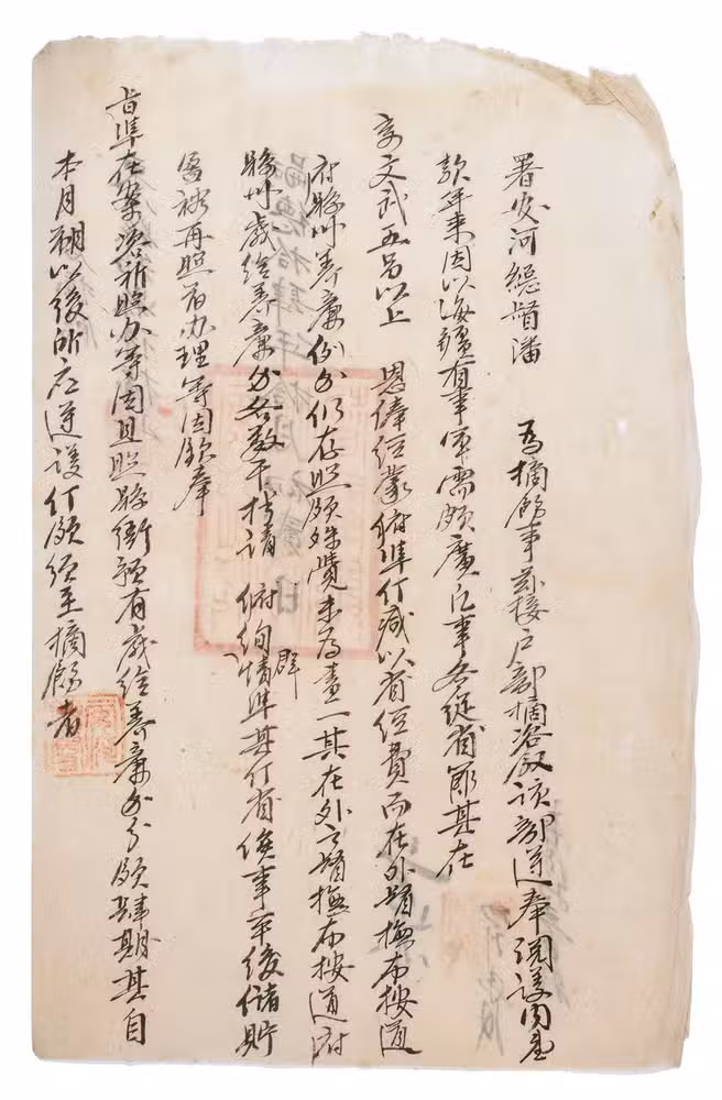 Remarkable collection of 21 official Vietnamese documents, written on rice paper in Classical Chinese, and with red government stamps. The collection includes memorials and communications from higher government offices to lower ones, and discusses, among other things, the problem of damage to and abandonment of agricultural land due to criminal activities. All documents are dated, mostly to the 1860s, during the French conquest of Vietnam (1858-1885). Little is known about Vietnamese official documents of this period, making the present collection especially important.