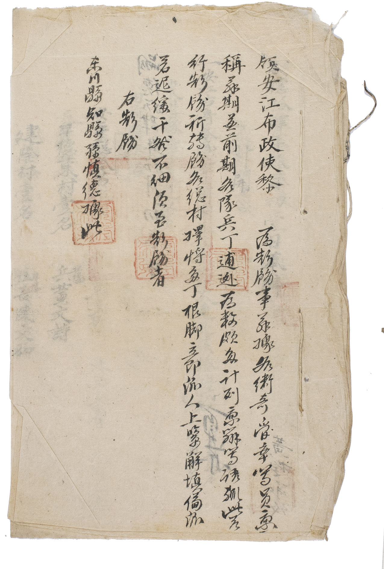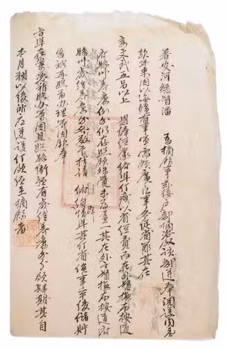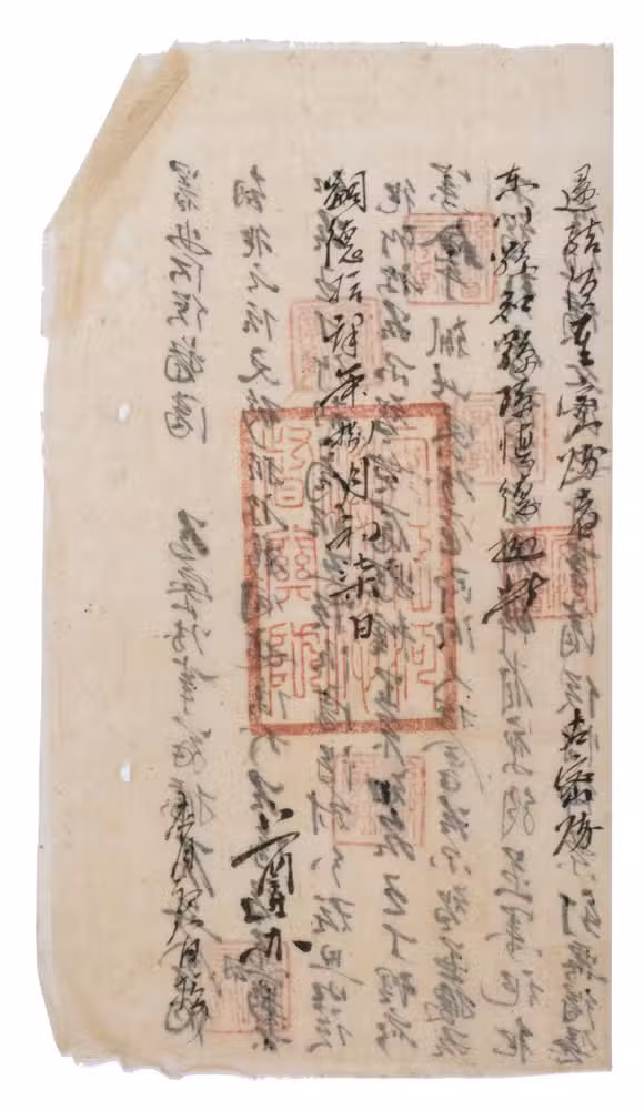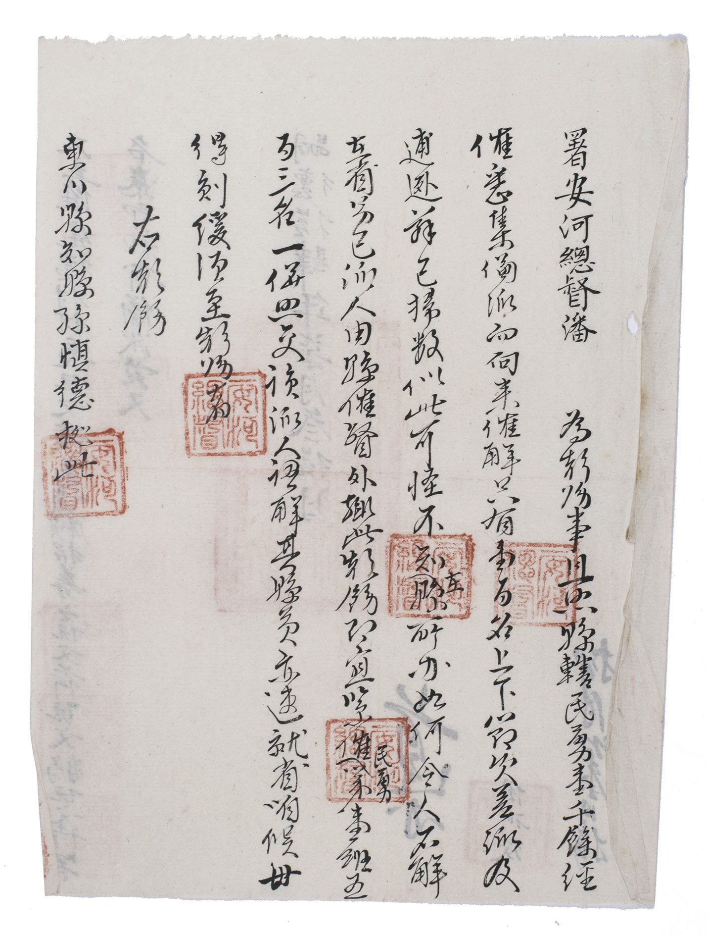 With red official stamps in seal script on most of the documents. The documents are lightly browned, a few are slightly (water) stained, some of the double leaves are cut or torn on the folds. Otherwise in good condition.