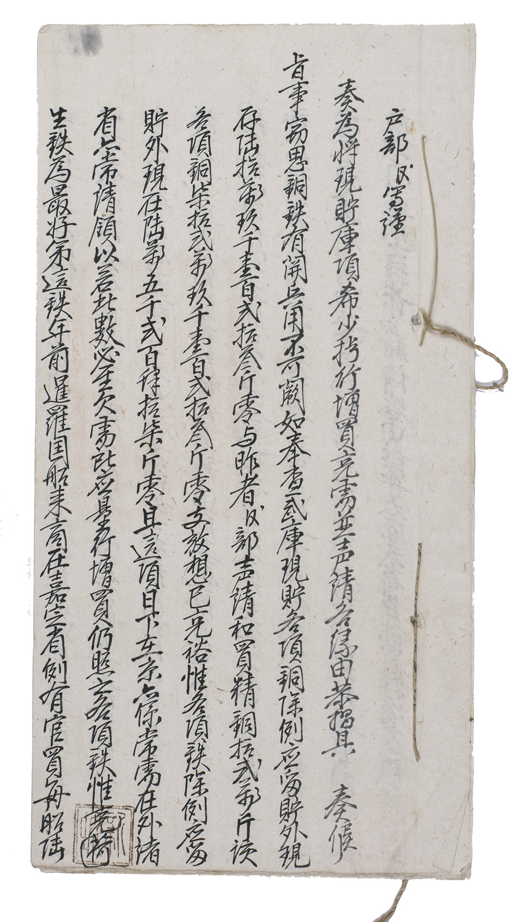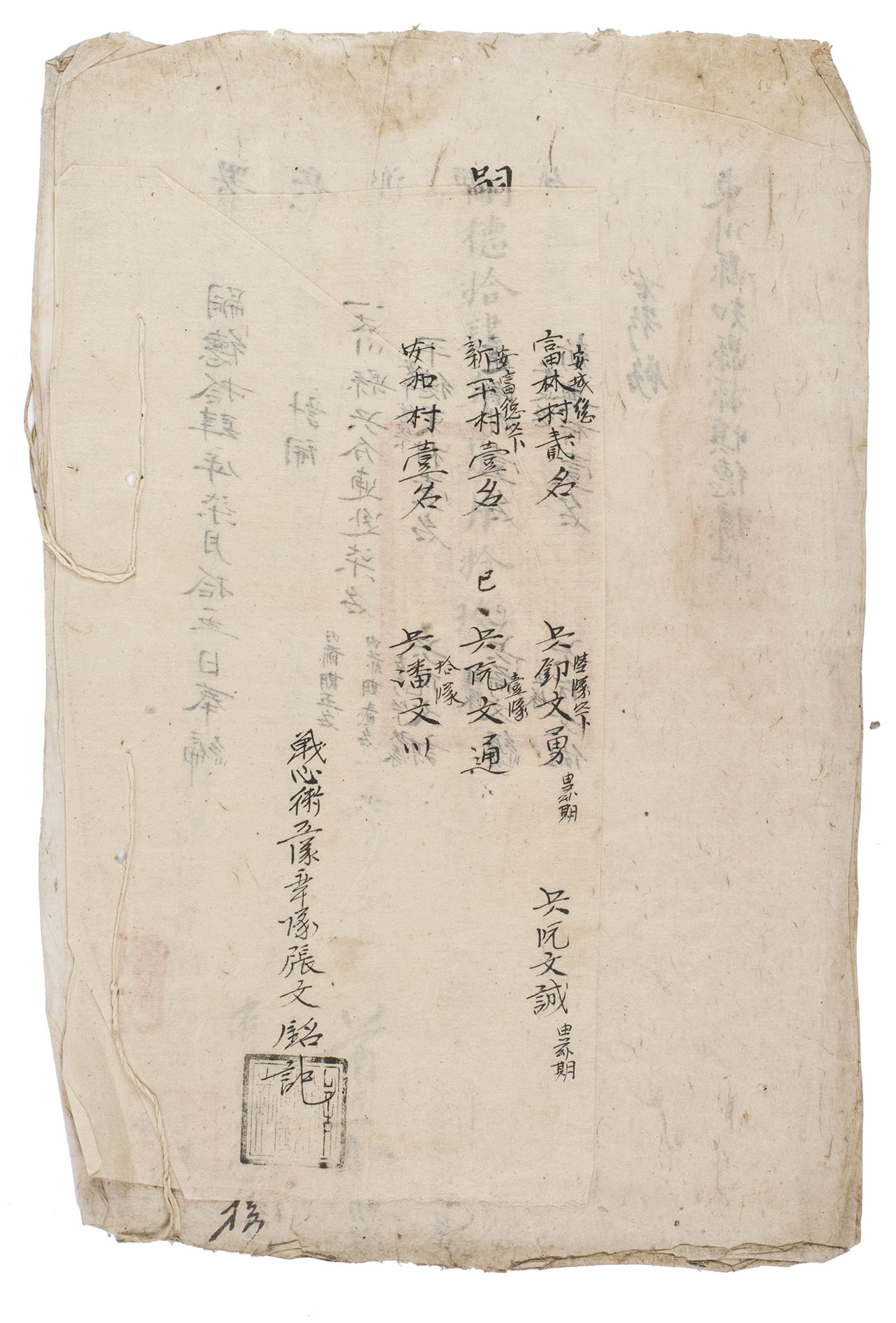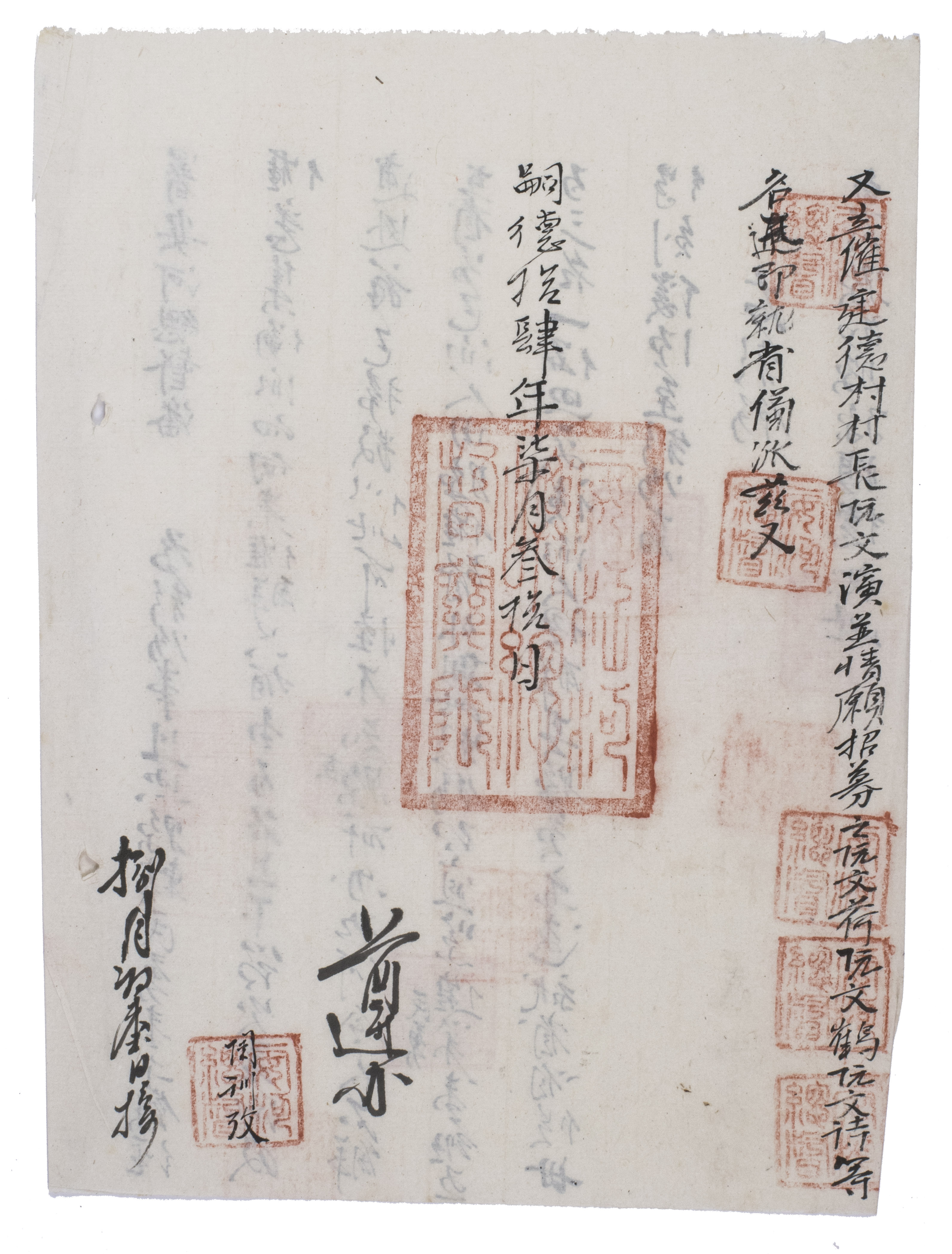 With red official stamps in seal script on most of the documents. The documents are lightly browned, a few are slightly (water) stained, some of the double leaves are cut or torn on the folds. Otherwise in good condition.