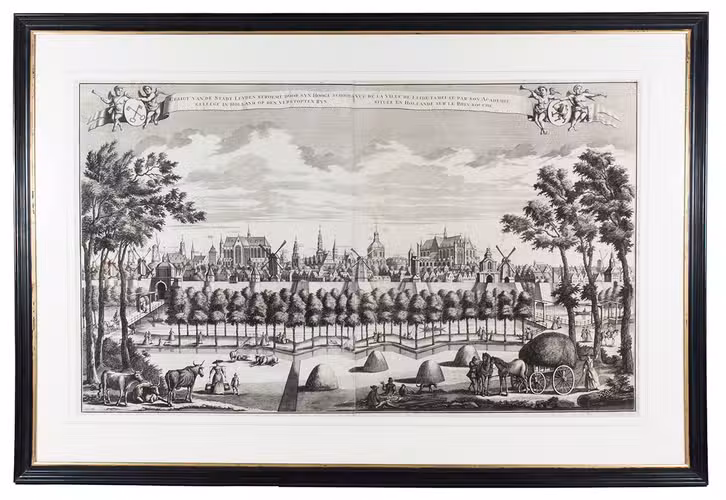 [Amsterdam], Leonardus Schenk, [ca. 1728/36]. Large engraved wall print on 2 sheets (together 57.5 x 97 cm) showing the Leiden city wall between the Koepoort and Zijlpoort, with various windmills and prominent buildings in the background identified by name. The title appears in a banderole at the head, with putti on either side holding the arms of Leiden and Holland. Leonardus Schenk's name appears as engraver and publisher at the right end of the banderole. Framed (82.5 x 121 cm).