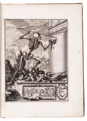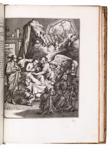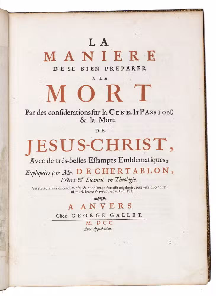 Beautiful and inspiring series of plates, designed by the great Dutch artist Romeyn de Hooghe (1645-1708), presenting a "miror of good death", and consisting of three general plates, numbered A-C, and a series of 39 numbered plates of people on their deathbeds. Intended to teach how to die well by means of pictures from the "Life of Jesus", the print-series was first published with texts in French and in Dutch by David de la Vigne, at Antwerp and Amsterdam in 1673. The plates must have gone astray as the series was published again with Dutch text by David de la Vigne in 1694, with the plates newly engraved in slightly smaller size and in reverse. Here these plates were used again, but published with new texts by De Chertablon, a Roman Catholic priest who extensively describes and explains what is shown on the plates. He also divided the plates into three series of 13 plates, each series headed by one of the general plates for frontispiece. And to the preliminaries De Chertablon added a preface discussing the origin and the fear of death, a prayer to prepare for death, and several proverbs on death in French and Latin, thus making the print-series into a school book as well.