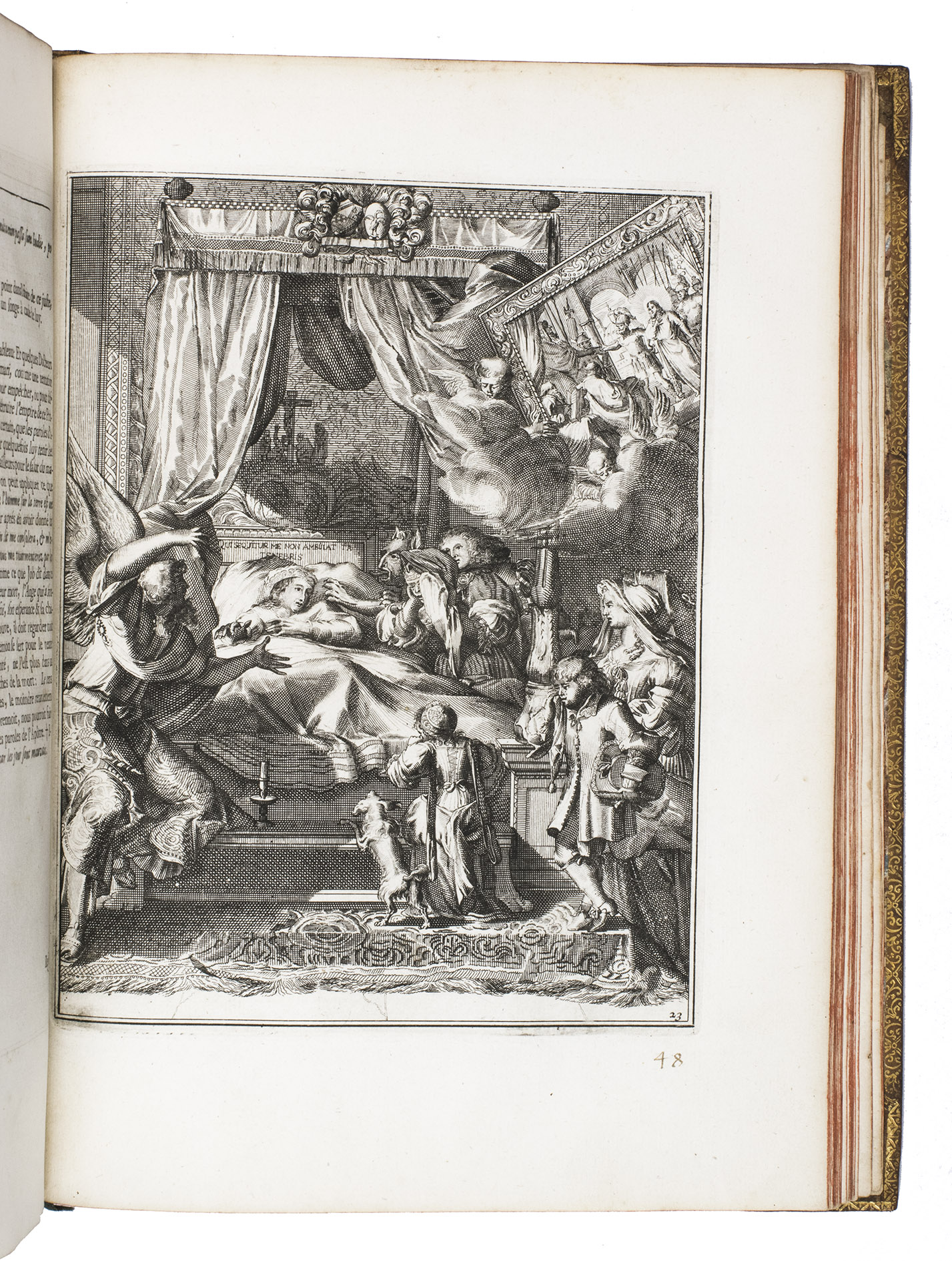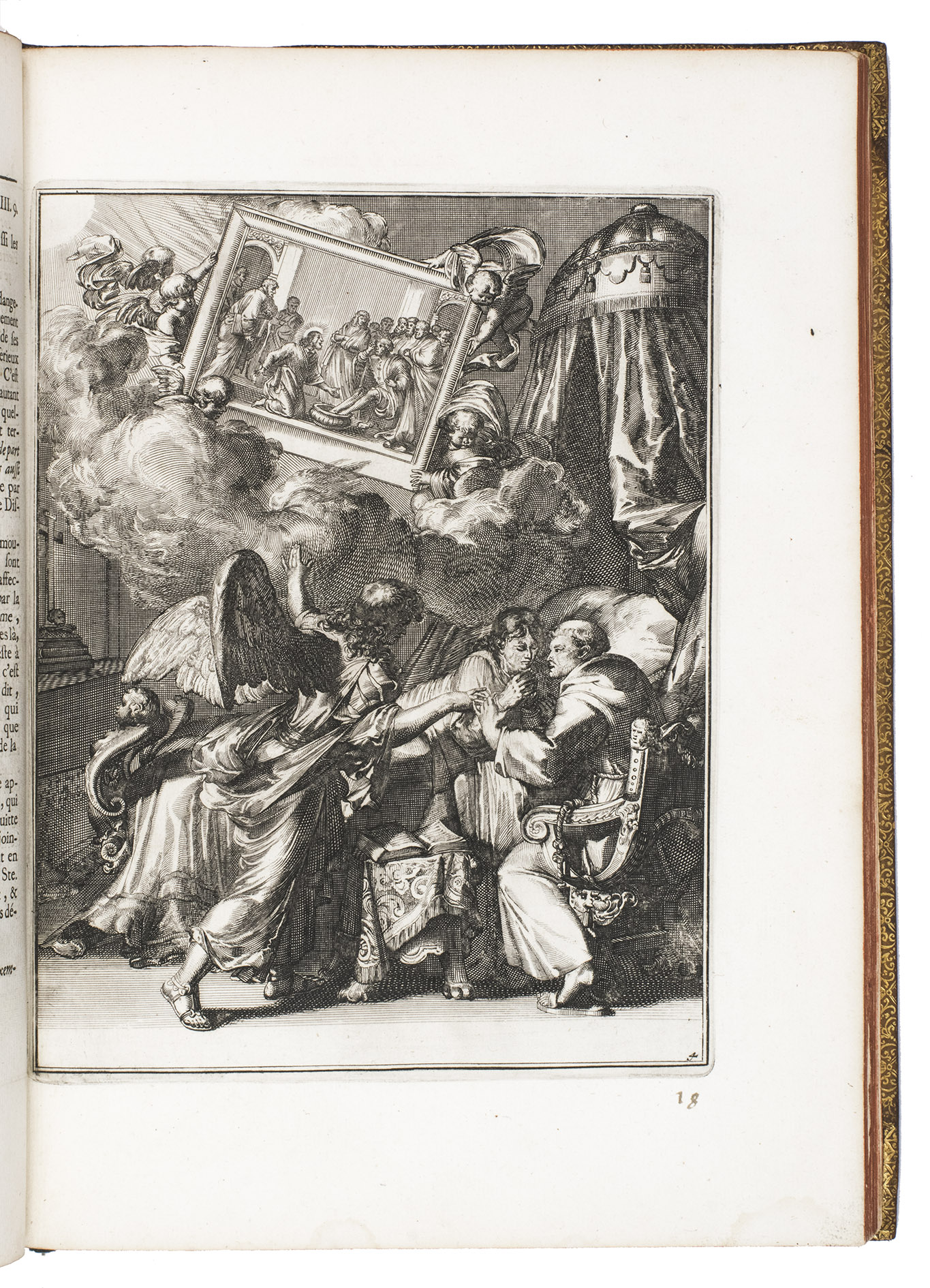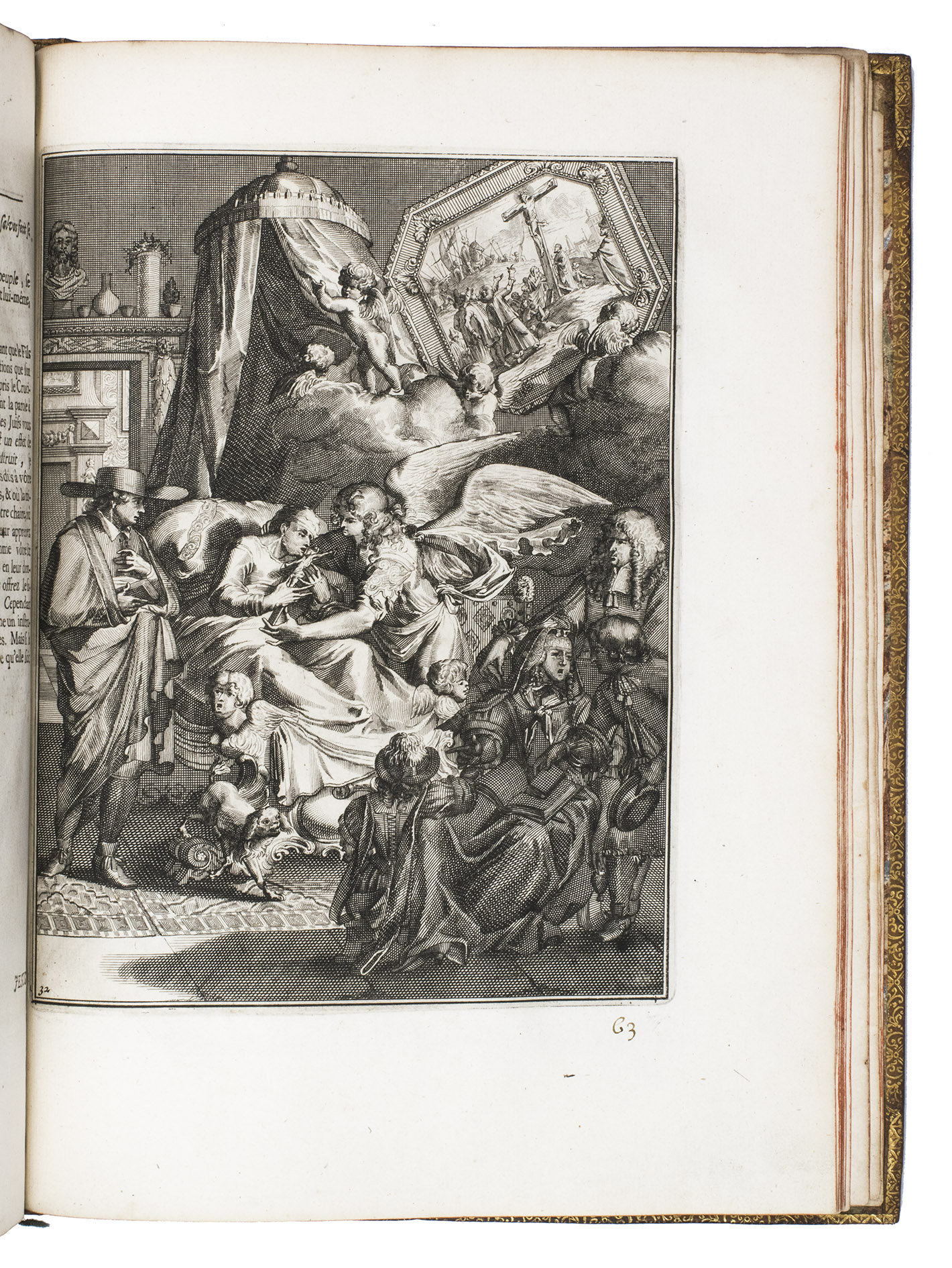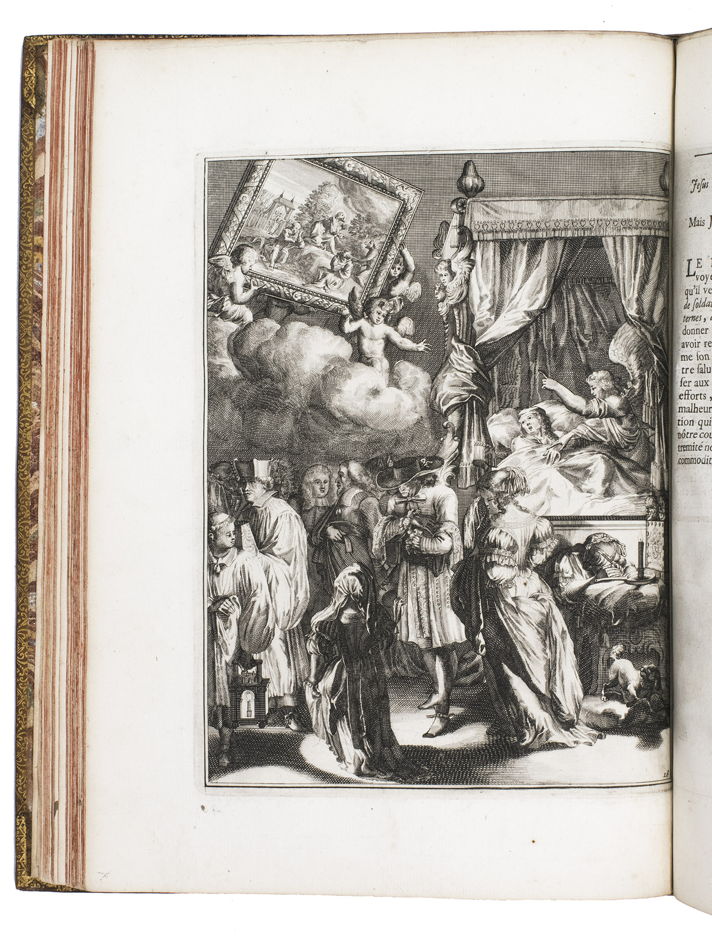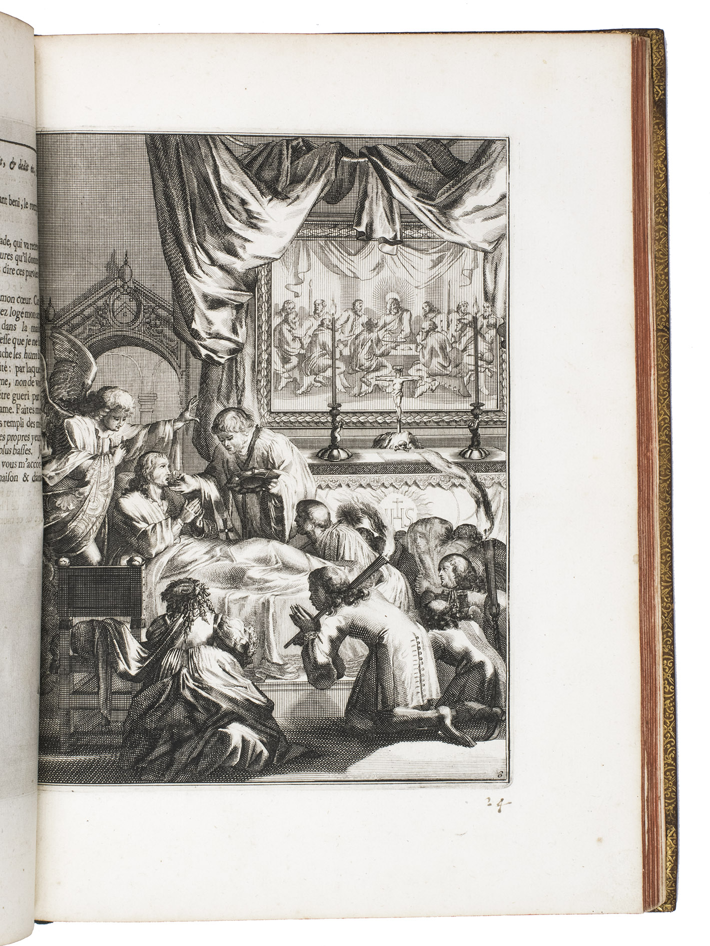 From the library of Armand-Jean de Vignerot du Plessis, 2nd Duc de Richelieu (1629-1715). The binding shows some signs of wear, some paper repairs, and some occasional minor dust soiling and water staining. Otherwise in very good condition. Chr. Coppens, Een Ars moriendi met etsen van Romeyn de Hooghe: Verhaal van een boekillustratie (Verhand. Kon. Acad. v. Wetensch., Lett. en Schone Kunsten van België; Brussels 1995); Hollstein IX, R. de Hooghe 1128 (Dutch ed. of 1694);Landwehr, Romeyn de Hooghe, 84, note; Romeyn de Hooghe, de verbeelding van de late Gouden Eeuw, ed. H. van Nierop, a.o. (2008), p. 275, no. 1700.04; cf. p. 263, no. 1673.14; STCN 108164977 (4 copies, incl. 1 incomplete); USTC 1848568, 1535292 (30 copies) ; cf. STCN 036830909 (5 copies, same work but different collation); USTC 1847975, 1535293 (6 copies, same work but different collation); for the coat of arms: Olivier 2314.