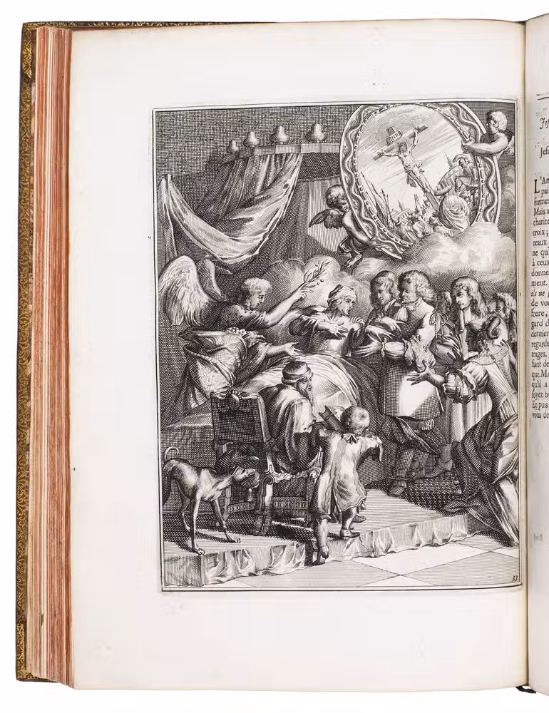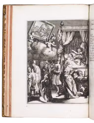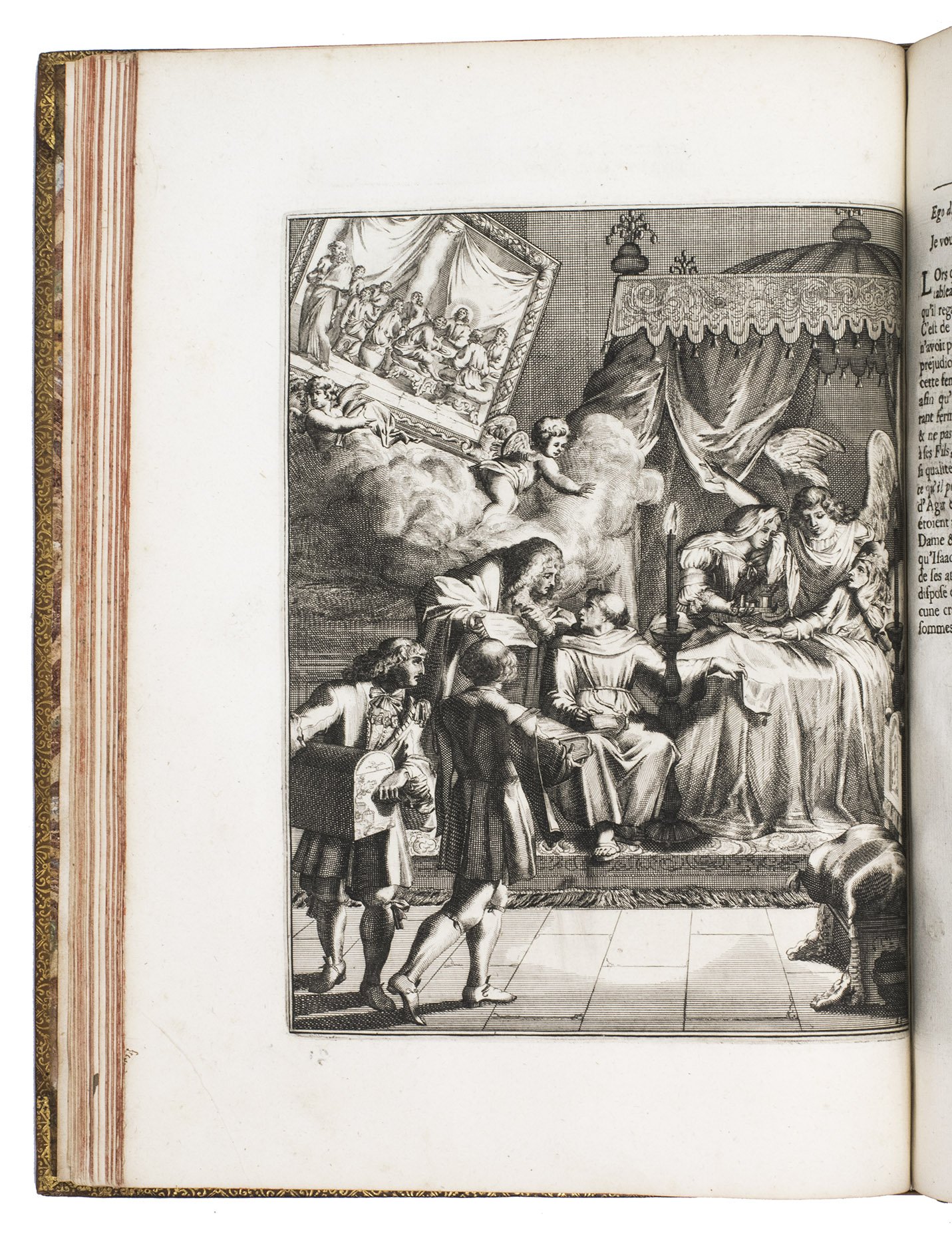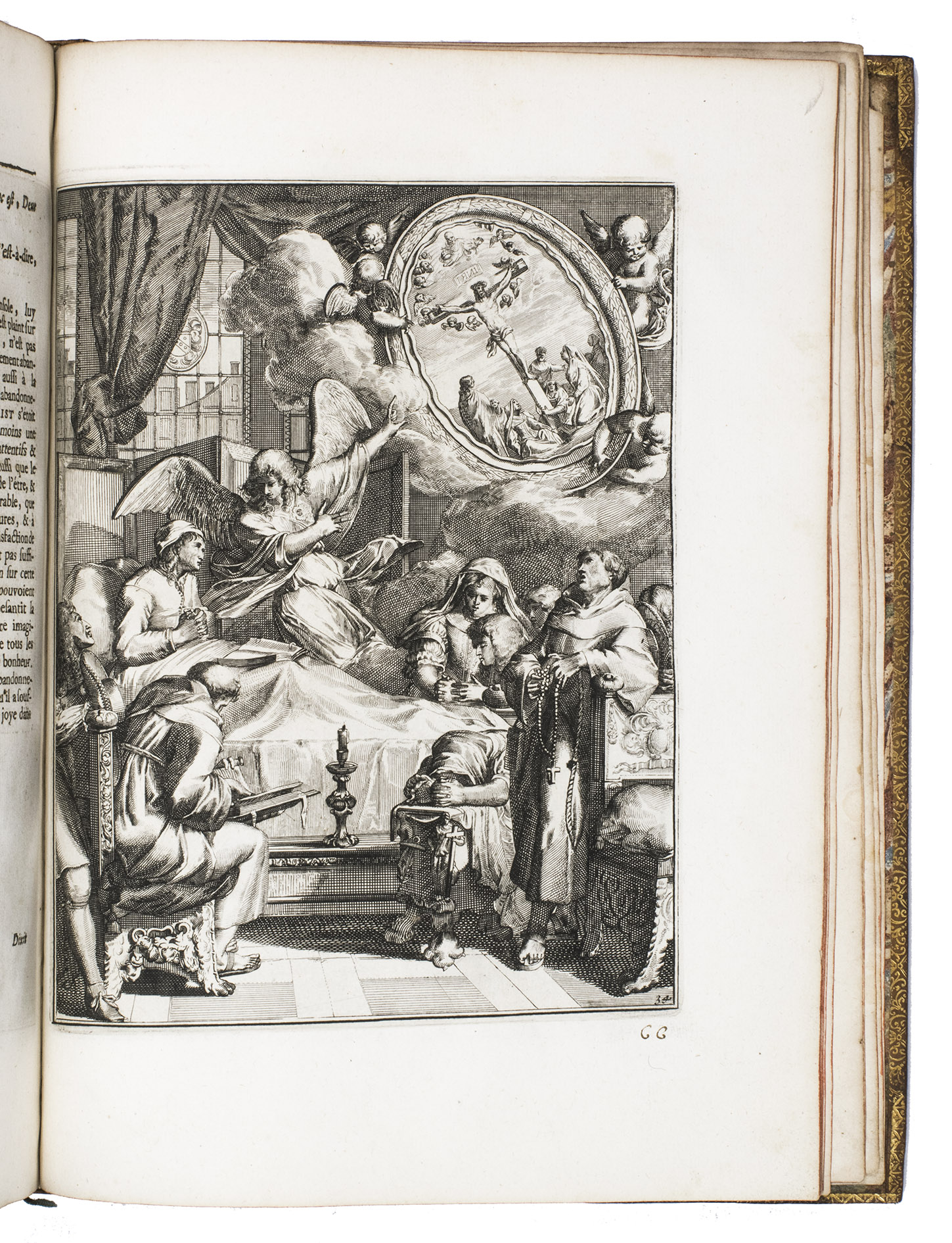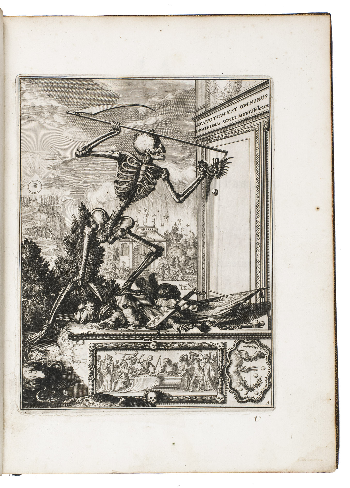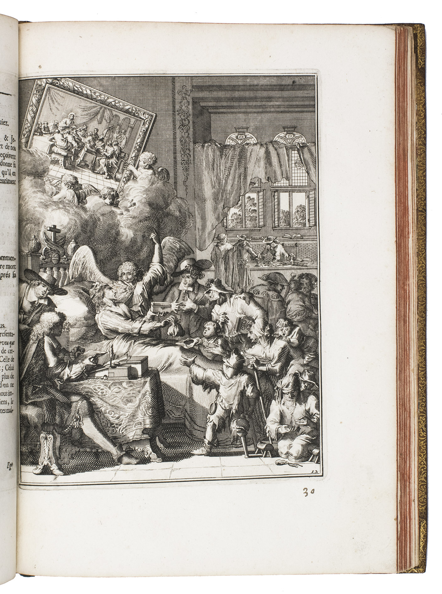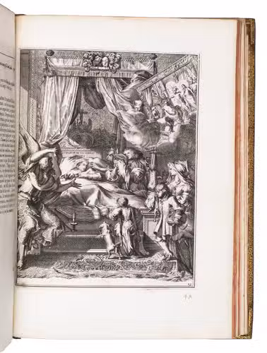 From the library of Armand-Jean de Vignerot du Plessis, 2nd Duc de Richelieu (1629-1715). The binding shows some signs of wear, some paper repairs, and some occasional minor dust soiling and water staining. Otherwise in very good condition. Chr. Coppens, Een Ars moriendi met etsen van Romeyn de Hooghe: Verhaal van een boekillustratie (Verhand. Kon. Acad. v. Wetensch., Lett. en Schone Kunsten van België; Brussels 1995); Hollstein IX, R. de Hooghe 1128 (Dutch ed. of 1694);Landwehr, Romeyn de Hooghe, 84, note; Romeyn de Hooghe, de verbeelding van de late Gouden Eeuw, ed. H. van Nierop, a.o. (2008), p. 275, no. 1700.04; cf. p. 263, no. 1673.14; STCN 108164977 (4 copies, incl. 1 incomplete); USTC 1848568, 1535292 (30 copies) ; cf. STCN 036830909 (5 copies, same work but different collation); USTC 1847975, 1535293 (6 copies, same work but different collation); for the coat of arms: Olivier 2314.