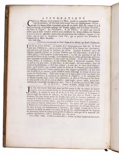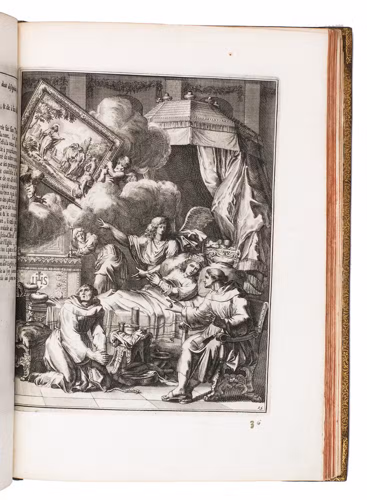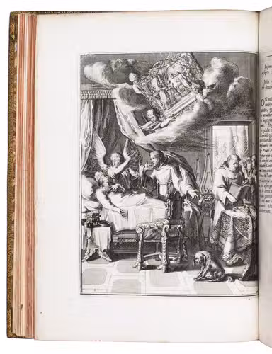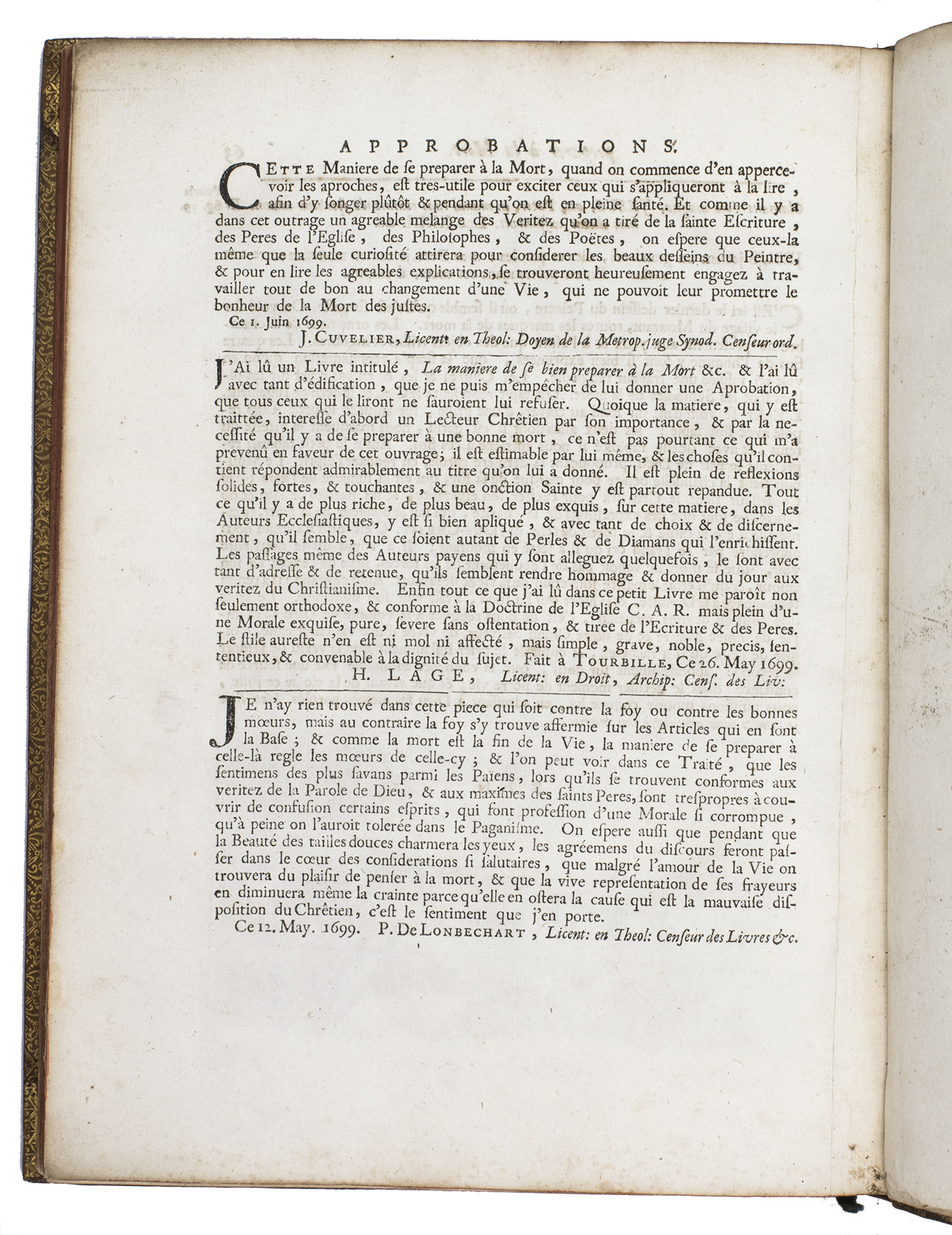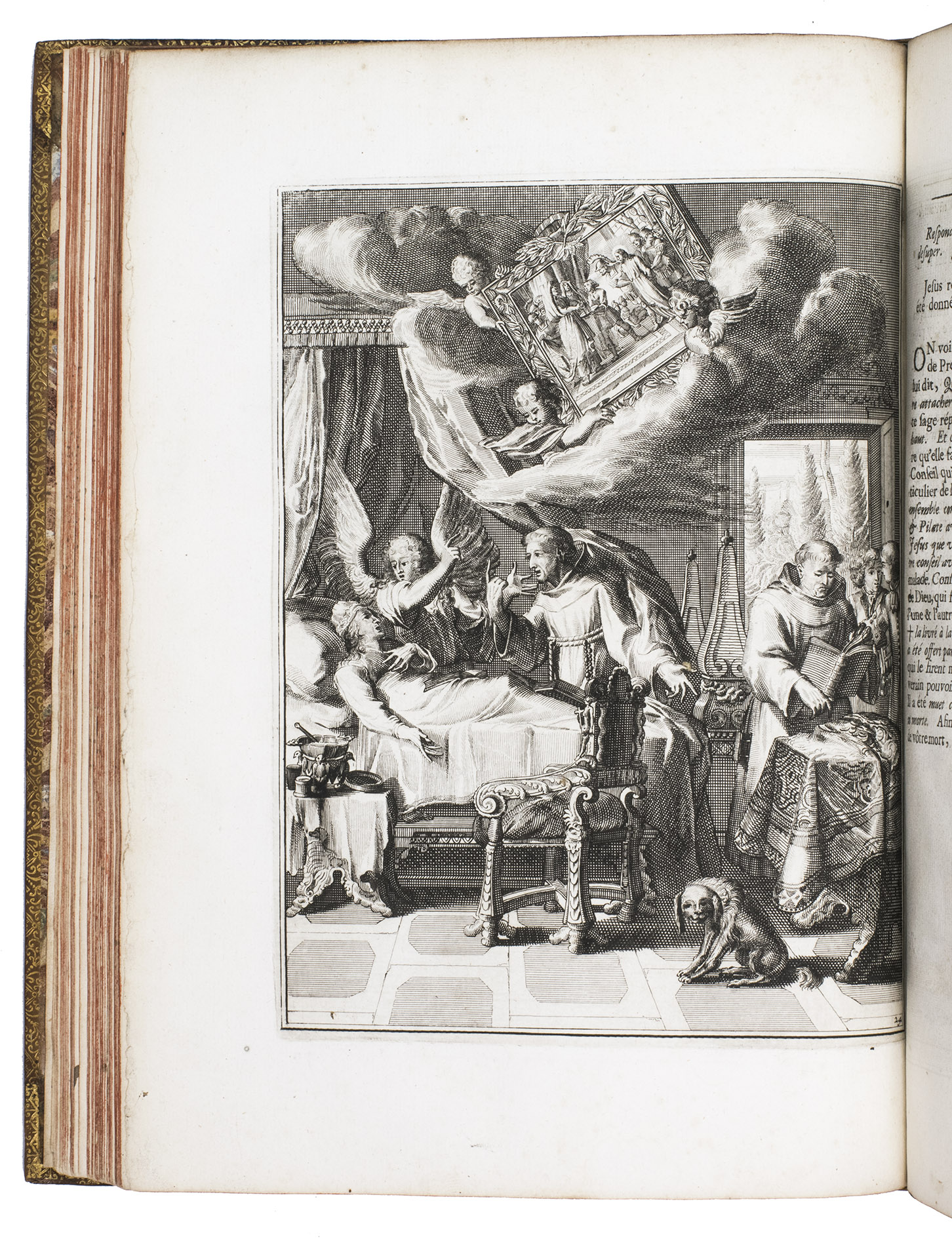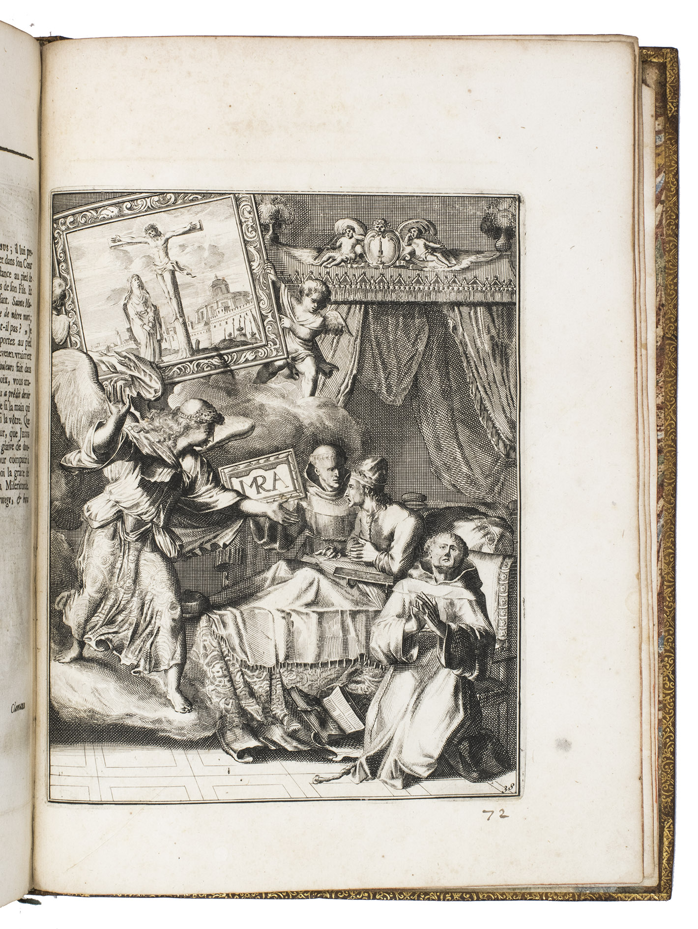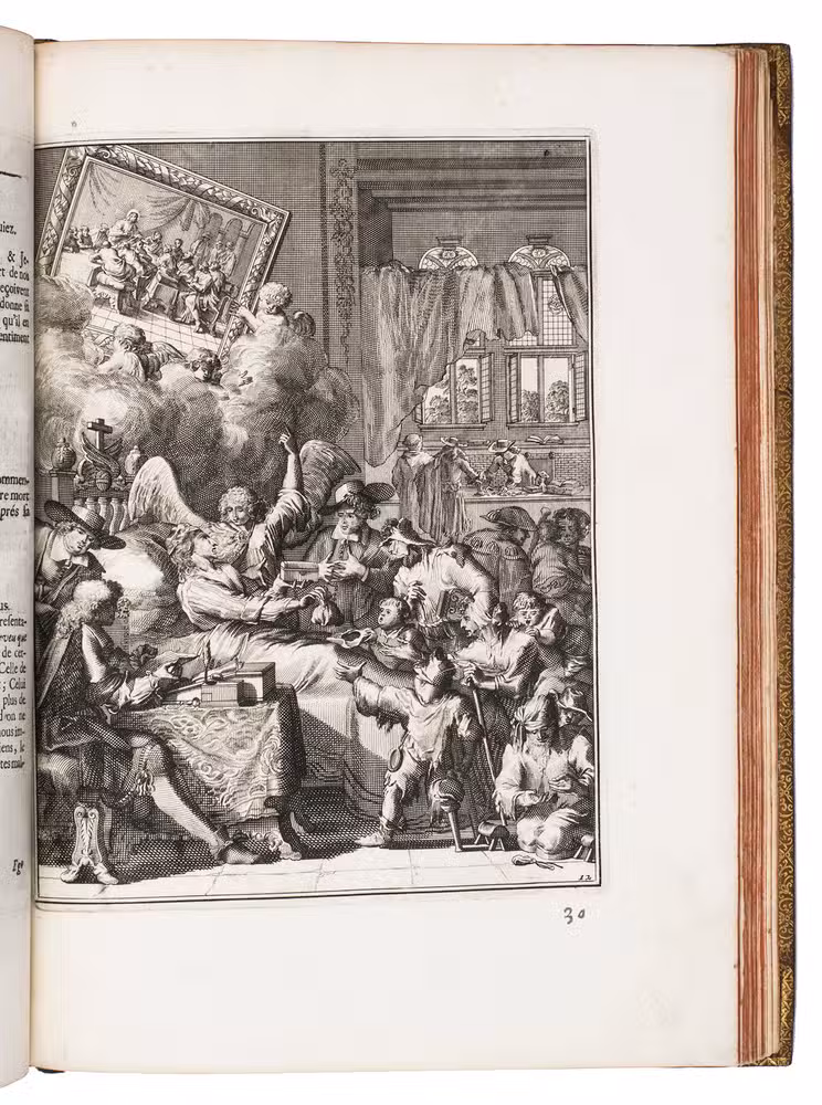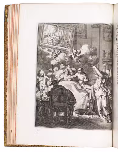 From the library of Armand-Jean de Vignerot du Plessis, 2nd Duc de Richelieu (1629-1715). The binding shows some signs of wear, some paper repairs, and some occasional minor dust soiling and water staining. Otherwise in very good condition. Chr. Coppens, Een Ars moriendi met etsen van Romeyn de Hooghe: Verhaal van een boekillustratie (Verhand. Kon. Acad. v. Wetensch., Lett. en Schone Kunsten van België; Brussels 1995); Hollstein IX, R. de Hooghe 1128 (Dutch ed. of 1694);Landwehr, Romeyn de Hooghe, 84, note; Romeyn de Hooghe, de verbeelding van de late Gouden Eeuw, ed. H. van Nierop, a.o. (2008), p. 275, no. 1700.04; cf. p. 263, no. 1673.14; STCN 108164977 (4 copies, incl. 1 incomplete); USTC 1848568, 1535292 (30 copies) ; cf. STCN 036830909 (5 copies, same work but different collation); USTC 1847975, 1535293 (6 copies, same work but different collation); for the coat of arms: Olivier 2314.