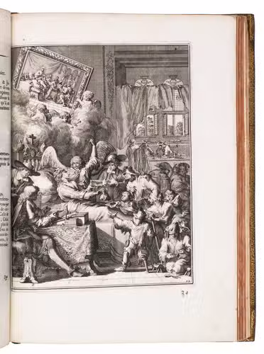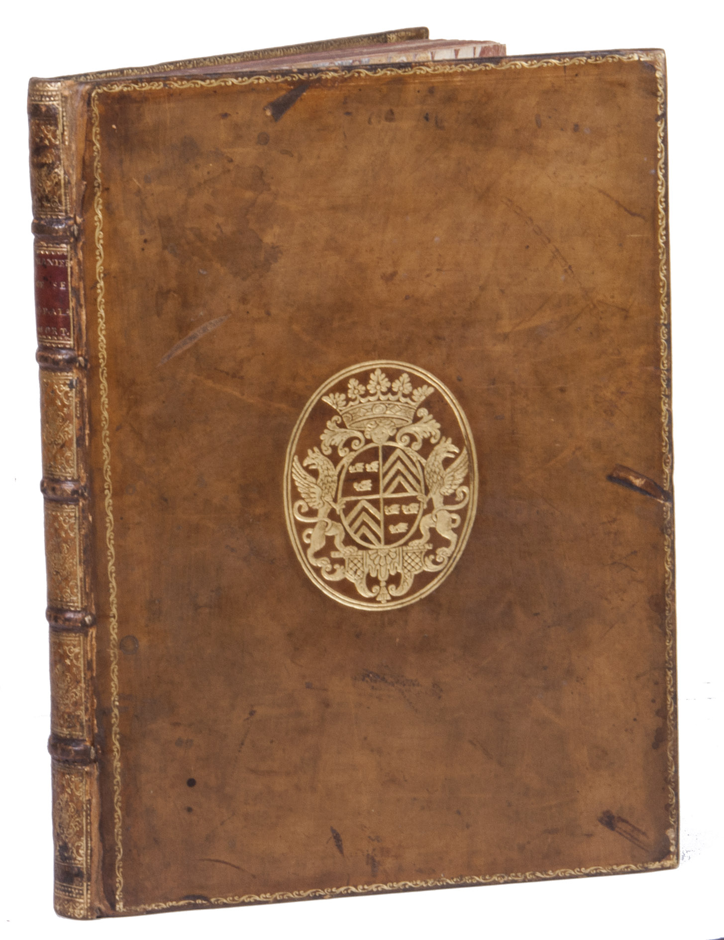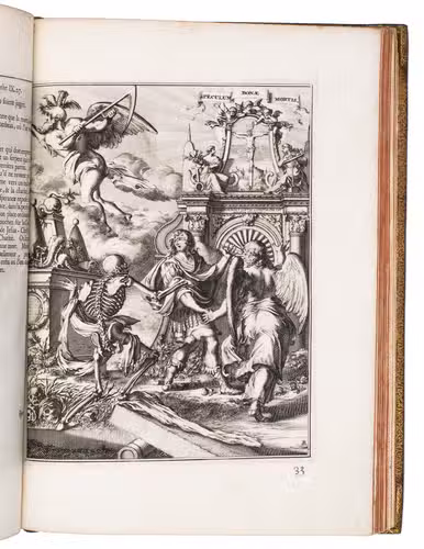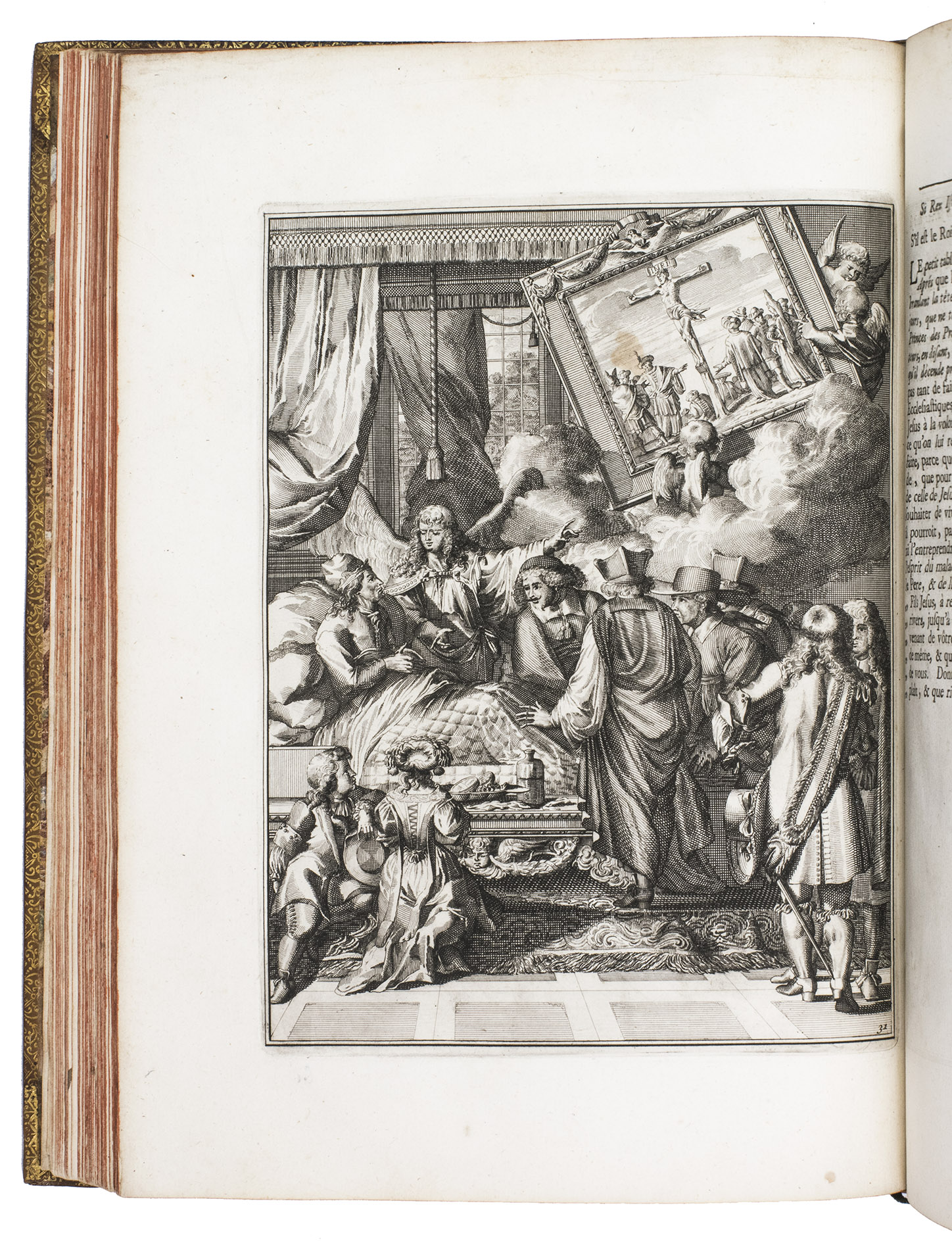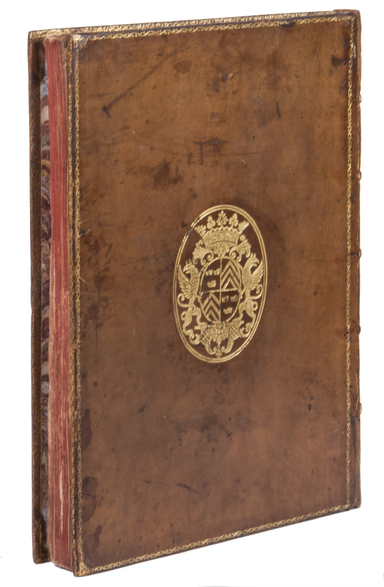 Antwerp [= Amsterdam?], George Gallet, 1700. 4to. With an engraved allegorical frontispiece ("numbered" A), mainly showing Death knocking on a door, the title page is printed in red and black, 39 numbered full-page engraved plates, and two additional full-page engraved plates ("numbered" B-C). All plates are copies (the majority in reverse) of etchings by Romeyn de Hooghe. Contemporary gold-tooled tan calf, with the coat of arms of the Vignerot du Plessis family, dukes of Richelieu, as a centrepiece on both boards, a red morocco title label lettered in gold on the richly gold-tooled spine, gold-tooled board edges and turn-ins, marbled endpapers, red edges. 63, [1] pp.