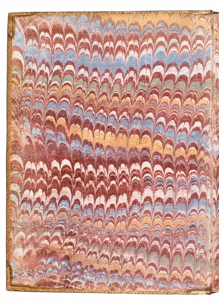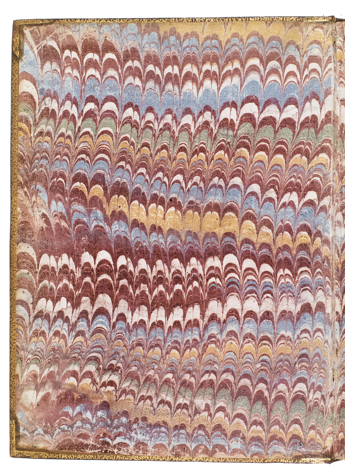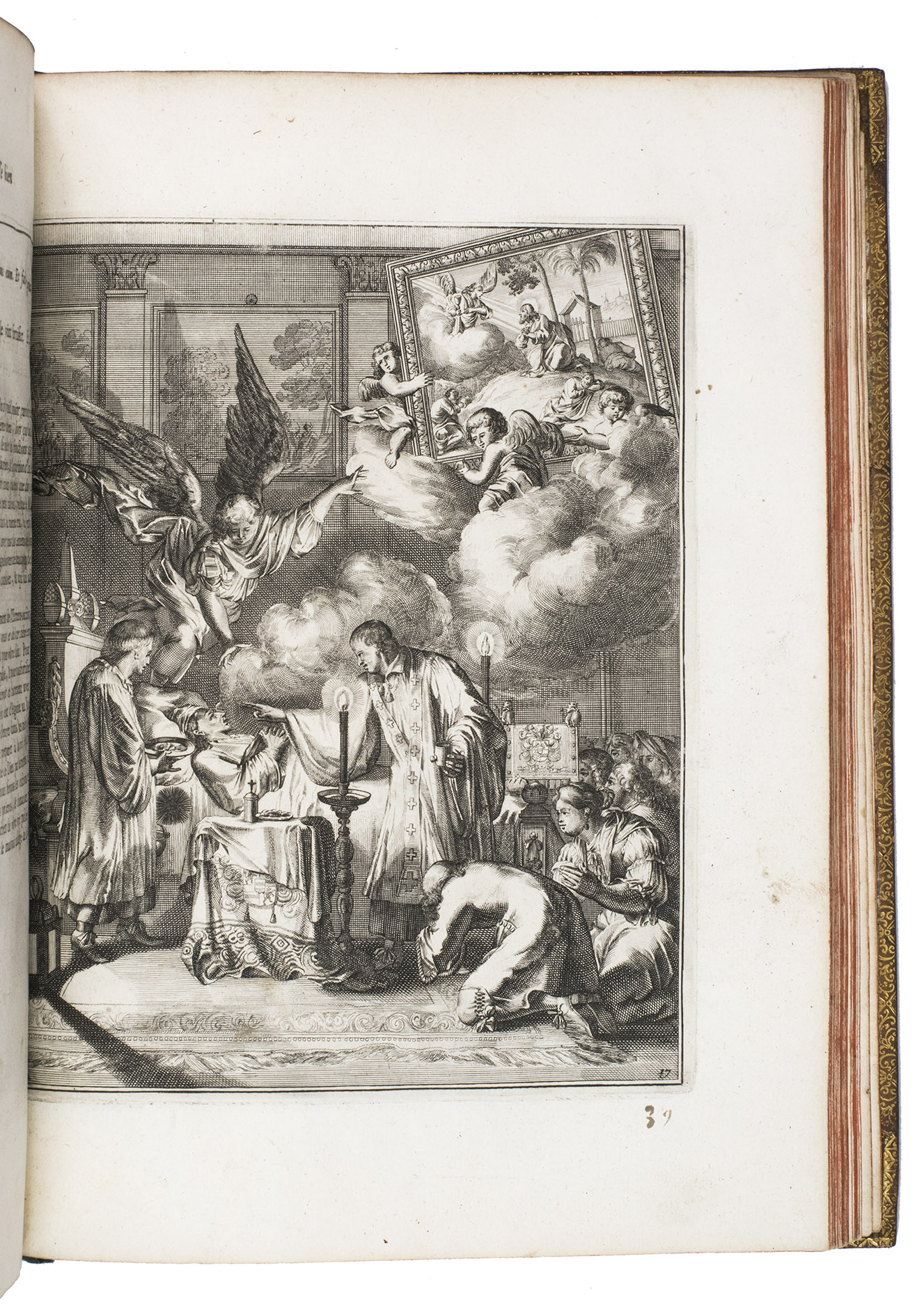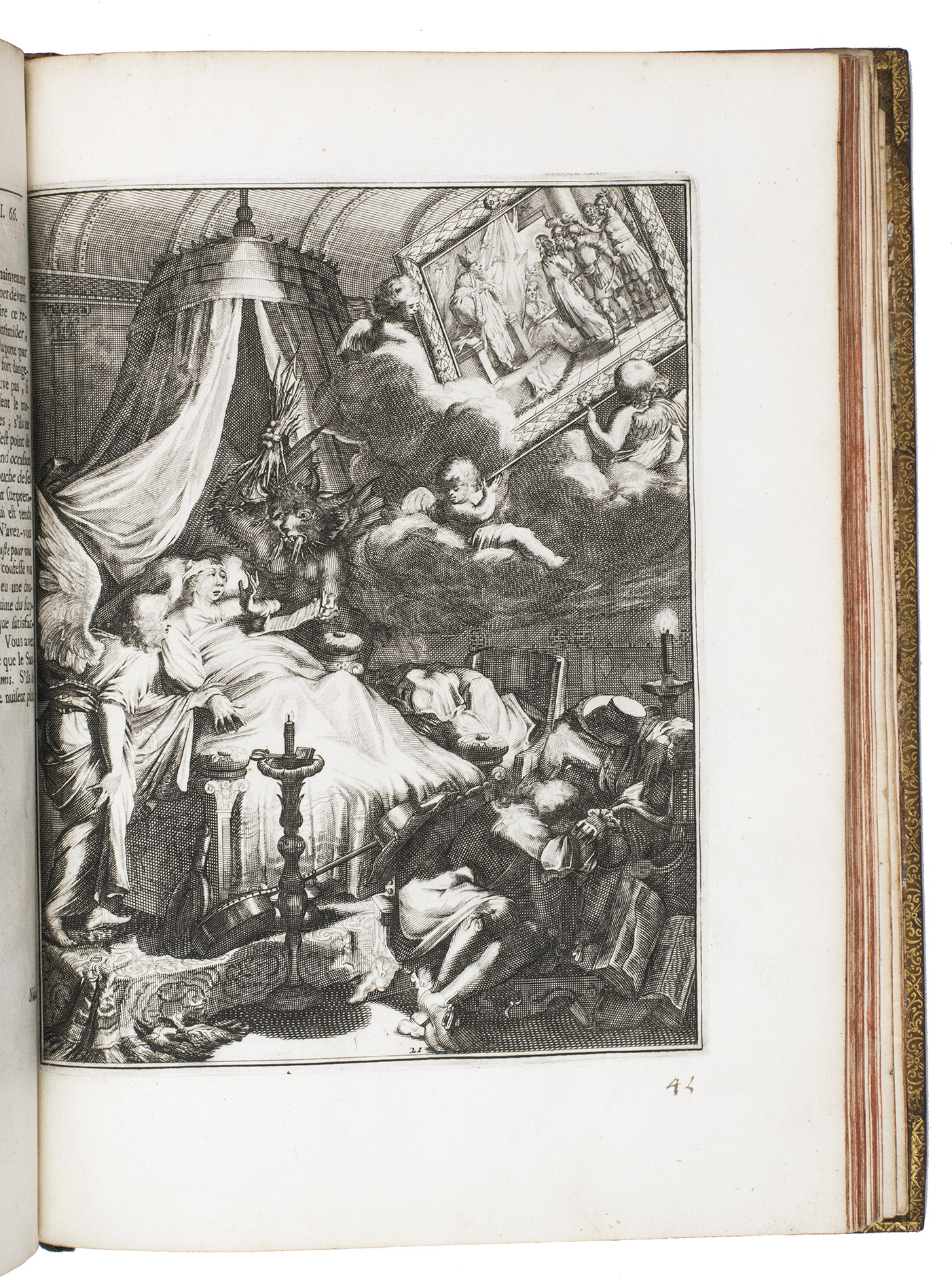 Antwerp [= Amsterdam?], George Gallet, 1700. 4to. With an engraved allegorical frontispiece ("numbered" A), mainly showing Death knocking on a door, the title page is printed in red and black, 39 numbered full-page engraved plates, and two additional full-page engraved plates ("numbered" B-C). All plates are copies (the majority in reverse) of etchings by Romeyn de Hooghe. Contemporary gold-tooled tan calf, with the coat of arms of the Vignerot du Plessis family, dukes of Richelieu, as a centrepiece on both boards, a red morocco title label lettered in gold on the richly gold-tooled spine, gold-tooled board edges and turn-ins, marbled endpapers, red edges. 63, [1] pp.