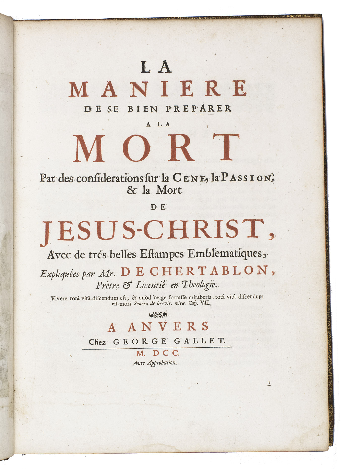 La maniere de se bien preparer a la mort, par des considerations sur la cene, la passion & la mort de Jesus-Christ, avec de très-belles estampes emblematiques, expliquées par Mr. De Chertablon.