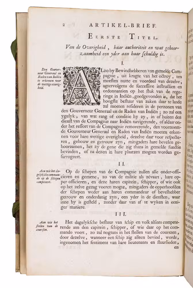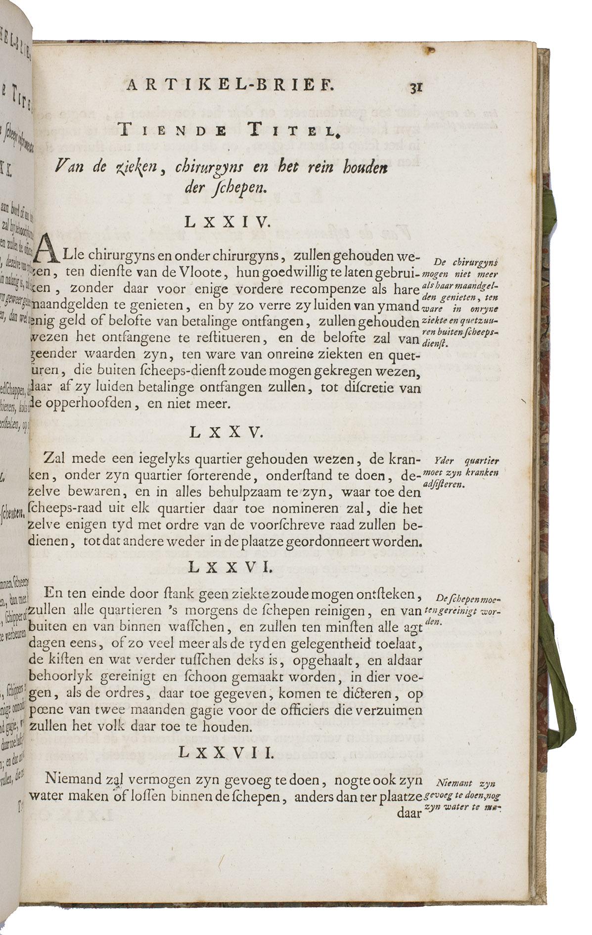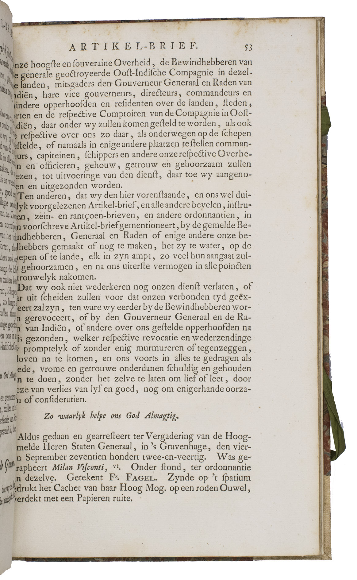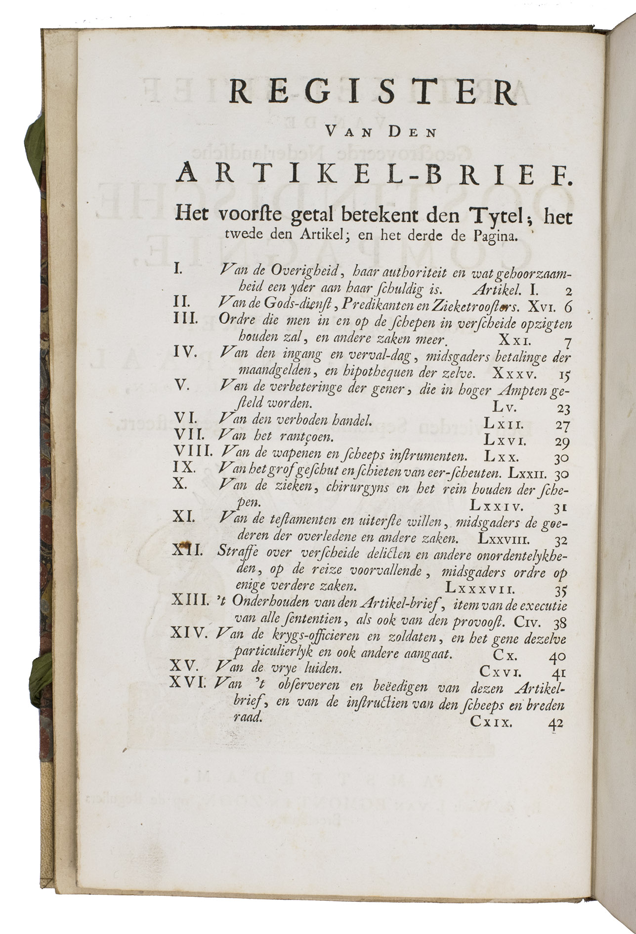 The clauses deal with everything an employee of the VOC could face during employment. They explain exactly who is in charge, how to deal with religion on board of the ships, when and how payment of wages takes place, what the VOC pays in case of injury or death, how to climb in rank, rations on the ships, the repercussions of illegal trading, and the rights of former employees. The VOC struggled with staff shortages throughout the 18th century, but the situation became especially dire from 1744 onwards. This was in part because the VOC was not known to be a good employer. The present publication can likely be seen as an attempt by the VOC to improve its image as an employer and attract more staff.