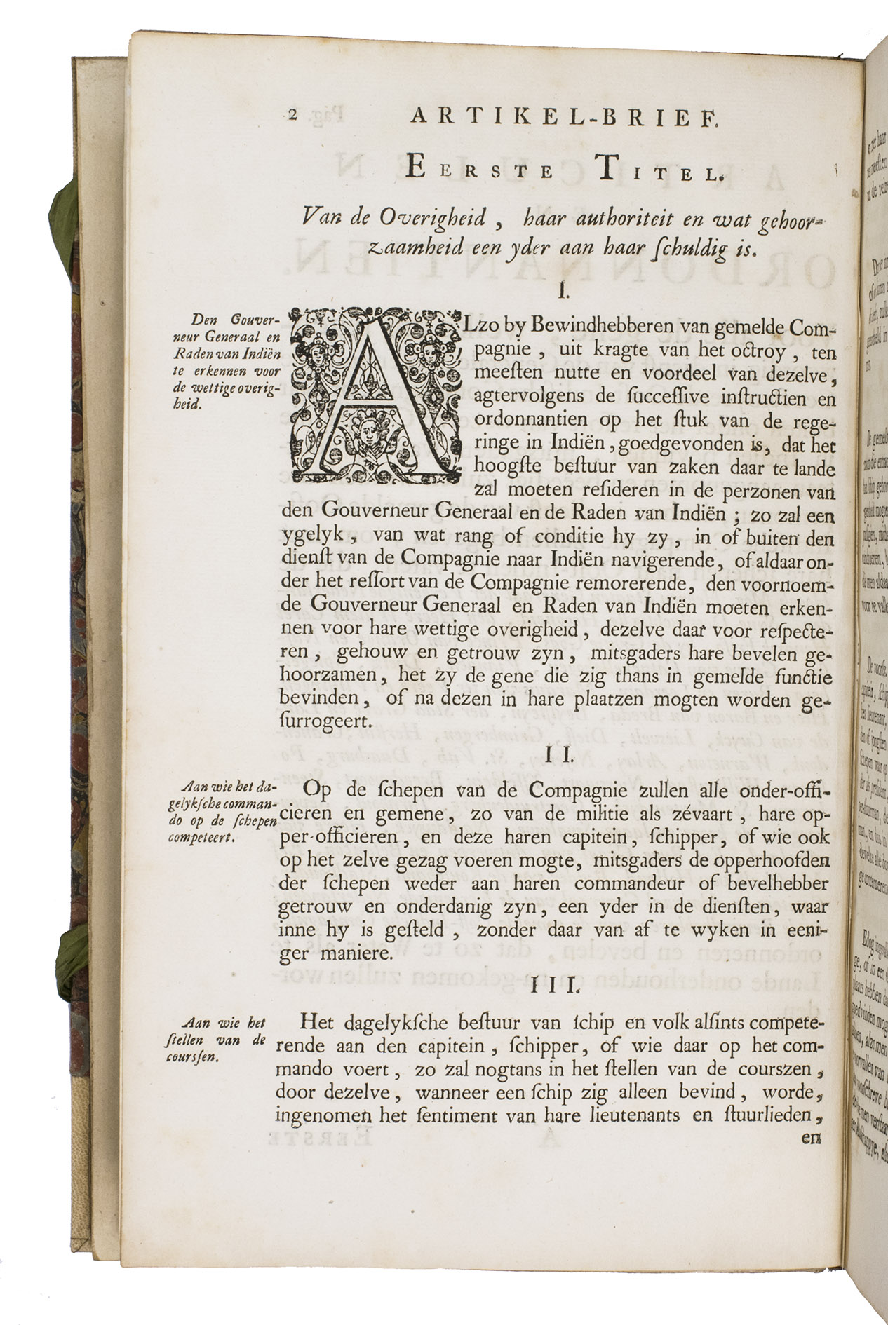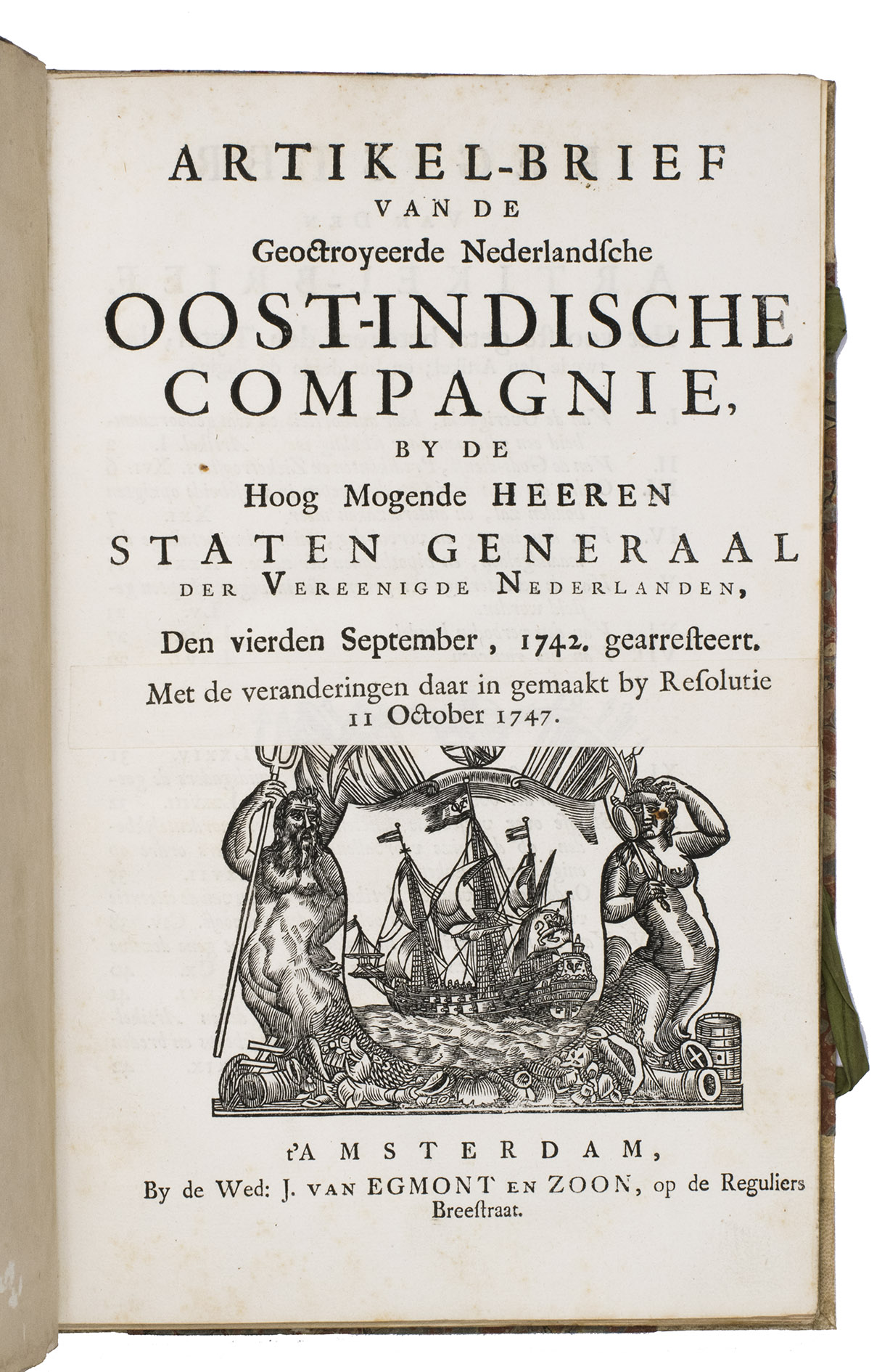 With an additional loose large square title-label added before the front flyleaf and with the blindstamp of a previous owner ("Gulden Passer - Labores et Constantia - HV") on the front and back free flyleaves. As usual, the title has been extended with a slip-cancel mounted under the title, partially covering the printers device. The edges of the boards are slightly scuffed. The front endpapers, the title page and following blank leaf have been reinforced in the gutter with paper, the endpapers are slightly browned, with a small brown stain on the title-page and first blank leaf. Overall in very good condition. Landwehr VOC, 940; STCN 17341558X (6 copies); WorldCat 48255045, 1200508712 (7 copies); cf. Schimmel, R., De VOC als werkgever. Een vergelijkend onderzoek naar de invloed van de VOC op maritieme arbeidsmarkten in Azië (master thesis), 2023.