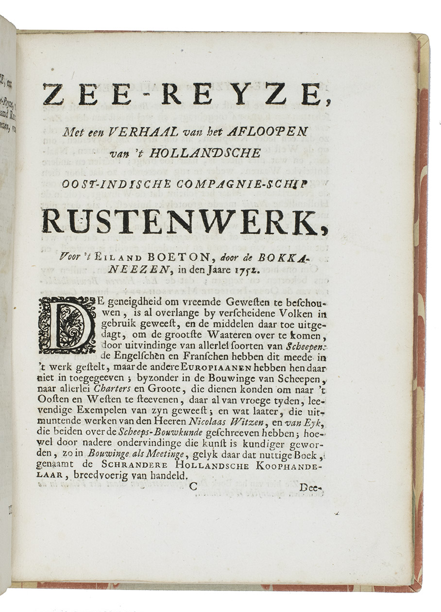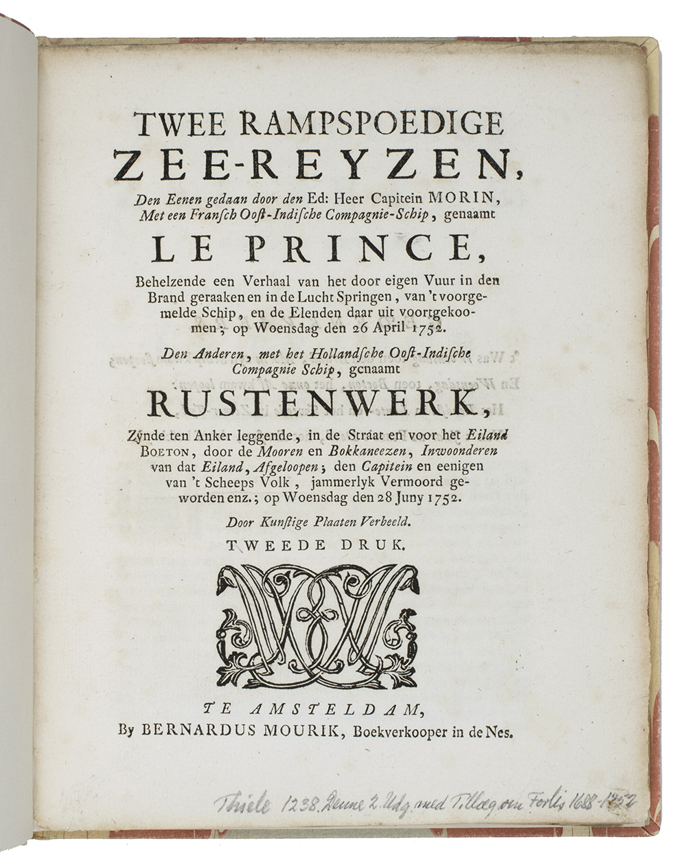 Second and rare edition of an account of two fatal voyages with two ships. The first voyage was made with the French East Indiaman Le Prince and was commanded by Captain Morin. On 19 February 1752 this ship left the port of Lorient, sailing for Pondicherry. However initially the voyage went well, on 26 April 1752 there was a fire in Le Prince. It spread fast and it also reached the gunpowder magazine. Therefore the ship exploded, as the engraving shows, and only 10 persons survived.