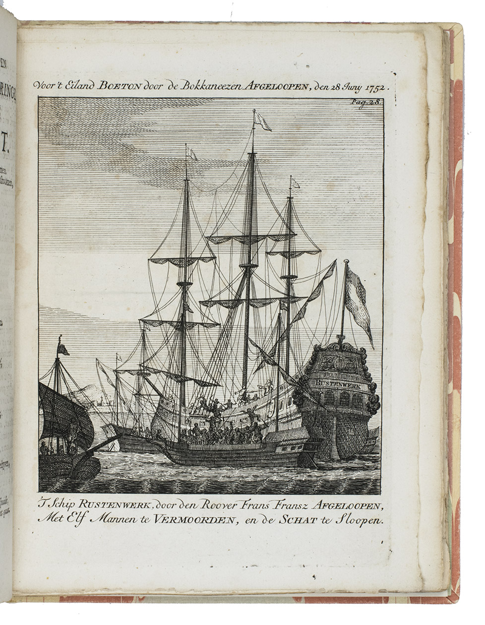 The second account concerns the seizure of the Dutch ship Rustenwerk, an East Indiaman of 650-ton. On 28 June 1752 this ship was taken by the pirate Frans Fransz after mooring of Ternate. He and his companions killed 12 people on board, which is depicted in the engraving. The survivors of this violent seizure by Frans Fransz reached Batavia and they sailed to Holland. Although the VOC succeeded in retaking the ship, Frans Fransz. Already escaped with the valuable cargo. A more historical addition to this report is the list it includes of 210 VOC ships lost in the period 1688-1752 through disasters, mutiny and piracy. These two ships are cruel examples of how East Indiamen could be defeated by fate. After this first edition, Mourik also published a second, also undated edition with the same plates.