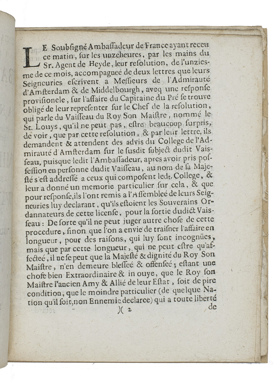 Fifth known copy of the first and only edition known to survive of one in a group of pamphlets concerning a violent conflict with the States General and the Dutch East India Company (VOC) on one side and the French King Louis XIV and his ambassador in The Hague (Jacques Auguste du Thou) on the other, concerning the Frigate St. Louis in 1660-1661.