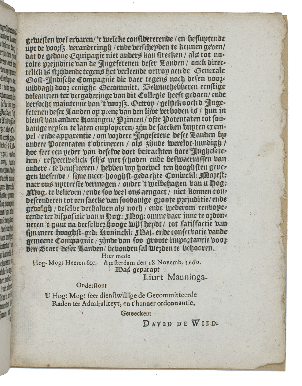 [Copy imprint:] "Naer de Copye, 1660." [1660 or shortly after]. 4to. With Du Thous complaint/request in the original French, a Dutch reaction from the admiralty and the VOCs request to the States General to reject Du Thous request. Set in roman and textura types. Modern brown wrappers with a printed label on the front wrapper. [8] pp.