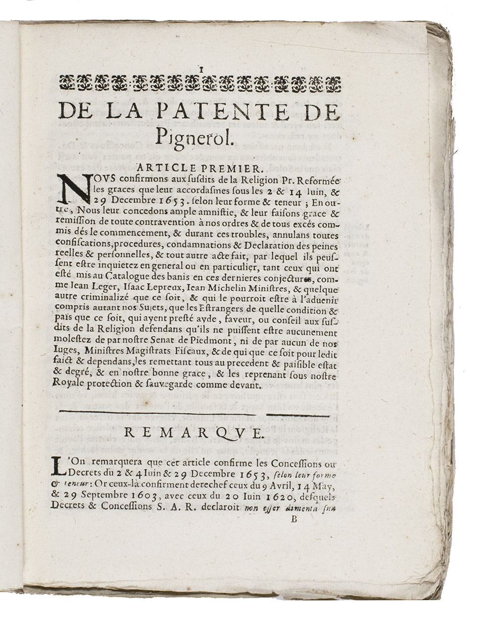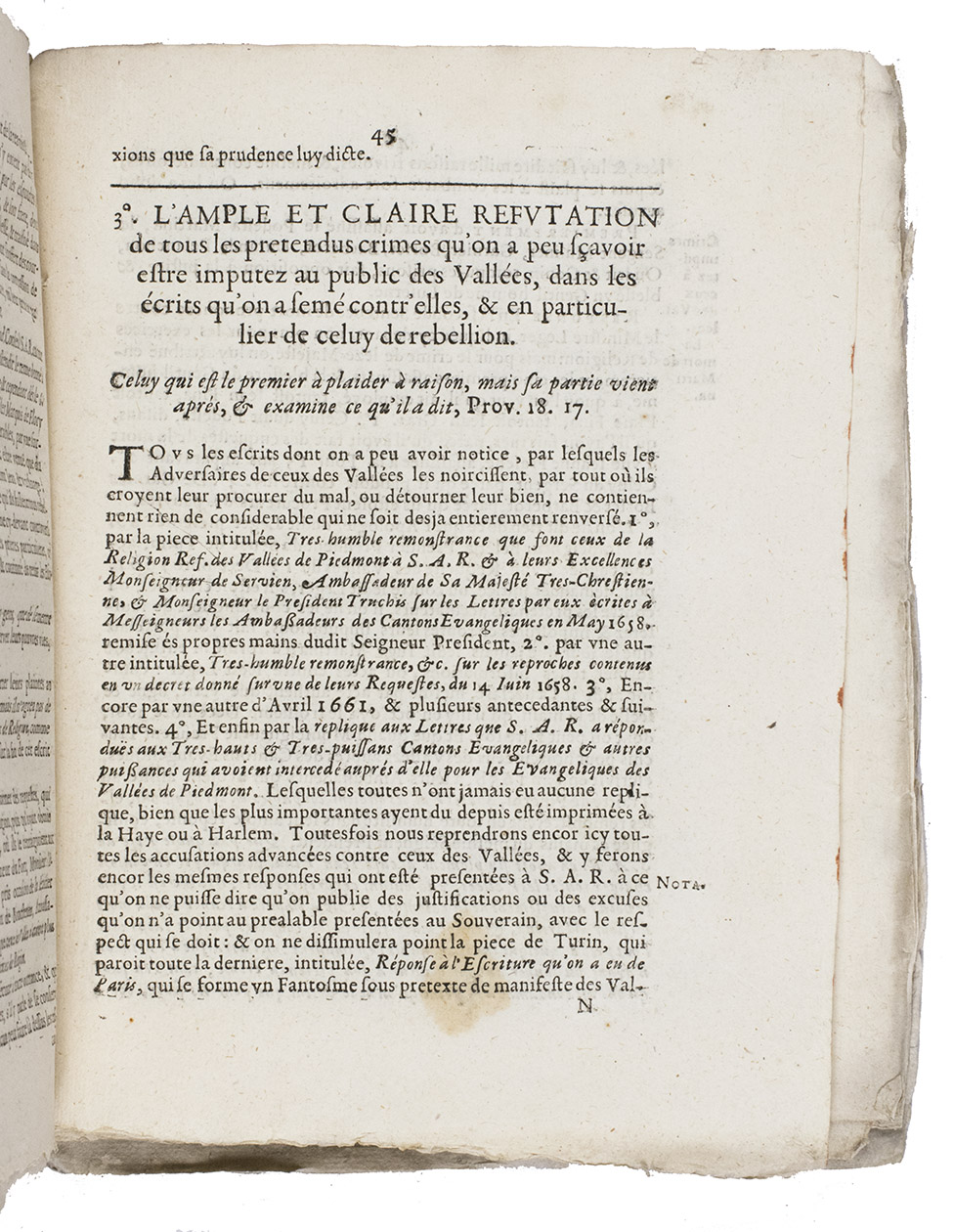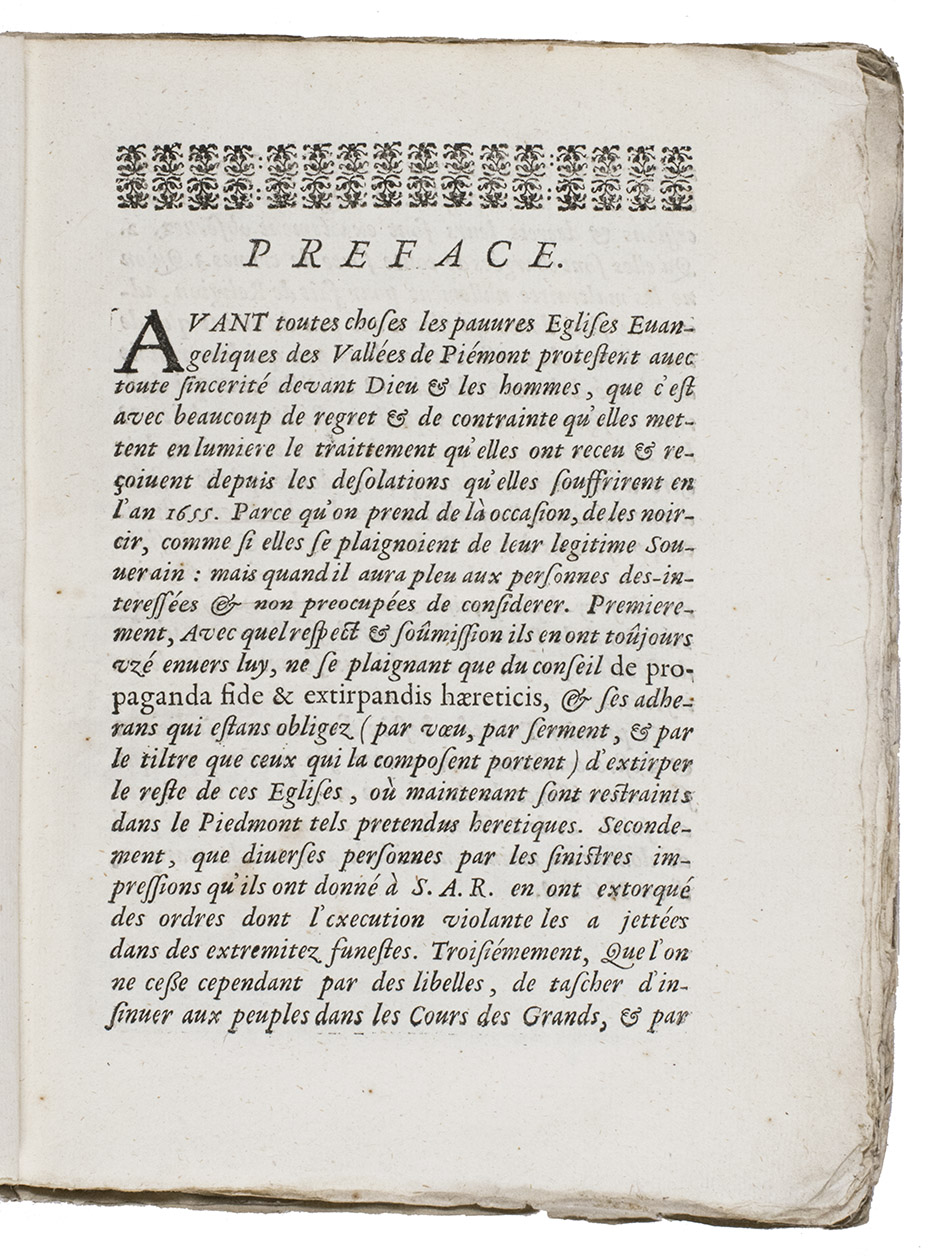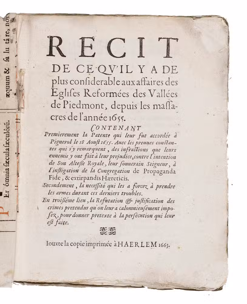 Rare copy of a pamphlet on the massacre of the Waldensians in Piedmont in 1655. It is probably a second edition as the title pages mentions: "Jouxte la copie impriméé à Haerlem 1663", though no copies from this previous Haarlem edition are known.