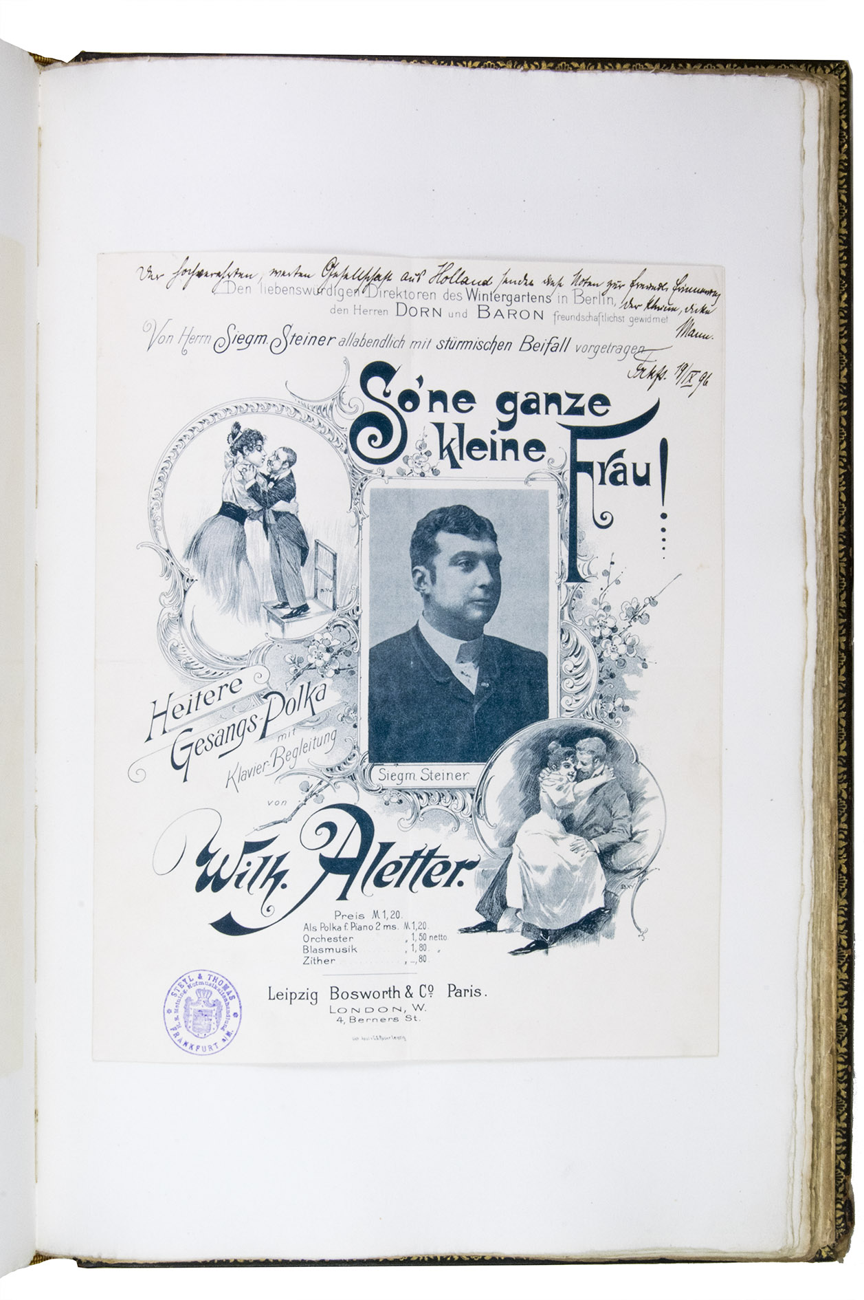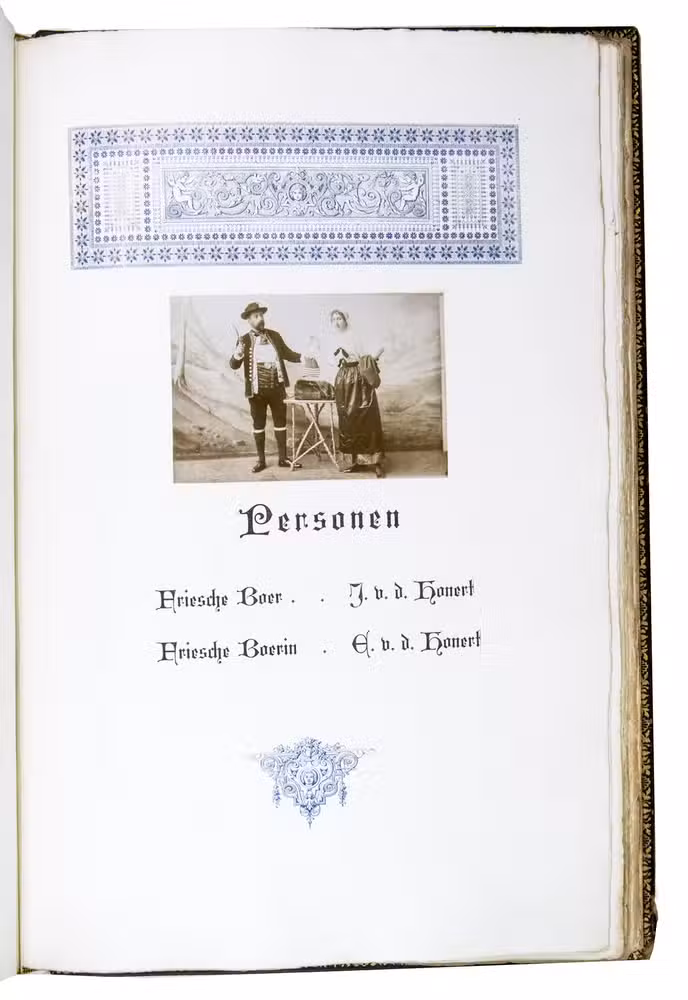 (Colophon:) Amsterdam, Calligrafie und Druck von Johan. K. Koning, [1896]. Large folio (ca. 51 x 33 cm). Wedding album comprising five manuscript texts of occasional plays (4 in German, 1 in Dutch), written in a neat cursive in blank ink on thick laid paper, each illuminated with a 4-line decorated initial in red, blue and white on a gold/bronze field, richly decorated with penwork in black ink (extending down into the inner margin). Each text is preceded by a letterpress title leaf set in neo-Gothic type, also used for the general title, several text leaves, and the colophon. Further with 1 gouache illustration on grey paper (sheet size ca. 32 x 24.5 cm, mounted on the first leaf) showing a bouquet of flowers, 14 printed ephemera relating to the "Polterabend" (wedding-eve party) and the wedding on single or double leaves in various sizes (the wedding announcement/introduction to the wedding-eve party and attached is a photo of the couple in a circular frame of red wax, 5 menu cards, the lyrics to 6 German songs, a musical score by the German composer Wilhelm Aletter (1867-1934), and an announcement of the comic opera Des Teufels Antheil by the French composer Daniel Auber (1782-1871), performed by the Frankfurter Opernhaus on 25 August 1896 in Frankfurt am Main. Also with two manuscript wedding speeches in German, written in black ink on paper, two mounted albumen prints, the first showing two actors dressed as a Frisian farmer and his wife and the other showing a man in Chinese dress, 56 large ornamental vignettes printed in red or blue throughout, 17 ornamental tailpieces printed in black, blue, and red, and some dried flowers mounted on several leaves. Contemporary gold-tooled burgundy leather, the front board with a large gold-stamped monogram as a centrepiece (the intertwined initials of the couple: AJ and EdR) with the date ("24-26 August") above and the year ("1896") below lettered in gold, both boards show a single fillet frame along the outer edges, gold-tooled turn-ins, beige watered silk endleaves. [60] ll.