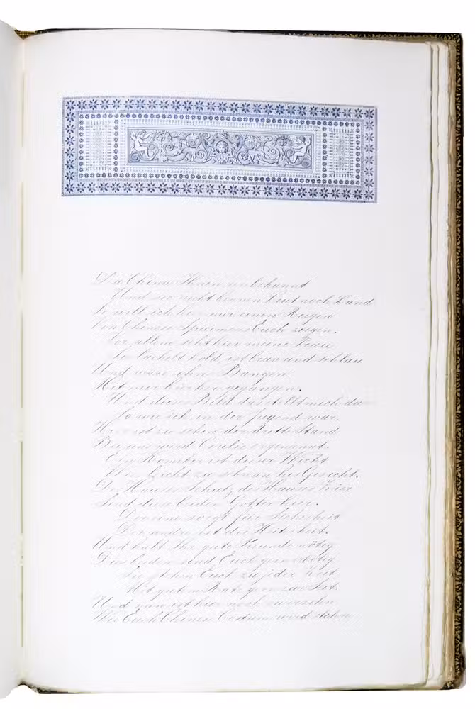 A unique wedding album of two members of prominent German-Dutch business families, written and printed in 1896 as a special single copy publication. The album was produced in Amsterdam by Johan K. Koning, who took care of the calligraphy of the texts and the printing of the (divisonal) titles, explanatory leaves and vignettes.