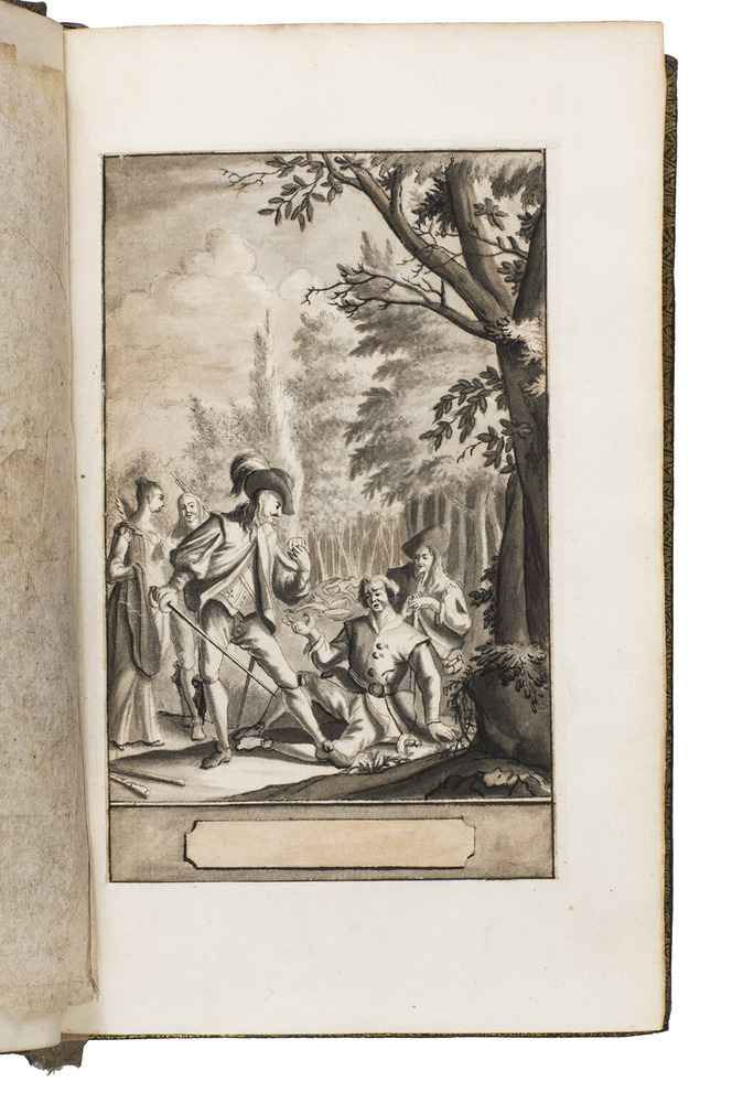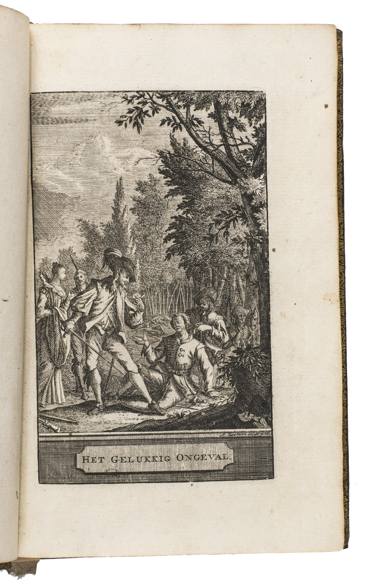 With the bookplate of Aron de Joseph de Pinto mounted on the front pastedown, and the bookplate of Six van Hillegom mounted on the verso of the first flyleaf, an erased ownership annotation on the title-page. The binding shows only very minor traces of use. The work is very lightly browned and foxed, the second drawing without a tissue paper guard. Otherwise in very good condition. Van der Aa, p. 51; Ad 1: STCN 241160138 (8 copies); Worp II, p. 141; Ad 2: Van Aken, Catalogus Nederlands toneel I, p. 455; STCN 17068279X (10 copies); Ad 3: Van Aken, Catalogus Nederlands toneel I, p. 464; STCN 180925563 (10 copies); cf. for the binding: Storm van Leeuwen, De 18e-eeuwse Haagse boekband, pp. 76-79 and 398 (stamps 23, 27, 14, 37/38; nrs. 118-22, and plate 12); Storm van Leeuwen, Dutch decorated bookbinding, IIA, pp. 110-117 (for the De Pinto bindings see pp.111-112).