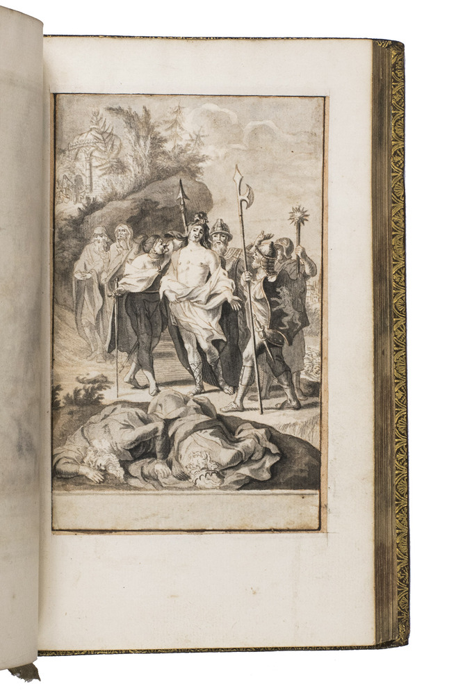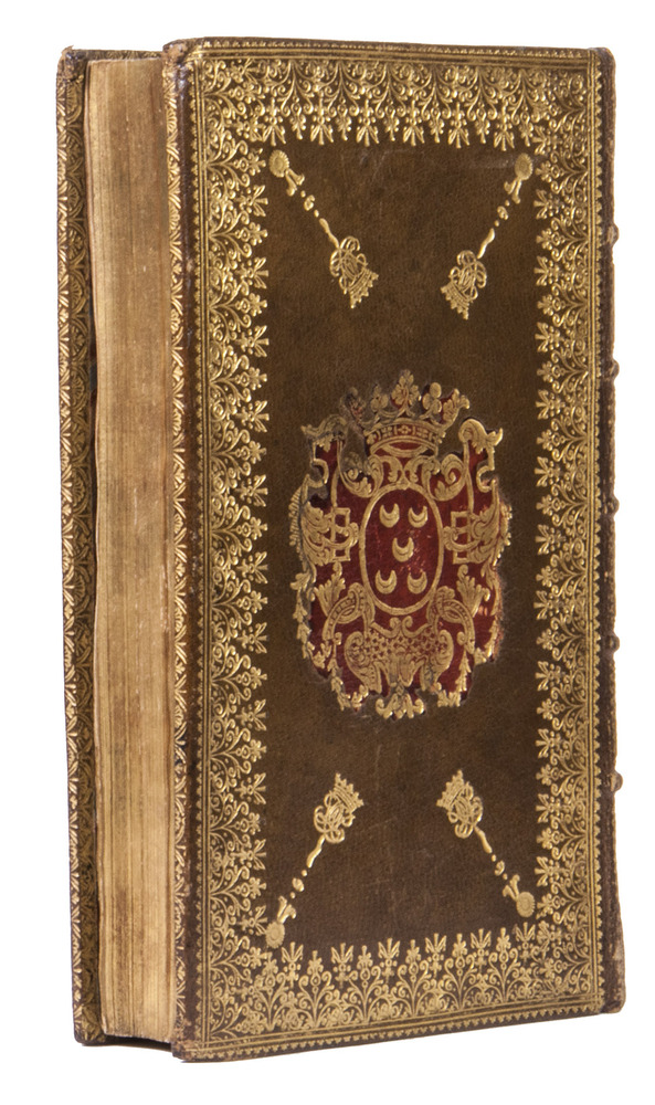 Amsterdam, Heirs of J. Lescailje and Dirk Rank, 1723. 3 works in 1 volume. 8vo. Each work with an engraved frontispiece, the original preliminary ink drawing for the frontispiece, protected by tissue paper guards, and an engraved device on the title page. Contemporary gold-tooled olive morocco, with a red morocco title label lettered in gold on the spine lettered, bound by the so-called Fleur-de-Lis Bindery (The Hague 1729-ca. 1756; Storm van Leeuwen, IIA, pp. 110-117). With the coat of arms of Aaron de Joseph de Pinto in the centre of both boards, tooled onto a red morocco inlay of the same shape, surrounded by richly ornamental borders with the crowned monogram of De Pinto (ADJP) in the corners, the same monogram repeated in 5 of the 6 compartments on the spine, gold-tooled board edges and turn-ins, gilt edges, marbled endpapers. 88; 83; 87 pp.