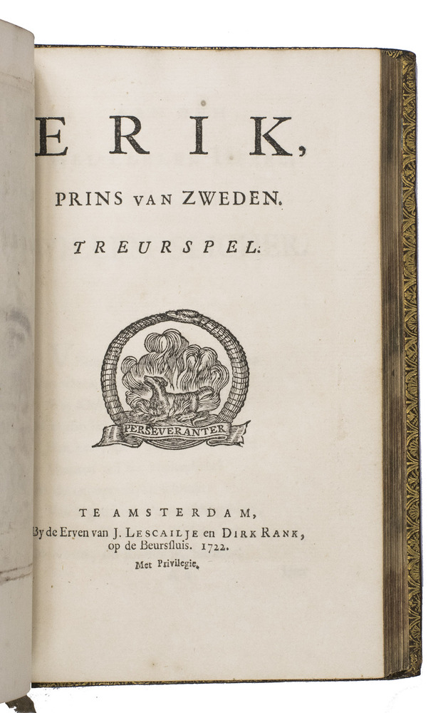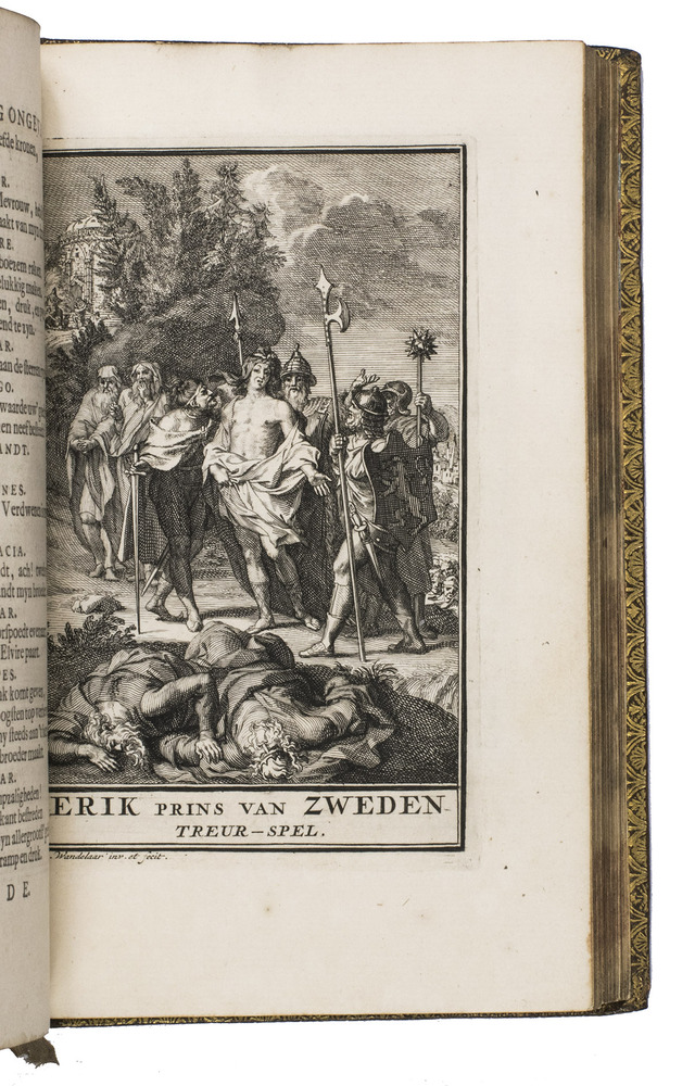 Beautiful copy of the first and only editions of three plays written for the Amsterdam Theatre, bound with the original preliminary drawings for the frontispieces. The first is by Abraham Zeeman (1695-1754), the second by Jan Wandelaar (1690-1759), and the third is not signed. The three tragedies, which are the only plays written by George Wetstein (dates unknown), rank among the better Dutch plays from the beginning of the eighteenth century, and were commissioned by the board of the Amsterdam Orphanage and Old men's home, which was also the board of the Amsterdam Theatre.