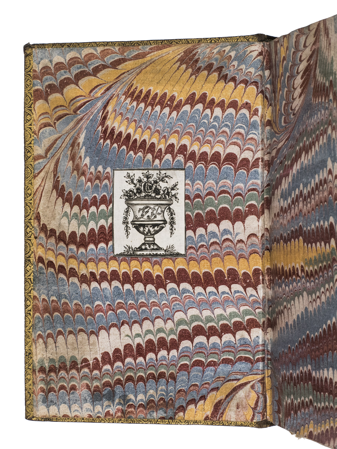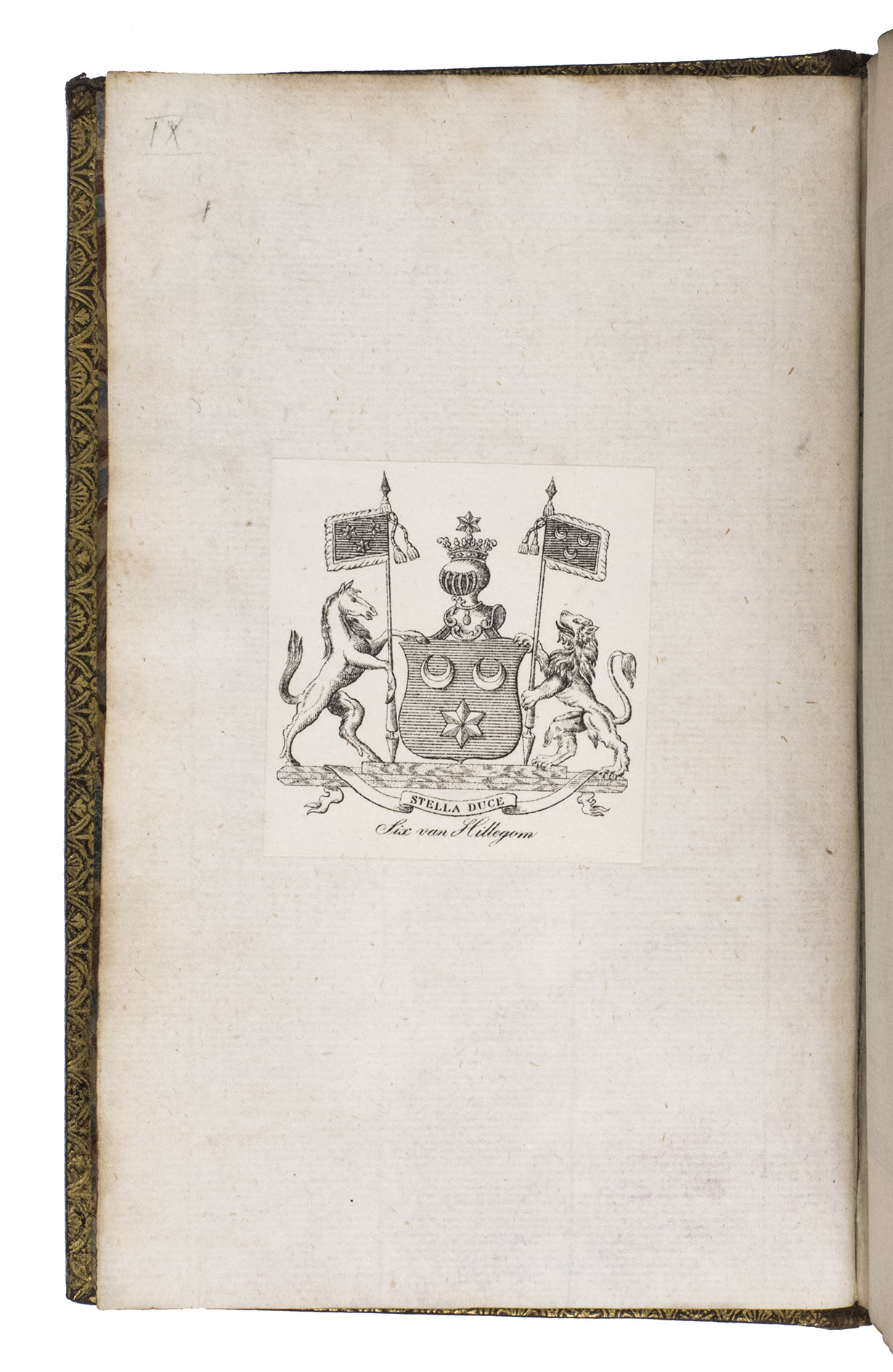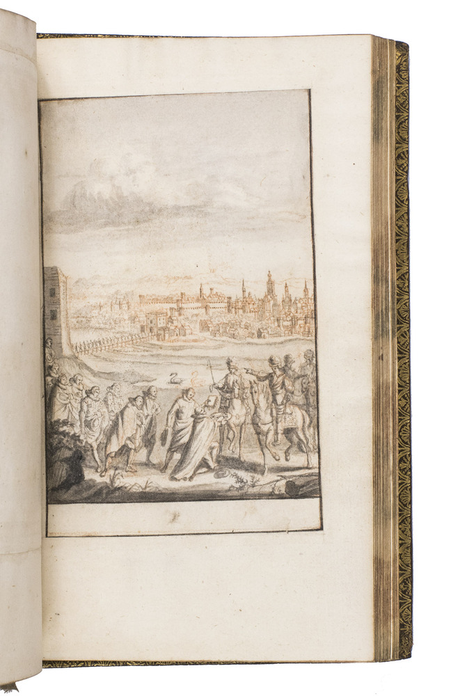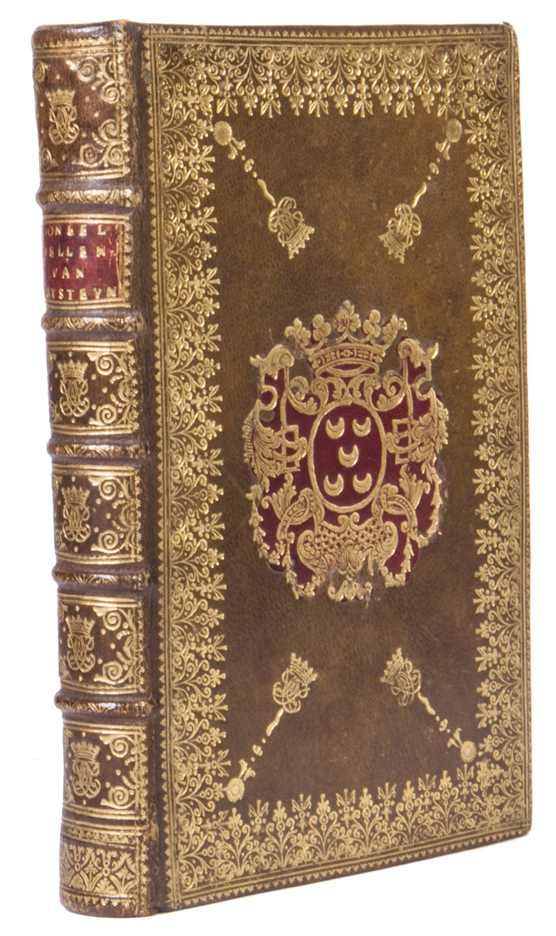 The present copy has been luxuriously bound for the wealthy Amsterdam merchant Aaron de Joseph de Pinto (1710-1758), who was of Portuguese Jewish origin. He was a bibliophile and book collector who often commissioned binderies to make bindings for his library. These bindings are typically richly gold-tooled, adorned with his coat-of-arms and crowned monogram "ADJP". The present work is extra luxurious because of the addition of the drawings. De Pinto mainly worked with an Amsterdam binder, who made several bindings for him in the years 1743-1765, and the so-called "Heraldische Lelie-binderij" (or Fleur-de-Lis Bindery) at The Hague during the years around 1735-40. The present copy was bound by the latter, as we have been able to identify four stamps and a roll from this bindery on the boards. The present binding also includes stamp B of the three known stamps with the coat-of-arms of De Pinto, here tooled onto a red morocco inlay, and his crowned monogram on the spine and boards.