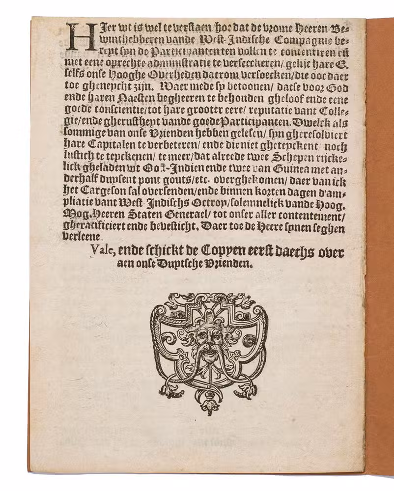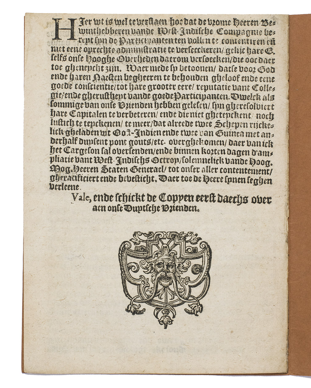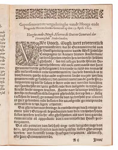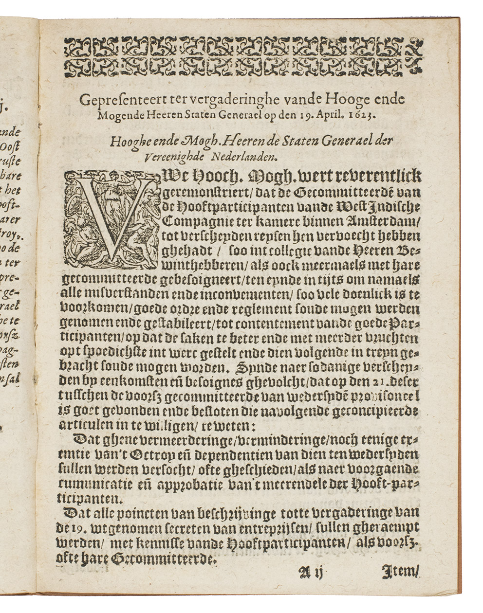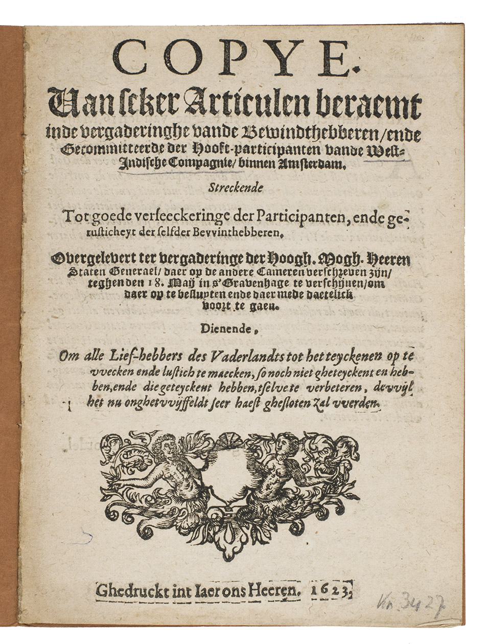 Fifth copy located of the first and only edition of an account of some additions made in 1623 to the 1621 charter of the Dutch West India Company (WIC), presented to encourage potential shareholders to join in the venture. In particular, it presents the suggestions made by the major shareholders who negotiated to convince the States General to make the additions. Facing the opening of the main text is a letter from the Hague, dated 16 May [1623] and referring to two publications (or two texts in a single publication) that had appeared in March: an expanded charter of the Dutch East India Company (VOC) and a discourse inviting the shareholders of the VOC to also take shares in the WIC. It also refers to related meetings that are to be held on 1 and 18 July [1623]. It must therefore have been published around June 1623, about six months before the WICs fleet set off on its first major expedition, which led to the short-lived capture of Bahia in Brazil in 1624.