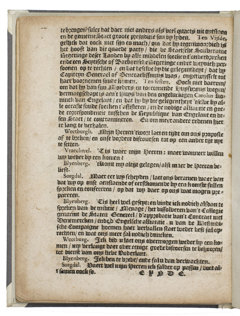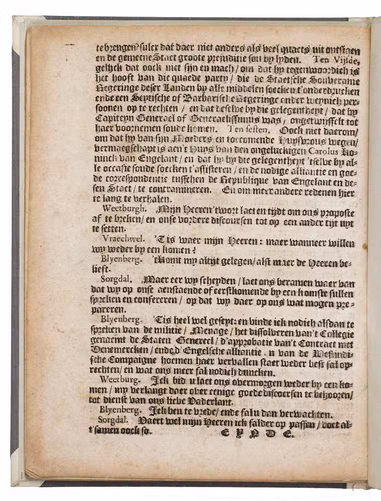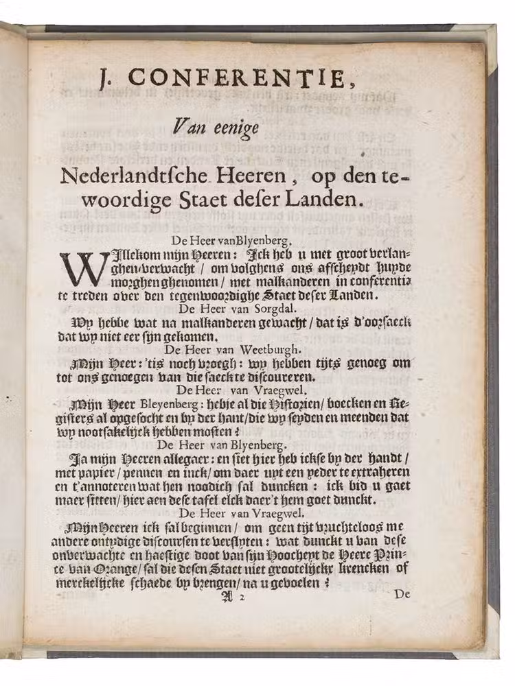 An anonymous political tract in the form of a conversation between four fictional gentlemen (Van Blyenberg, Van Sorgdal, Van Vraegwel, Van Weetburgh), whose names suggest happiness, concern, questioning and knowing respectively. It begins with a reference to the "onverwachte en haestige" (unexpected and sudden) death of the Prince of Orange, meaning Willem II, Prince of Orange and Count of Nassau, stadtholder of the Dutch Republic from 1647 to his death from the plague on 6 November 1650 at the age of twenty-four. In 1649, Admiral Witte de With, commander of the Dutch West India Companys (WICs) fleet fighting the Portuguese in Brazil, came into dispute with the WIC and returned to the Netherlands against orders, arriving in April 1650. Stadtholder Willem II and the States General supported the WIC against De With and sentenced him to death.