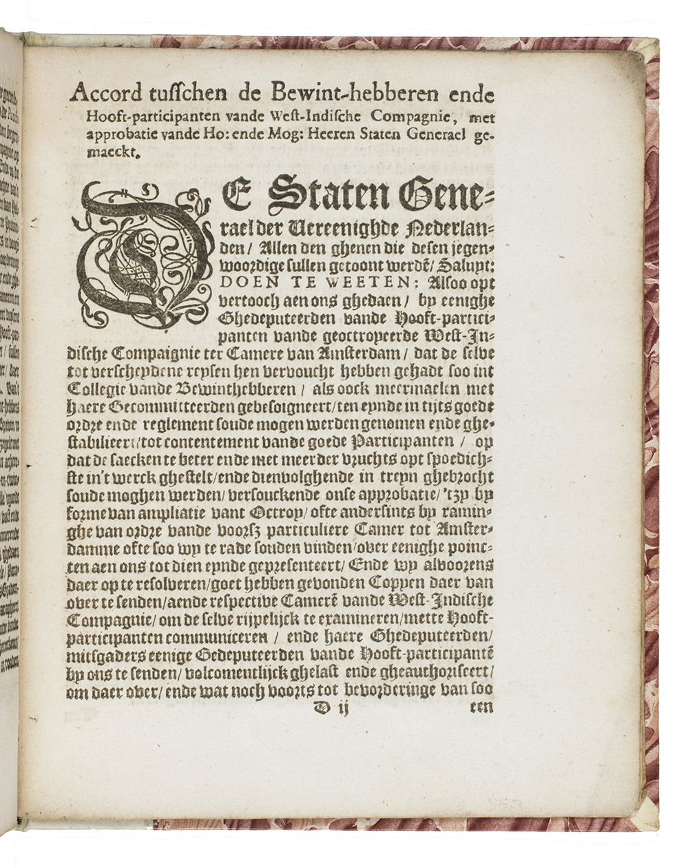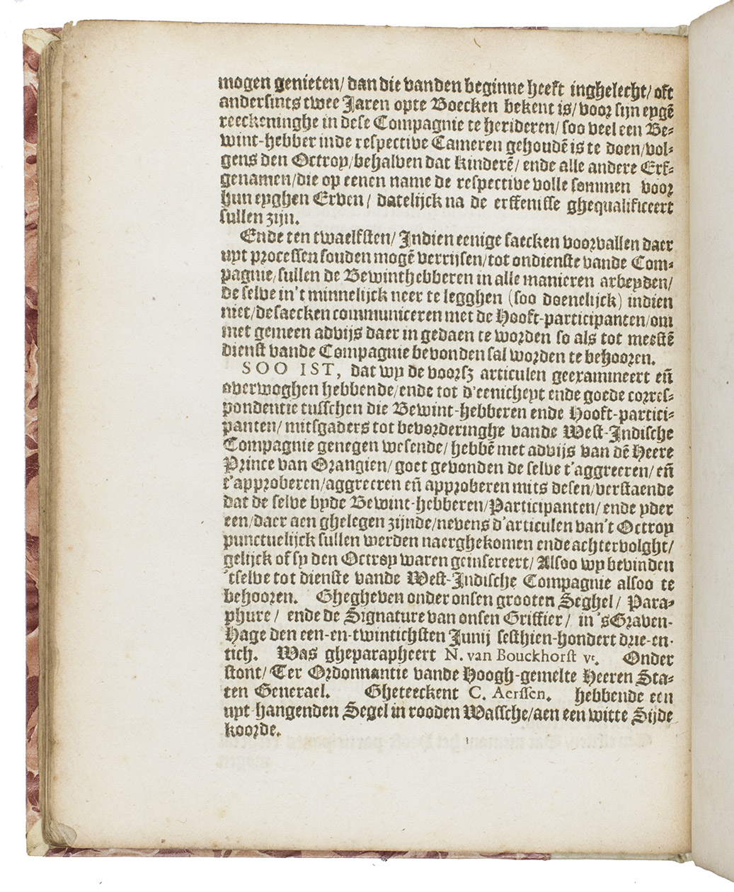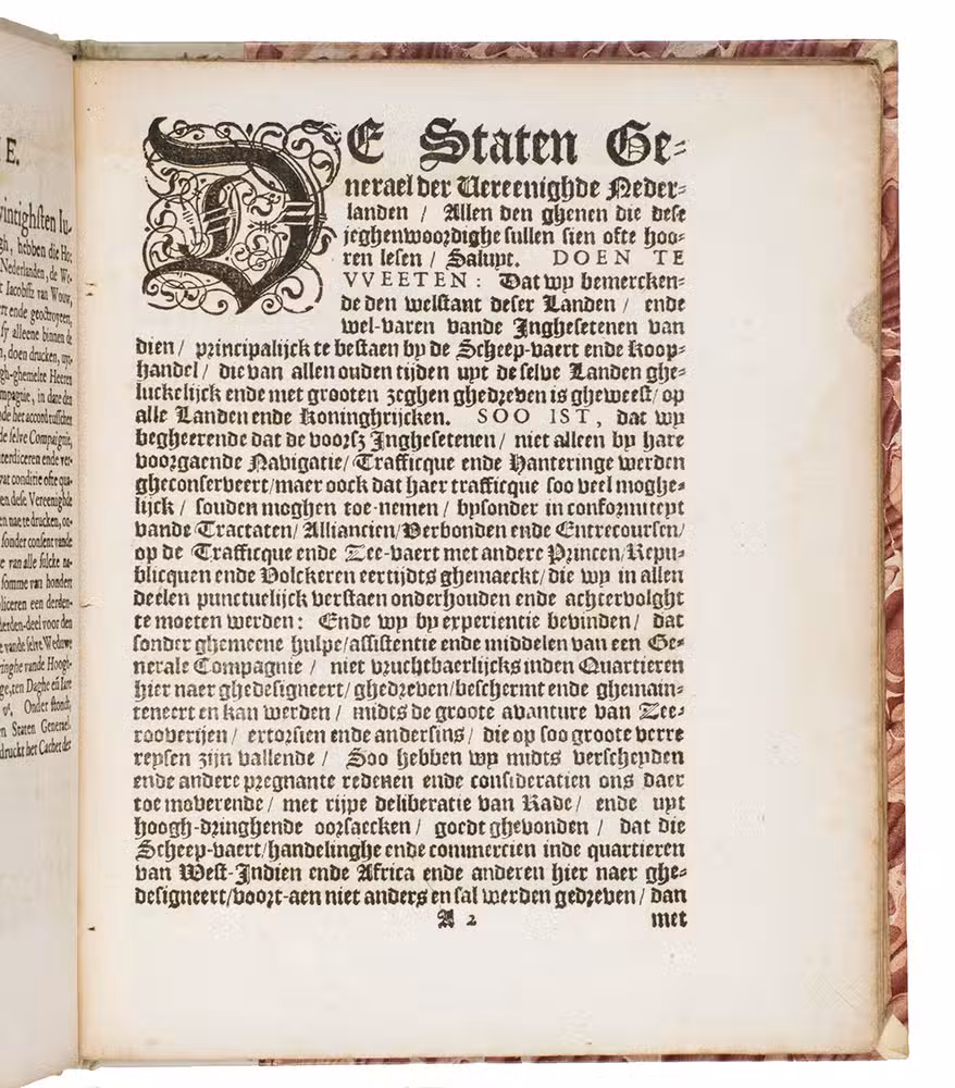 Book and binding in very good condition, with only a couple small marginal stains and with generous margins, the binding therefore proving a nice showing of the unusual marbled paper. Second edition (with important additions) of the 1621 charter of the Dutch West India Company, published only months before the Companys short-lived conquest of Bahia in Brazil. Alden & Landis 623/88 (6 copies); Asher 55; Borba de Moraes p. 624; JCB II, p. 179; Knuttel 3424; Sabin 56666; STCN 852473486 (9 copies including both Knuttel 3424 and 3425); Tiele/Muller 1983; Wulp 1885; cf. Petit 1405 (French ed.); Rodrigues 1794 (as Knuttel 3425 but erroneously described as an 8vo); Van Sommeren 597 (1637 ed.); Zijlstra 1003 (1642 ed.); not in Bosch; Broekema; Eberstadt; Rogge; Streeter.