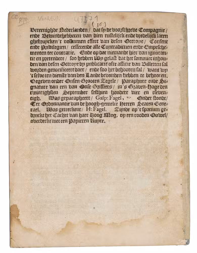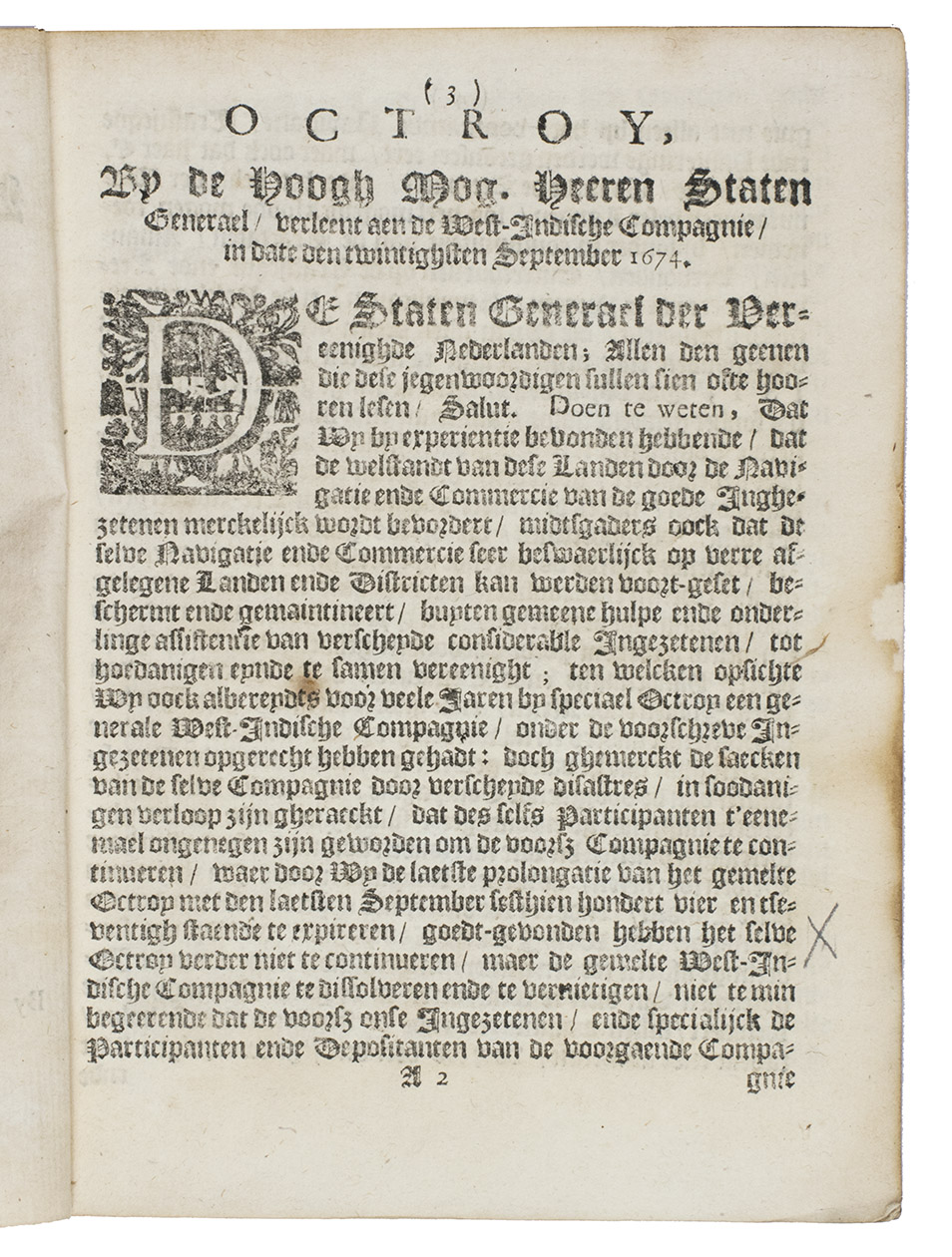 The rarer of two nearly identical 1674 editions of the charter of the Dutch West India Company (WIC) in 45 numbered articles. When the Dutch lost Brazil to Portugal in 1654 and their North American colonies, known as New Netherland, to England in 1664, it dealt a severe blow to the WIC, which went bankrupt in 1674 and was reorganised with the present new charter in that year. It still gives them a theoretical monopoly on trade in parts of Africa and the West Indies (the slave trade between them continued), noting in particular Saint Thomas, Principe, Curaçao, Aruba, Bonaire and other islands, as well as the Pomeroon and Essequibo colonies in and around todays Guyana.
