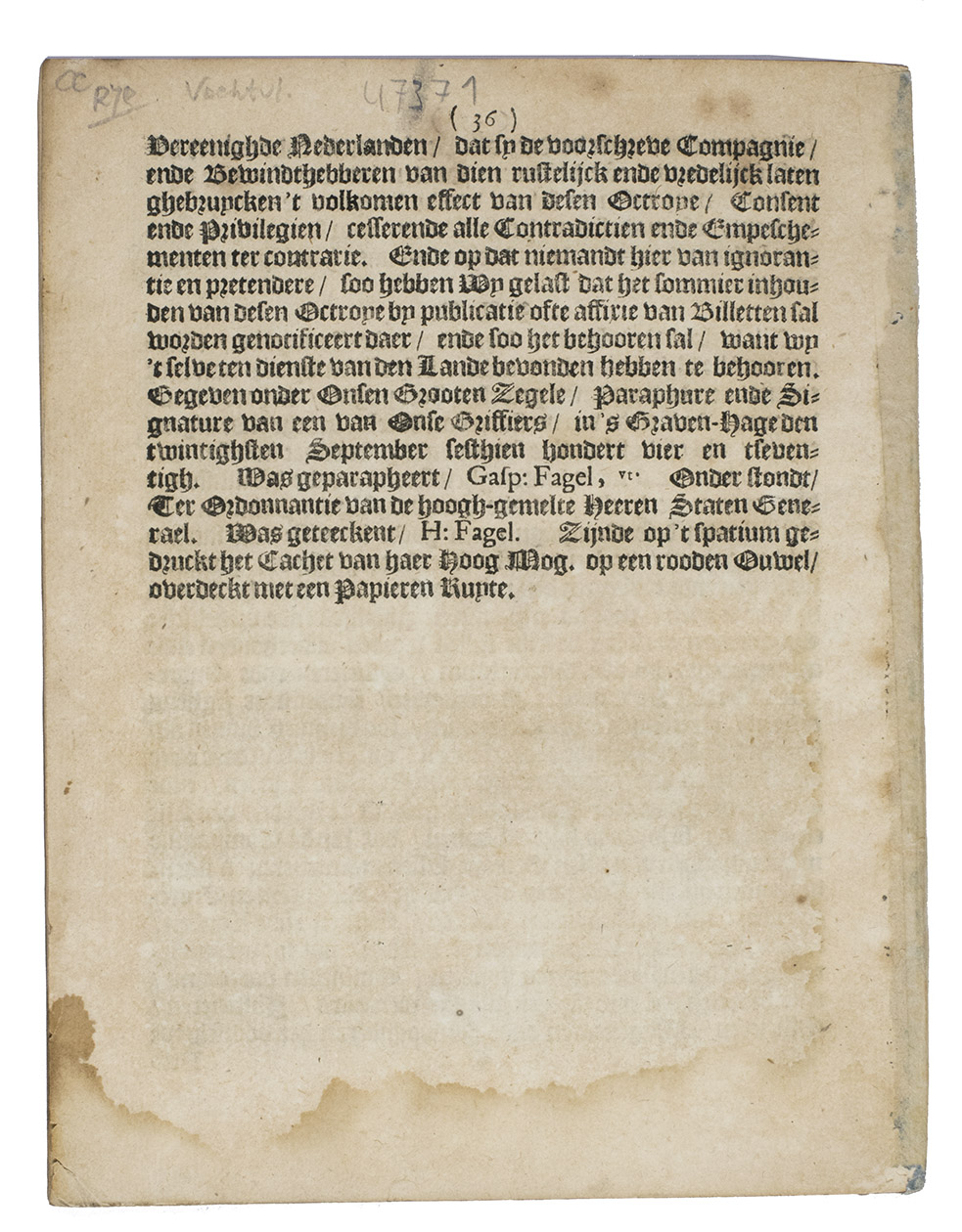Octroy, by de ... Staten Generael, verleent aen de West-Indische Compagnie, in date den twintighsten September sesthien hondert vier en tseventigh.