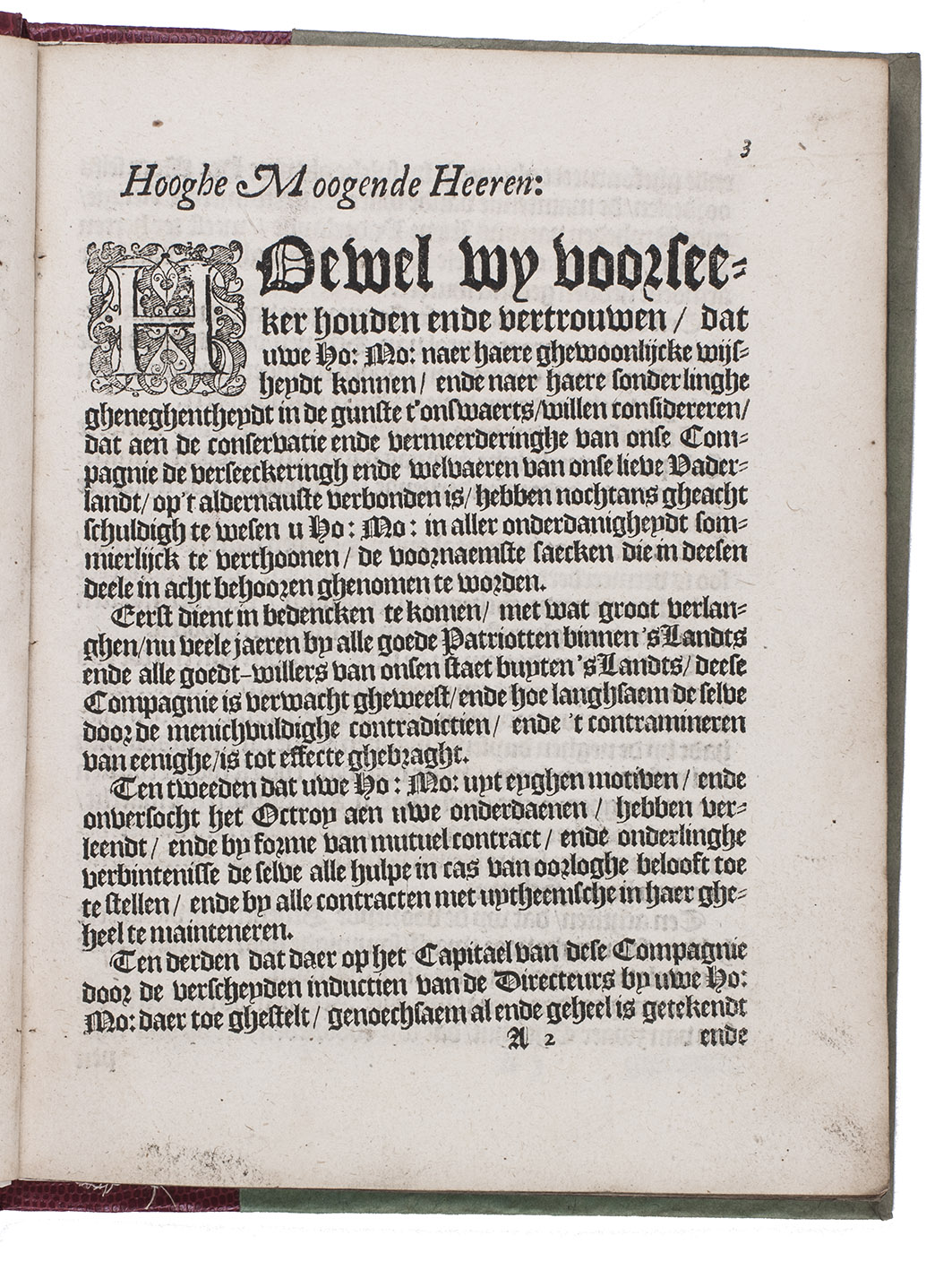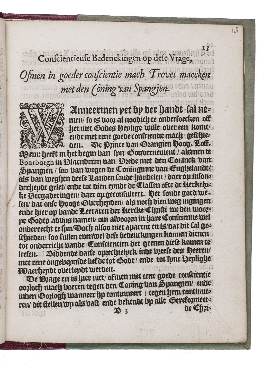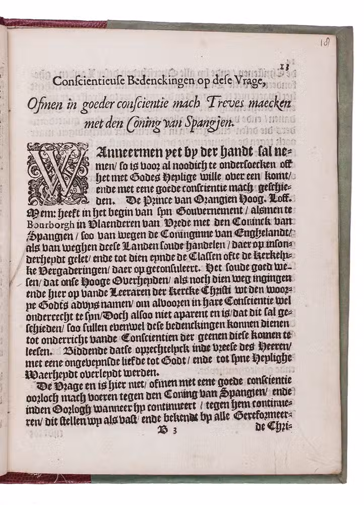 One of four issues published in the same year, of a pamphlet concerning the possibility of a truce with Spain, containing the "considerations and reasons" proposed by the Dutch West-India Company (WIC) to the Dutch States General. After the loss of 's Hertogenbosch in 1629 the Spanish King Philip IV proposed a truce, which left the Dutch Republic divided, also causing debate between the Remonstrants, Counter-Remonstrants and Calvinists, who first wished to create unity before paying attention to Spain. The directors and shareholders of the WIC dreaded a truce with Spain, since capturing Spanish ships was a large source of income for the company (Piet Heyn had captured the Zilvervloot in 1628). It would also have thwarted the WIC intentions to conquer some Spanish territory in Brazil.
