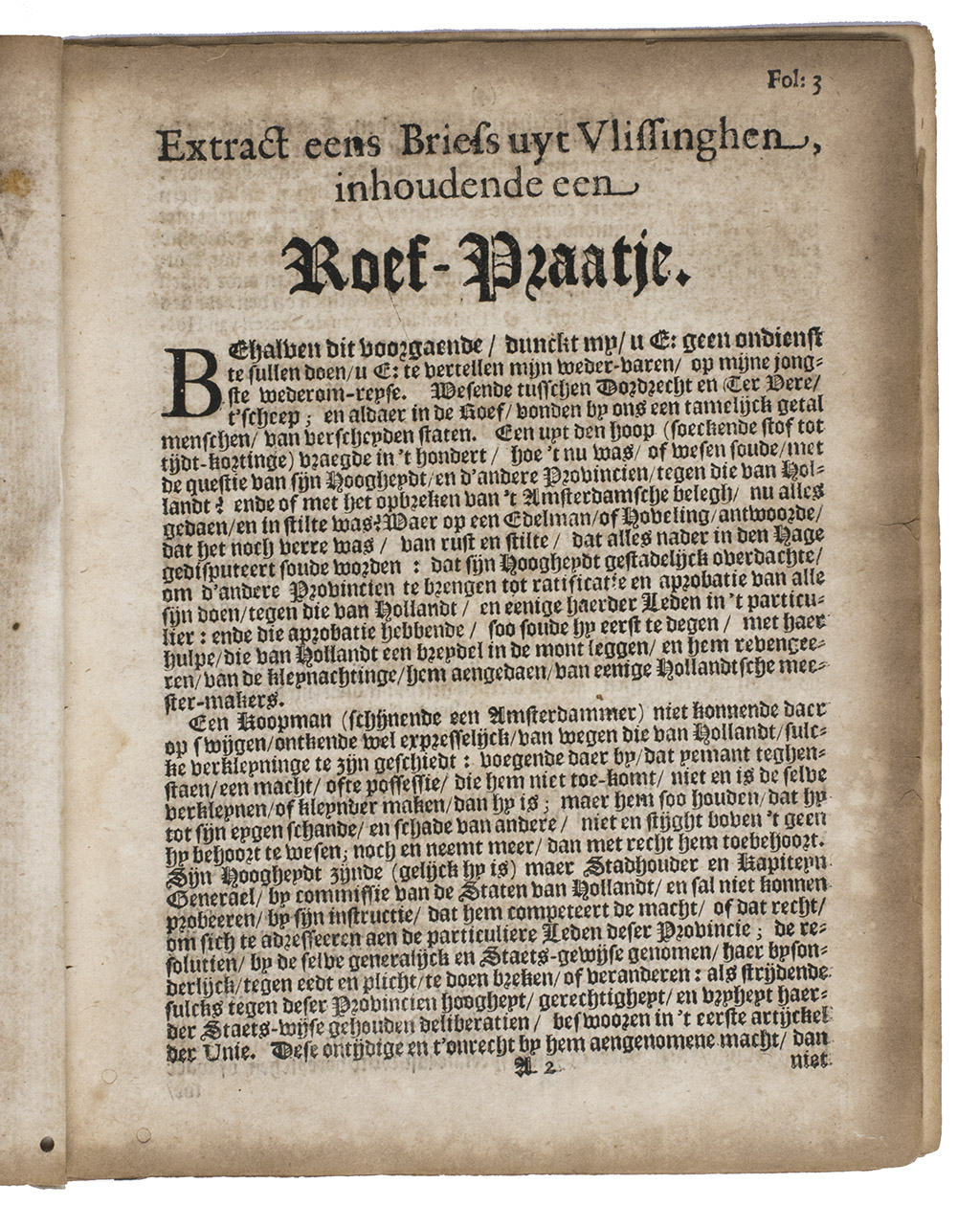 The book is in a good condition, few small wormholes in the margins of some pages, paper slightly torn on some pages, one sheet loose. Alden & Landis 650/65; Knuttel 6855; Tiele, Pamfletten 3795.