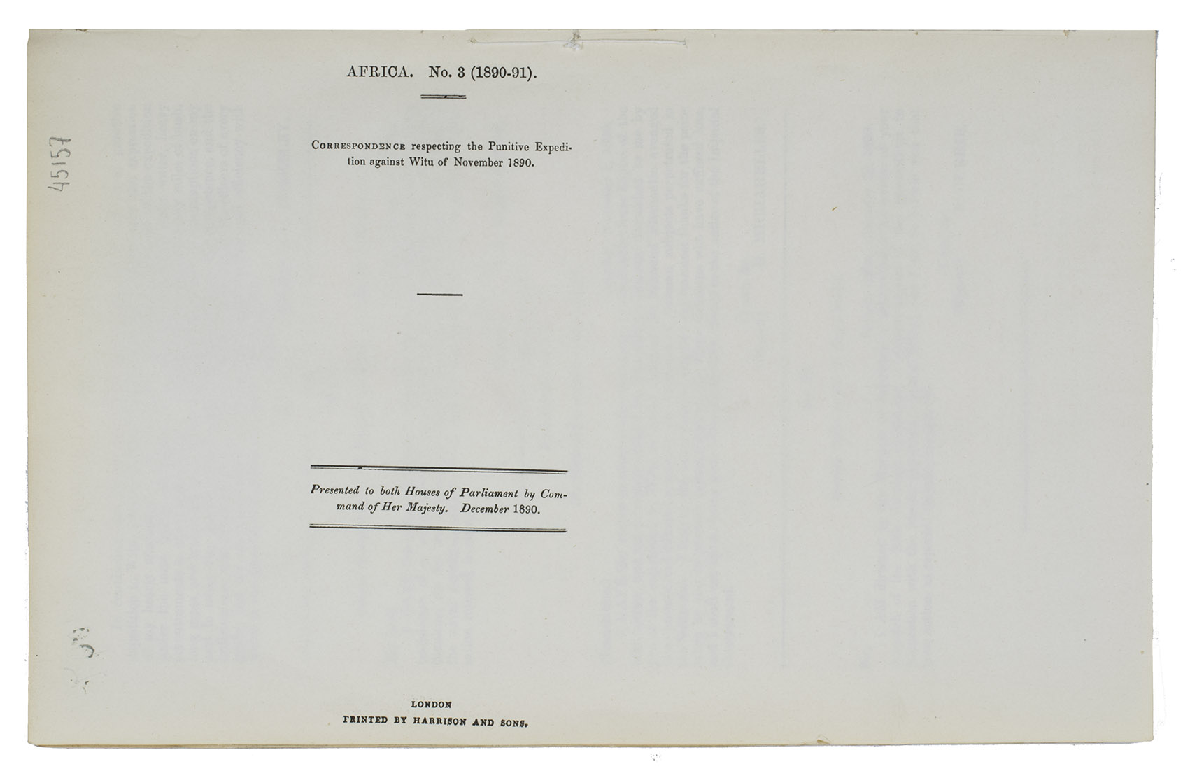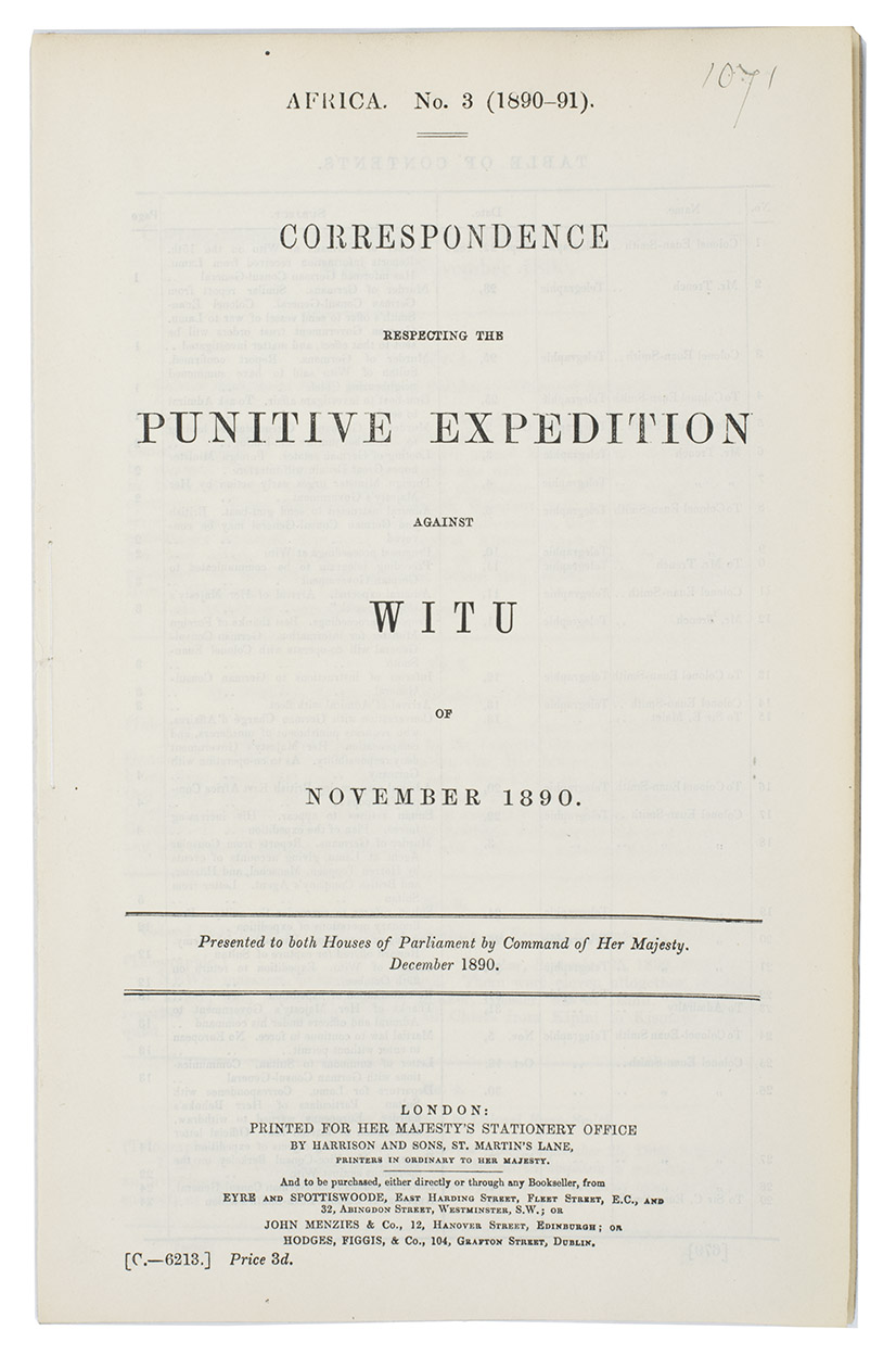 Correspondence respecting the punitive expedition against Witu of November 1890. Presented to both Houses of Parliament by Command of Her Majesty. December 1890.