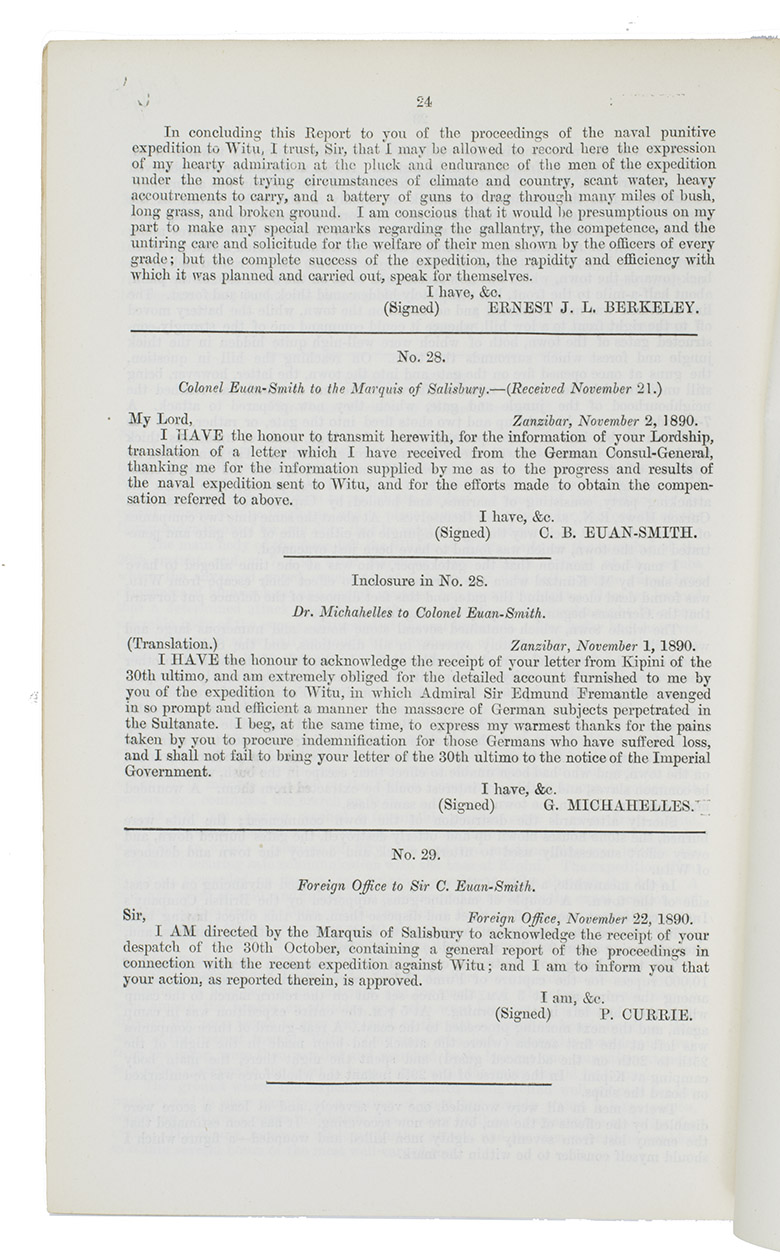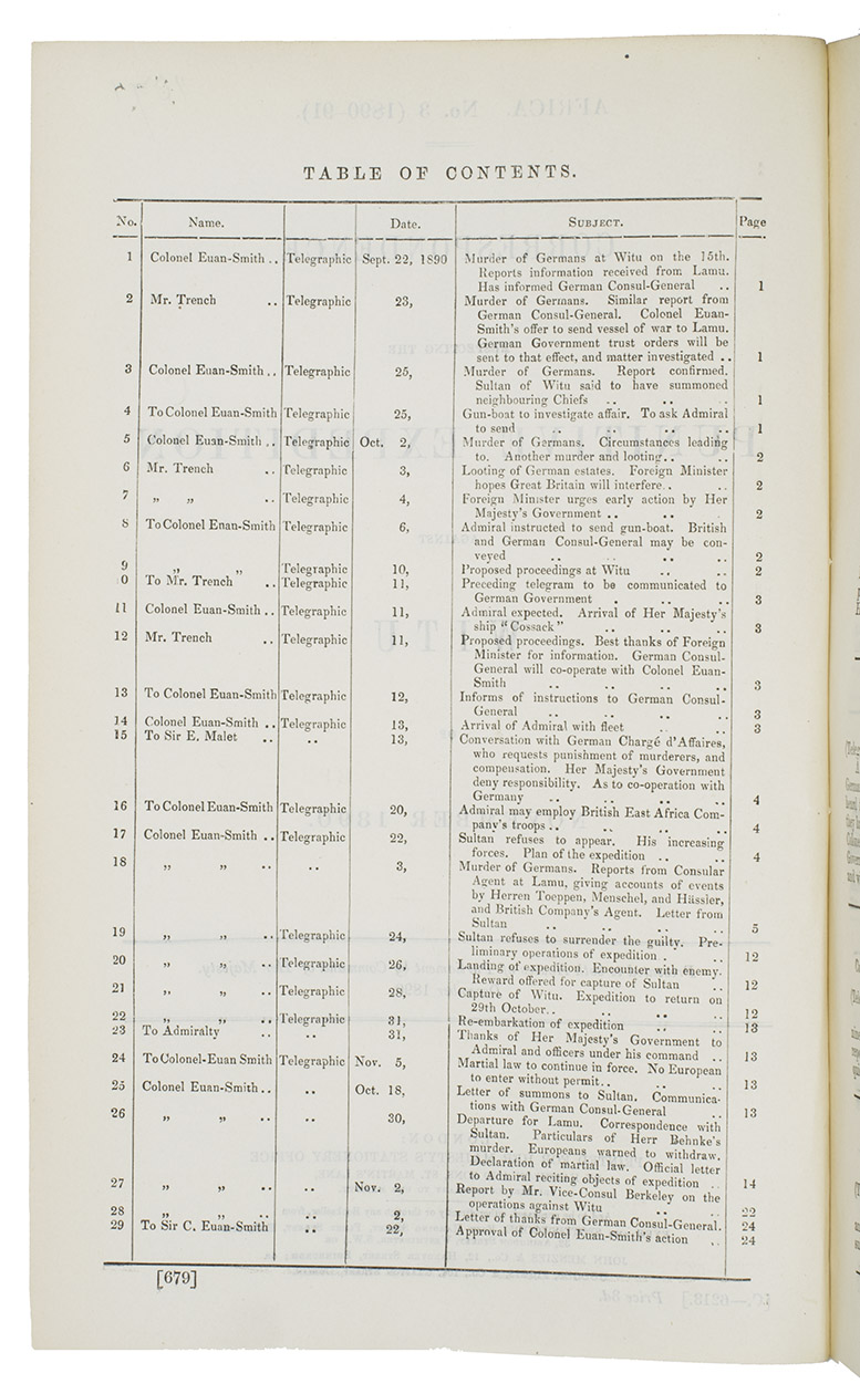 Part of a series of Official British Government reports and memoranda relating to East, West, South and Central Africa. This is no. 3 (1890-1891). The report was carried out by command of the Queen and presented to both Houses of Parliament. The report counts 29 telegraphed messages on the current affairs in Muslim Witu (now Kenia). Sultan Ahmad ibn Fumo Bakari had agreed upon a protectorate by the Prussians in 1858, which lasted until 1890 when under the rule of his son Sultan Fumo Bakari ibn Ahmad the British took over control with the Heligoland-Zanzibar Treaty. Feeling betrayed, the Witu population violently revolted against the Germans. The results of this is reflected in the report, informing of many murders of Germans and looting of German estates and ultimately the capture of Witu by the British.
