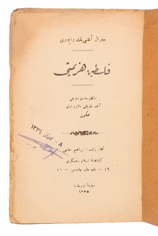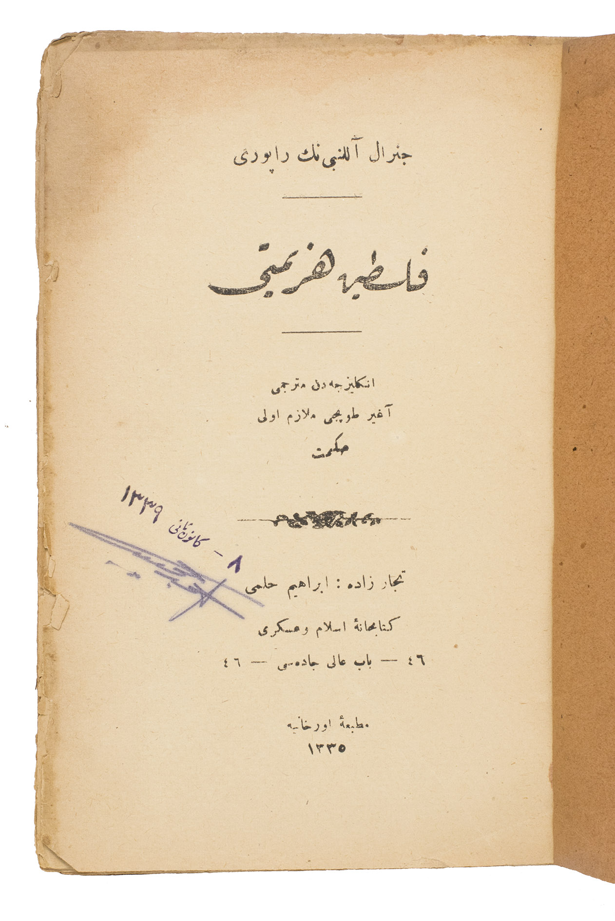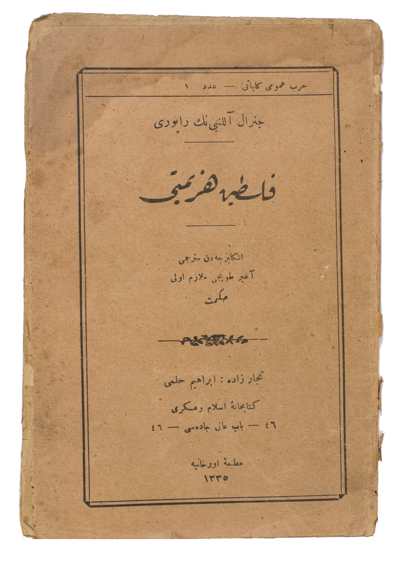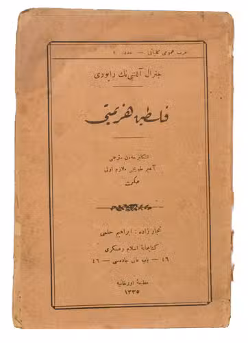 Istanbul, Matbaa-yi Orhaniye, 1335 AH [= 1919 CE]. 8vo (ca. 18.5 x 12.5 cm). With the Turkish text printed using Arabic script. Original publisher's orange printed paper wrappers. 48 pp.