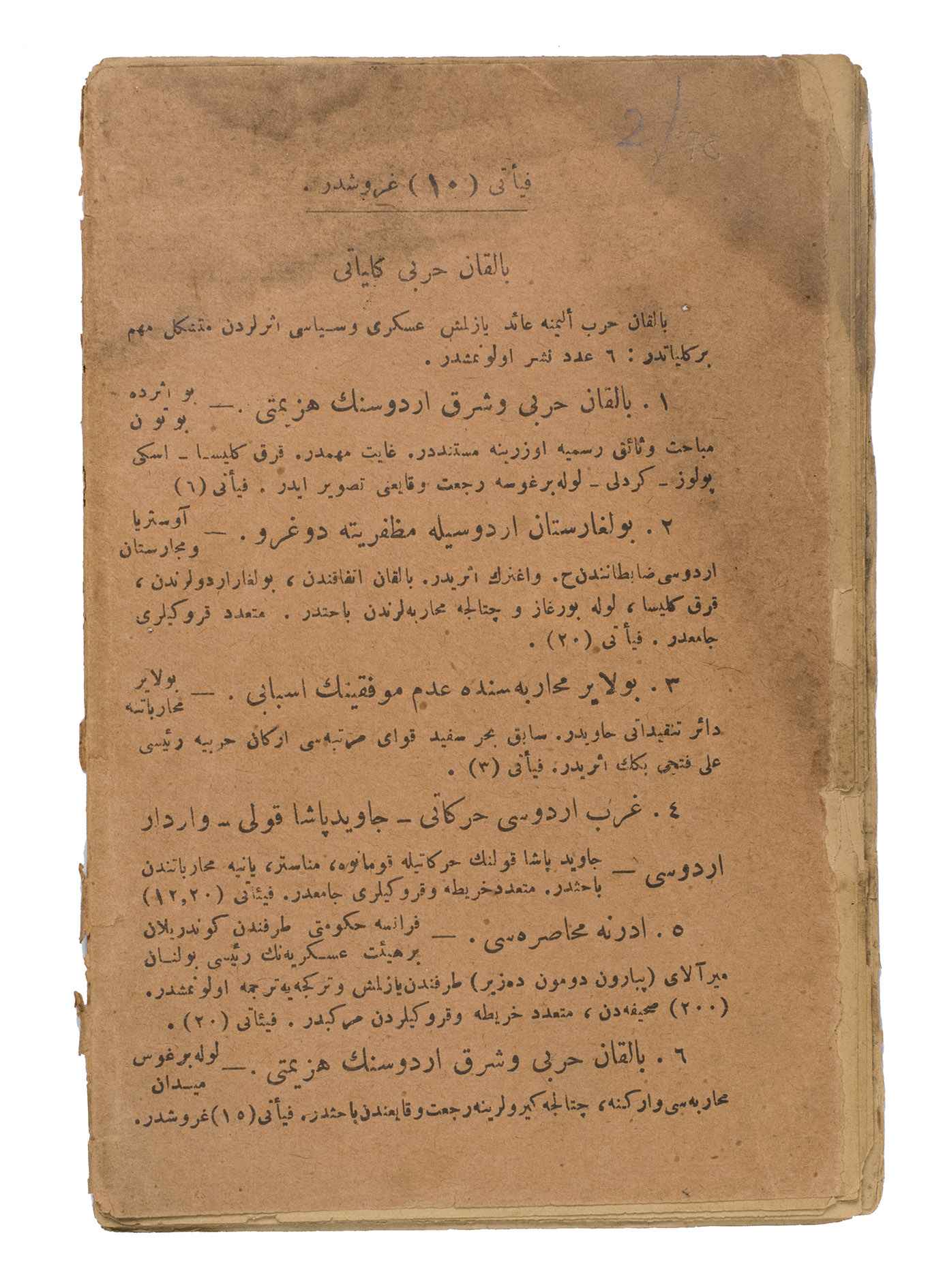 With an inscription on the title page and on the back wrapper. With a water stain on the head margin throughout (including the wrappers), the spine is somewhat torn, but the wrappers are still connected. Somewhat browned throughout, the edges of the leaves are frayed, the leaves are folded and loose in the wrappers, as issued. Otherwise in good condition. WorldCat 777059280 (3 copies); Özege 5787; cf. The campaign in Palestine: General Allenby's official report of the fighting north of Jerusalem up to September 18, 1818. In: Current history (1916-1940), vol. 9 (1), part 2, 1919, pp. 167-172.
