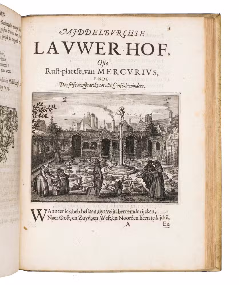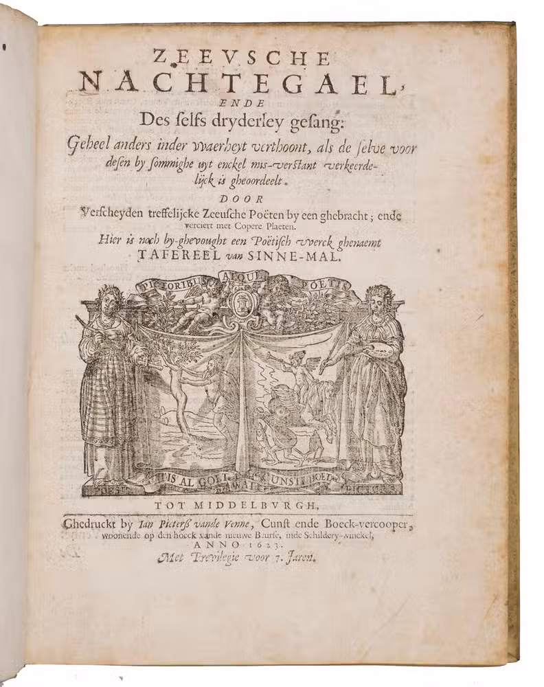 Rare first edition of the "Zeeland Nightingale", perhaps the most intriguing Dutch songbook of the early 17th century, both from the literary point of view, as from the point of view of book illustration and printing. The work was intended to spread the glory of the province of Zeeland, and includes contributions of 18 poets born or living in Zeeland. Produced by the literal society of Middelburg, it showcases the cultural identity of Zeeland through love lyrics, devotional poetry, and moral verse. The work continued to inspire for many centuries, as the present copy was owned by the English explorer Frank Linsley James (1851-1890), and the Frysian art collector and notary Nanne Ottema (1874-1955).