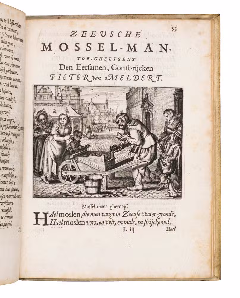 The nightingale was a symbol for talented poets, and this work was to show the world that Zeeland was the place to be for modern artists. The initiator was most likely Jacob Cats. Contributions came from Cats himself, Anna Roemer Visscher, Philibert van Borssele, Adriaen Valerius, Johannis de Bruyne, and many others. Adriaen van de Venne contributed a love song, Zeeusche Mey-clacht, accompanied by a beautiful illustration of a well-dressed young man leaning over a stream and mirroring himself in the water, engraved by W. de Passe. At the end, to promote sales, a newly finished work by Adriaen van de Venne, the brother of the publisher, was added, Tafereel van Sinne-Mal. In this work is found the beautiful engraving of the "Middelburgsche Lauwerhof", the fine garden at the back of his brother's printing office, and in the accompanying song all things sold at his brother's bookshop are listed, such as maps and prints, paintings and lacquered ware, compasses and nautical instruments, watches, etc. Other fine and interesting plates are the mussel-seller, and the knife-grinder, especially dedicated to Magdalena de Passe.