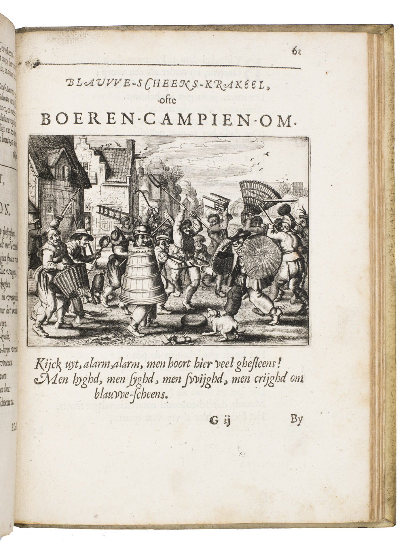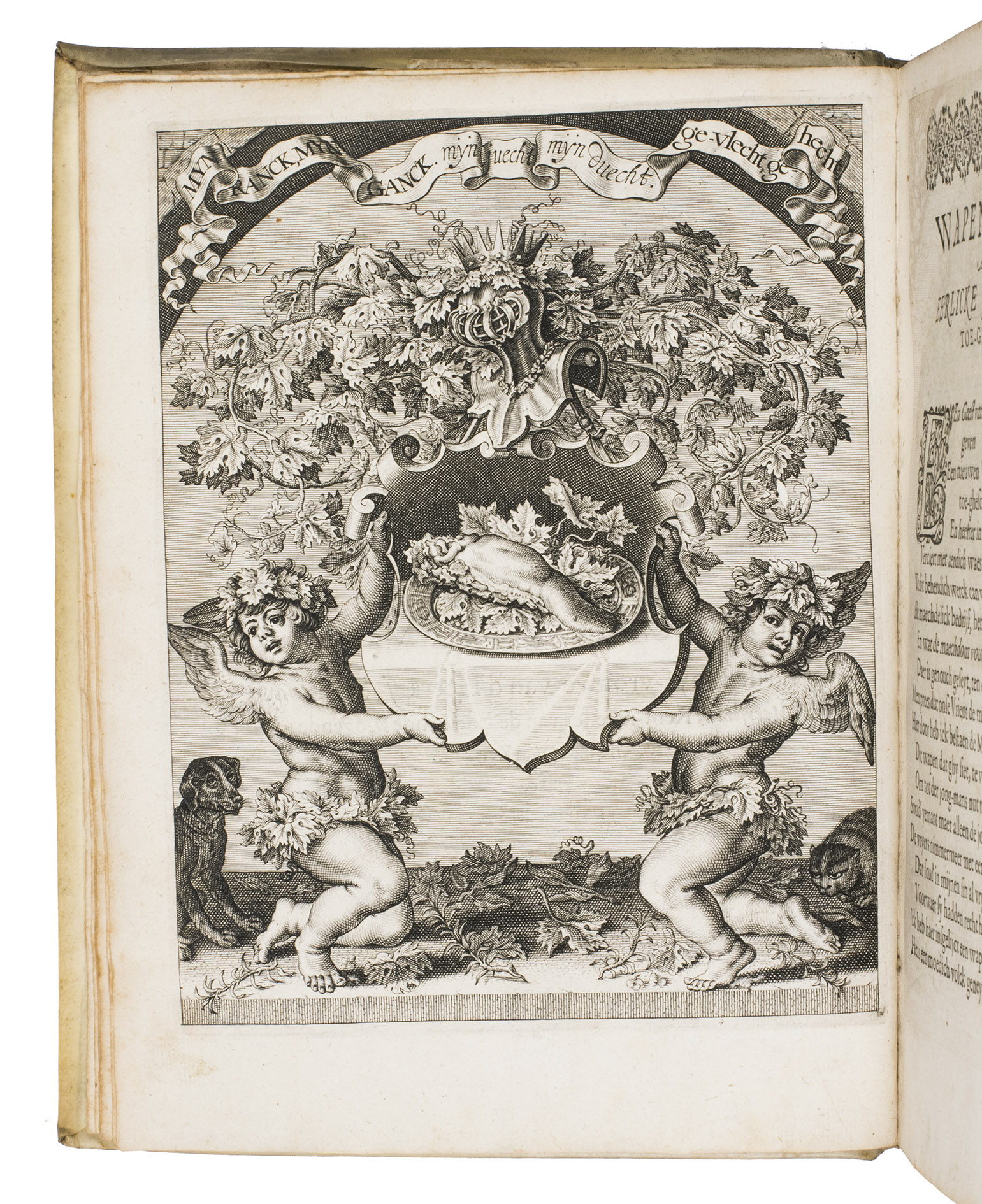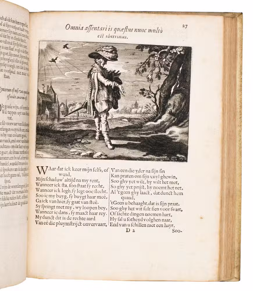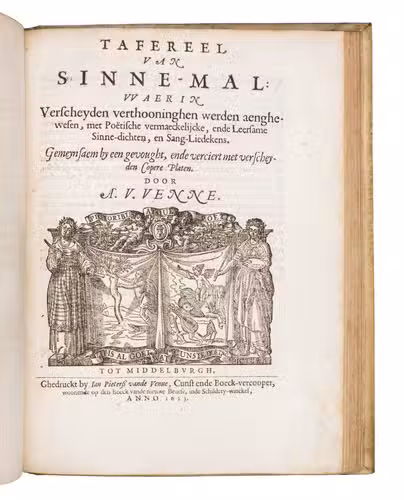 Middelburg, Jan Pietersz vande Venne, 1623. 2 works in 1 volume. 4to. With a large woodcut printer's device on the title page of each part, a woodcut headpiece with a view of Middelburg at the start of each part, a full-page engraved emblematic coat of arms and 7 large emblems by D. van Bremden, W. de Passe, P. de Jode, C. van Queboren and P. Serwouter after designs by Adriaen van de Venne in the first part; 8 large engravings in the text showing witty scenes, designed and engraved by Adriaen van de Venne in the second part. Contemporary gold-tooled vellum. [10], 86, [4], 60, [4], 63, [1 blank]; [8], 114 pp.