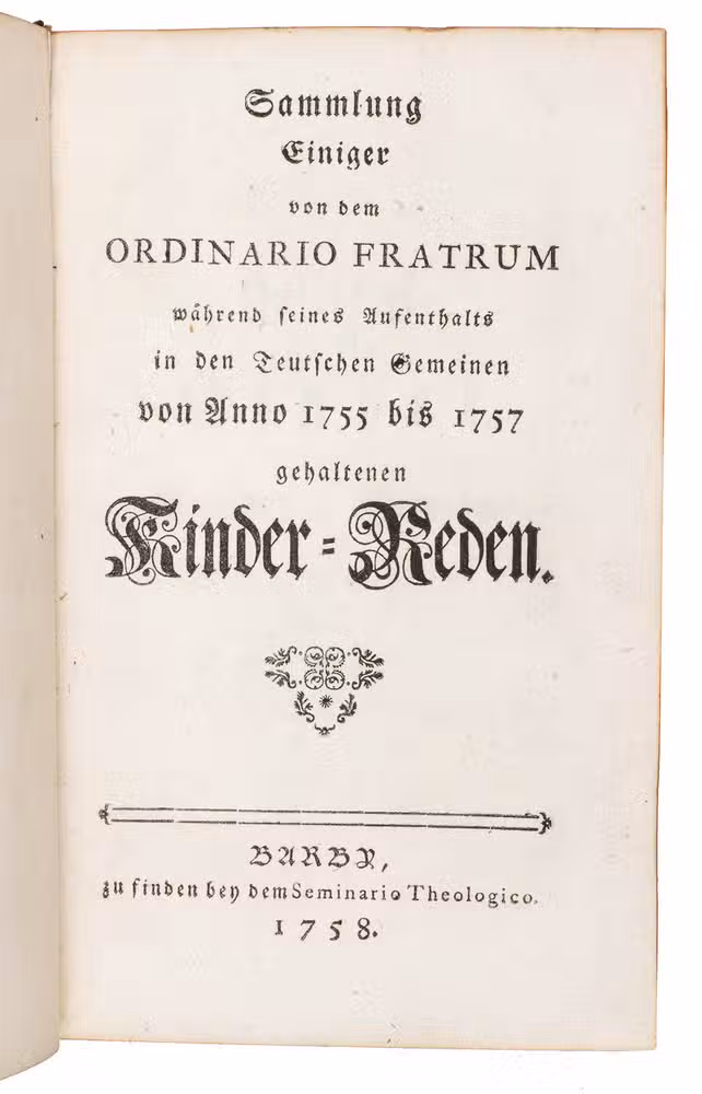 Sammlung Einiger von dem Ordinario Fratrum während seines Aufenthalts in den Teutschen Gemeinen von Anno 1755 bis 1757 gehaltenen Kinder-Reden.