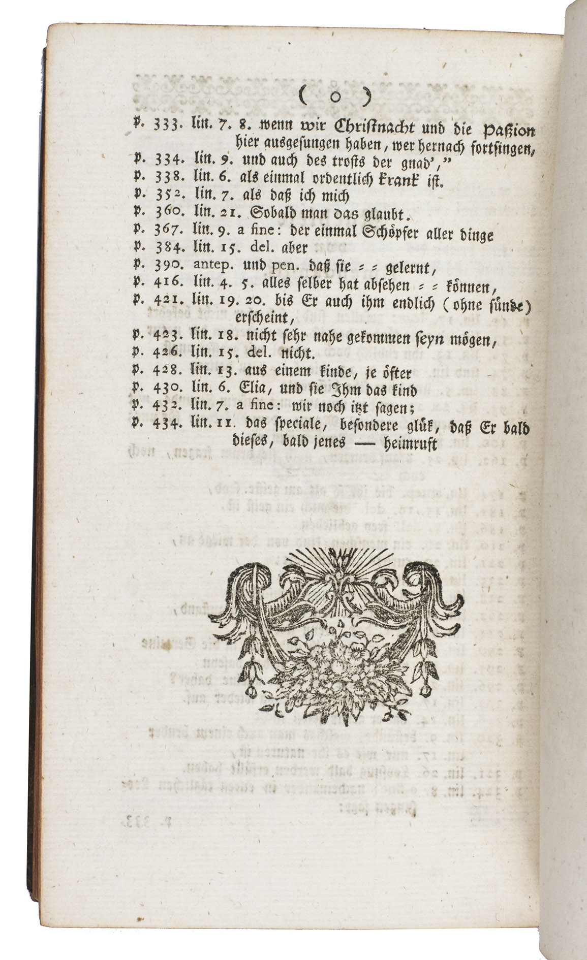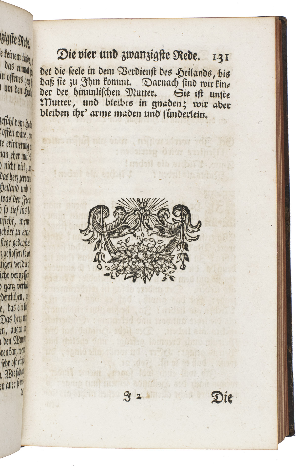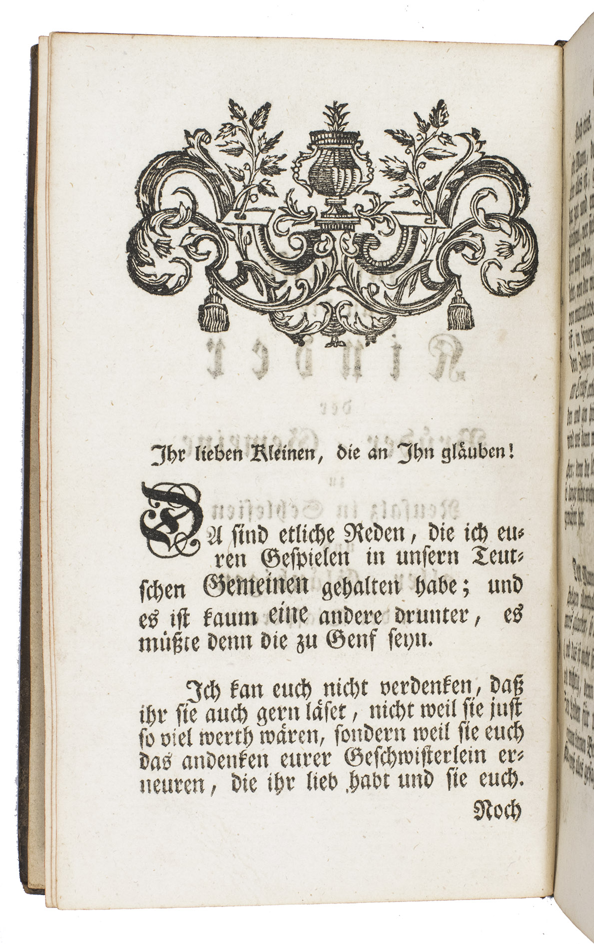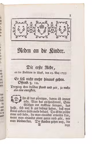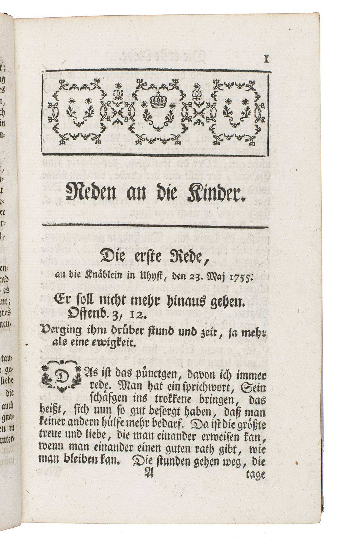 Rare first edition of a collection of sermons for children held by the spiritual leader and founder of the Moravian Brethren at Hernnhut, near Dresden in Saxen, Germany. After he studied law in Wittenberg and a short career in civil service at Dresden, Nikolaus Ludwig Graf Von Zinzendorf und Pottendorf (1700-1760), decided to provide a shelter for the long persecuted Moravian Brethren, of whom Comenius had been an early example. He not only provided them with a revived Church at Herrnhut, but also devoted his life and energy to the spread of their belief in the rest of the world by his personal zeal as a travelling missionary. He founded many communities, both in America and Europe, among others in the Netherlands where communities were founded at Amsterdam, in 1744, and the famous long-living community at Zeist, in 1746. The present book was printed at the Community's Press at Barby, mainly in Gothic type, and nicely adorned with woodcut vignettes and head-pieces. Most sermons are accompanied by songs and prayers. Von Zinzendorf became especially known for the numerous songs he wrote for the Moravian Brethren.