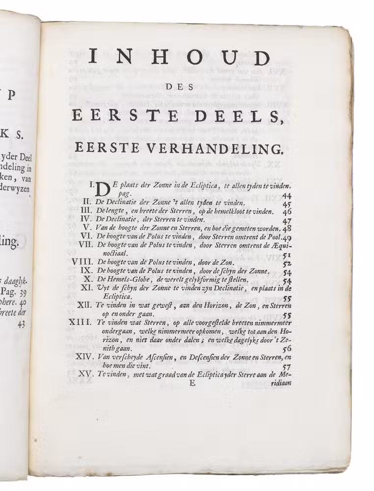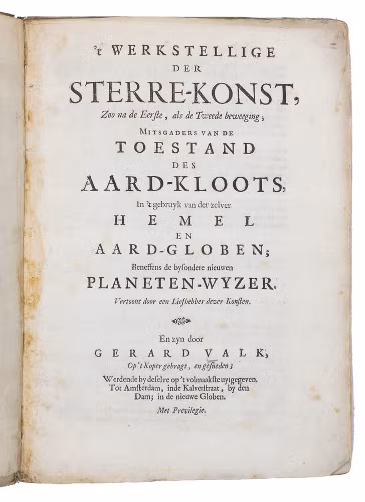 Late 17th- or early 18th-century astronomical work by the famous globemakers and publishers Gerard and Leonard Valk. The present work is based on Willem Blaeu's standard work on globes, Tweevoudigh onderwijs van de hemelsche en aerdsche globen (first published 1634), with revisions taking into account Johannes Hevelius' observations (Hoogendoorn). Supposedly, Blaeu's work had been out of print and difficult to obtain for quite some time, warranting a new publication on the subject of globes, especially as father and son Valk were publishing their own up-to-date globes.