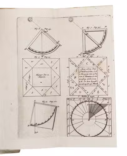 Amsterdam, Gerard Valk, [late 17th or early 18th century (ca. 1701?)]. 4to. With an engraved frontispiece, and 4 folding engraved plates. Further with a few tables in the text, some woodcut decorated initials, and a woodcut floral tailpiece. Contemporary stiff orange-brown sprinkled paper boards. [1], [1 blank], [2], 140 pp.