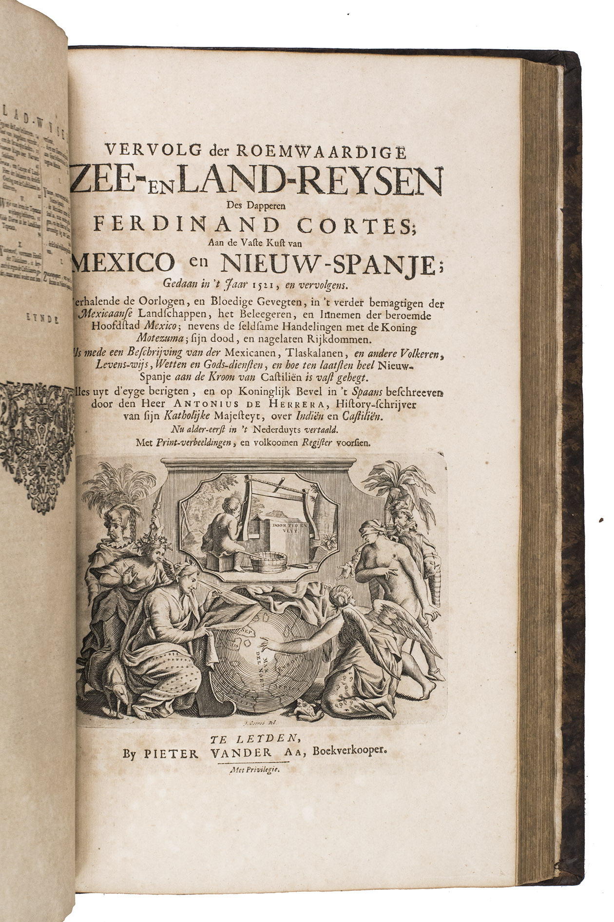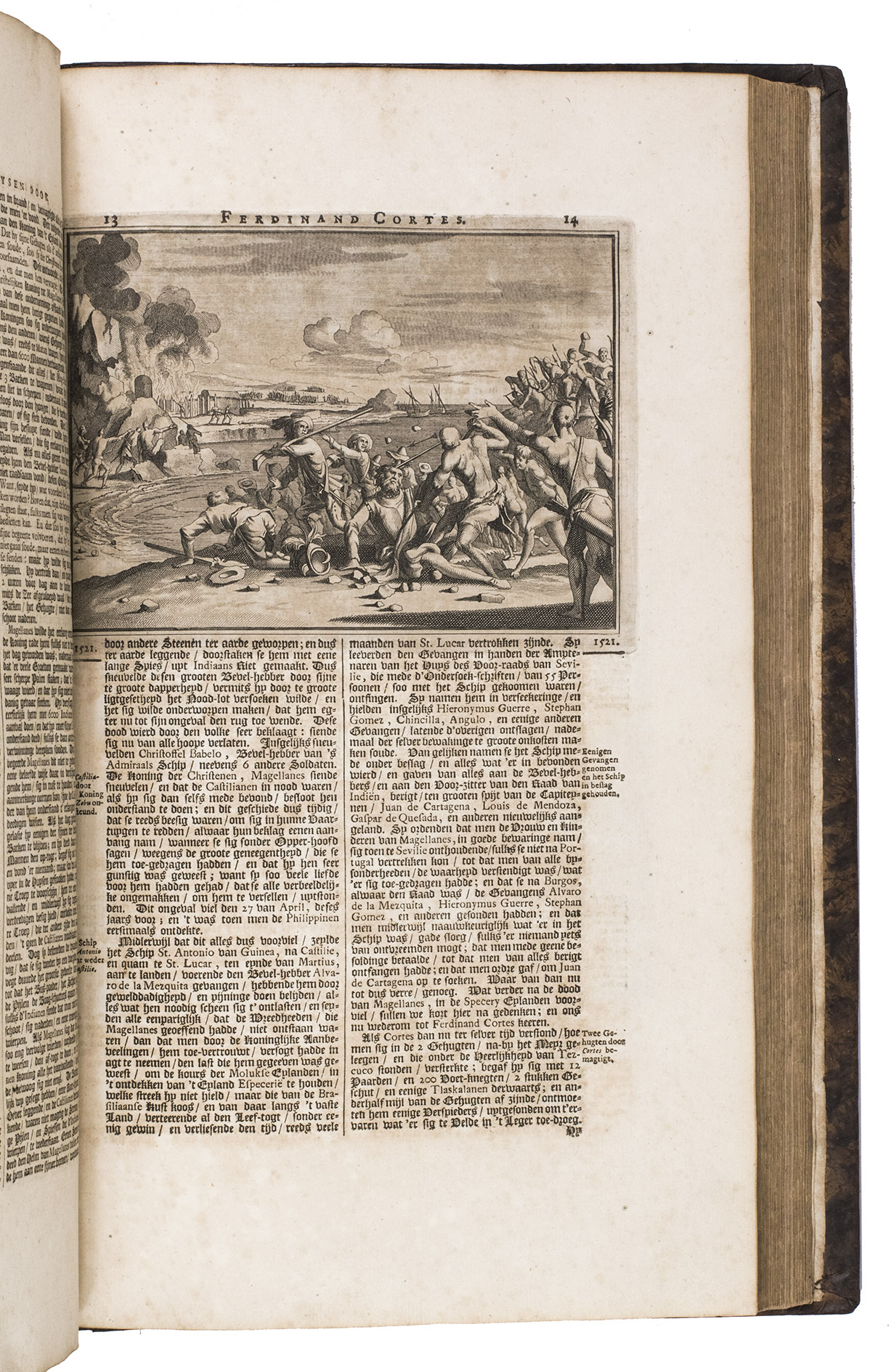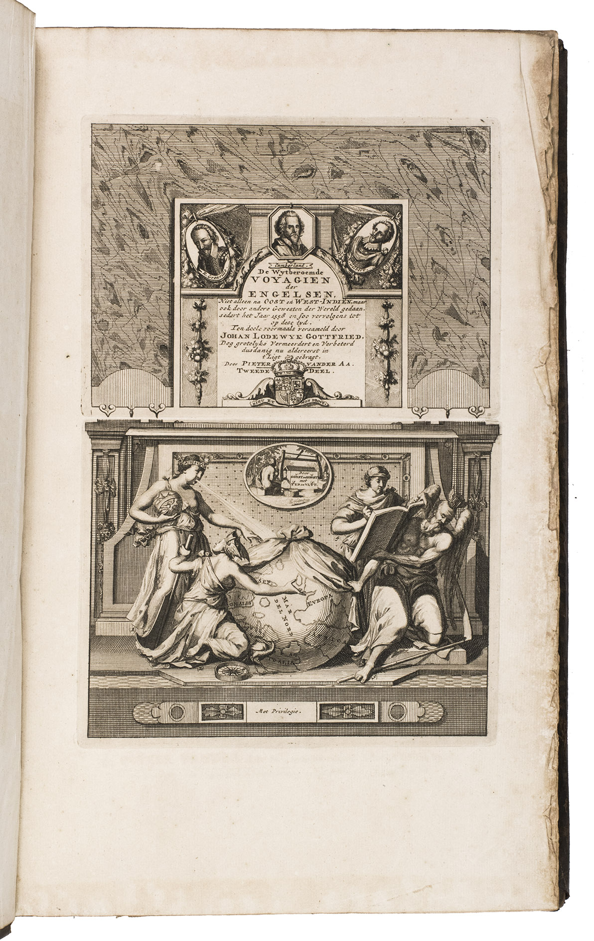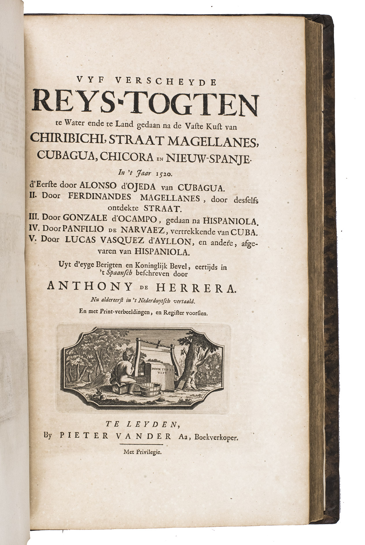 Included are the travel accounts of voyages undertaken by Acosta, Balbi, Cavendish, Chester, Columbus, Cortes, Coutinho, Da Cunha, Drake, Evesko, Frobisher, Da Gama, Garcia, Jenkinson, Harcourt, Herberer, Magallanes, Raleigh, Saris, De Soto, and many others. It was edited and co-published by Pieter van der Aa (1659-1733), known for his ambitious projects. He already started publishing the translated voyages both in small (8vo) and large instalments (folio or 1mo) in 1706, and a year later he published a 28-volume set of the 8vo editions, with the travel accounts arranged chronologically. When this was ready, he proceeded with the folio-edition. For this, he arranged the accounts by country of origin of the travellers, and divided the work into four large divisions of two volumes each. All voyages have their own separate title, with their own index at the end. The present issue is a reissue of these four collections with their own independent title pages and frontispieces, but now includes a new general title-page and list of subscribers. It also includes the original volume titles, which were often removed.