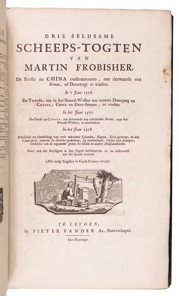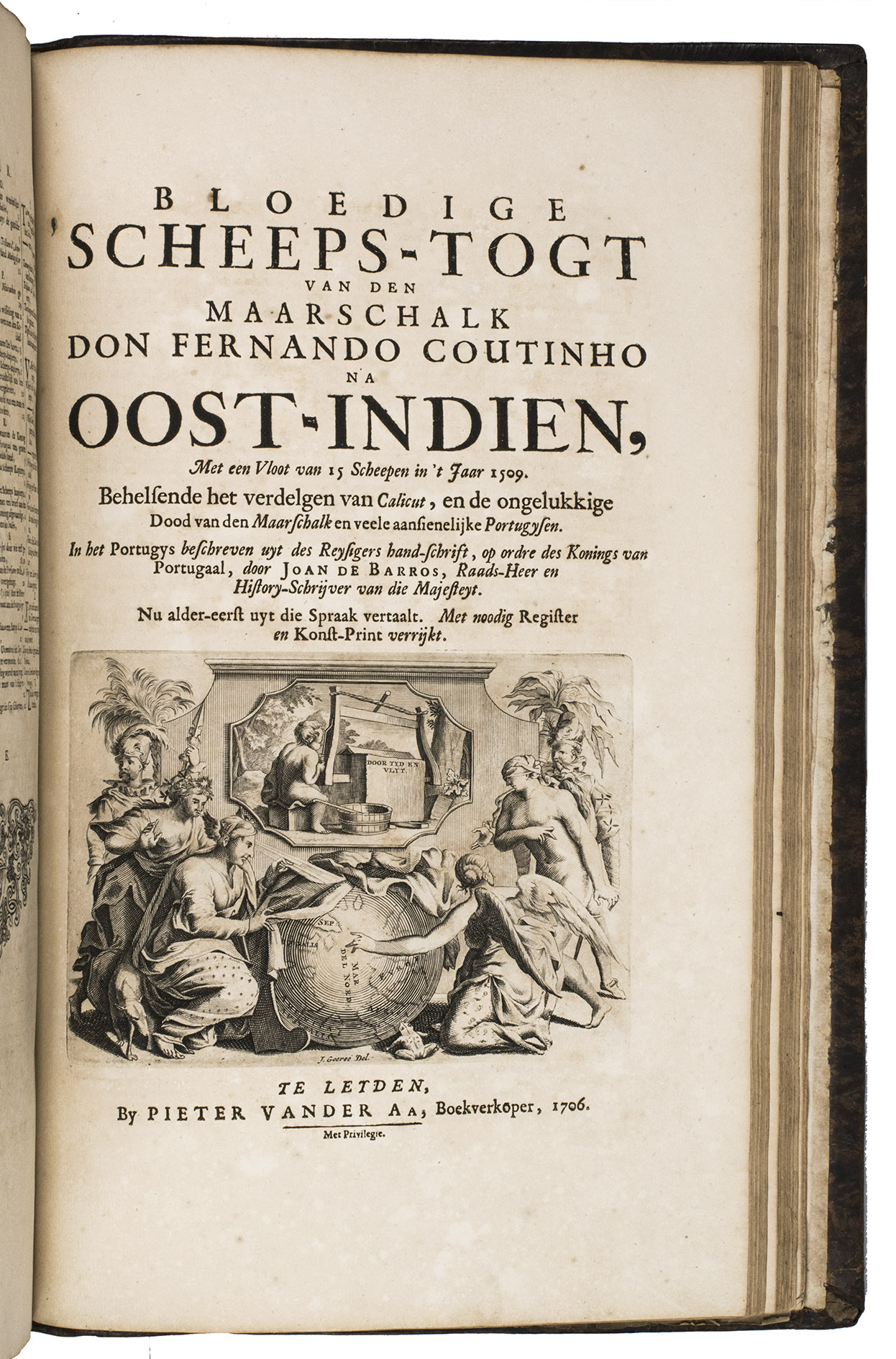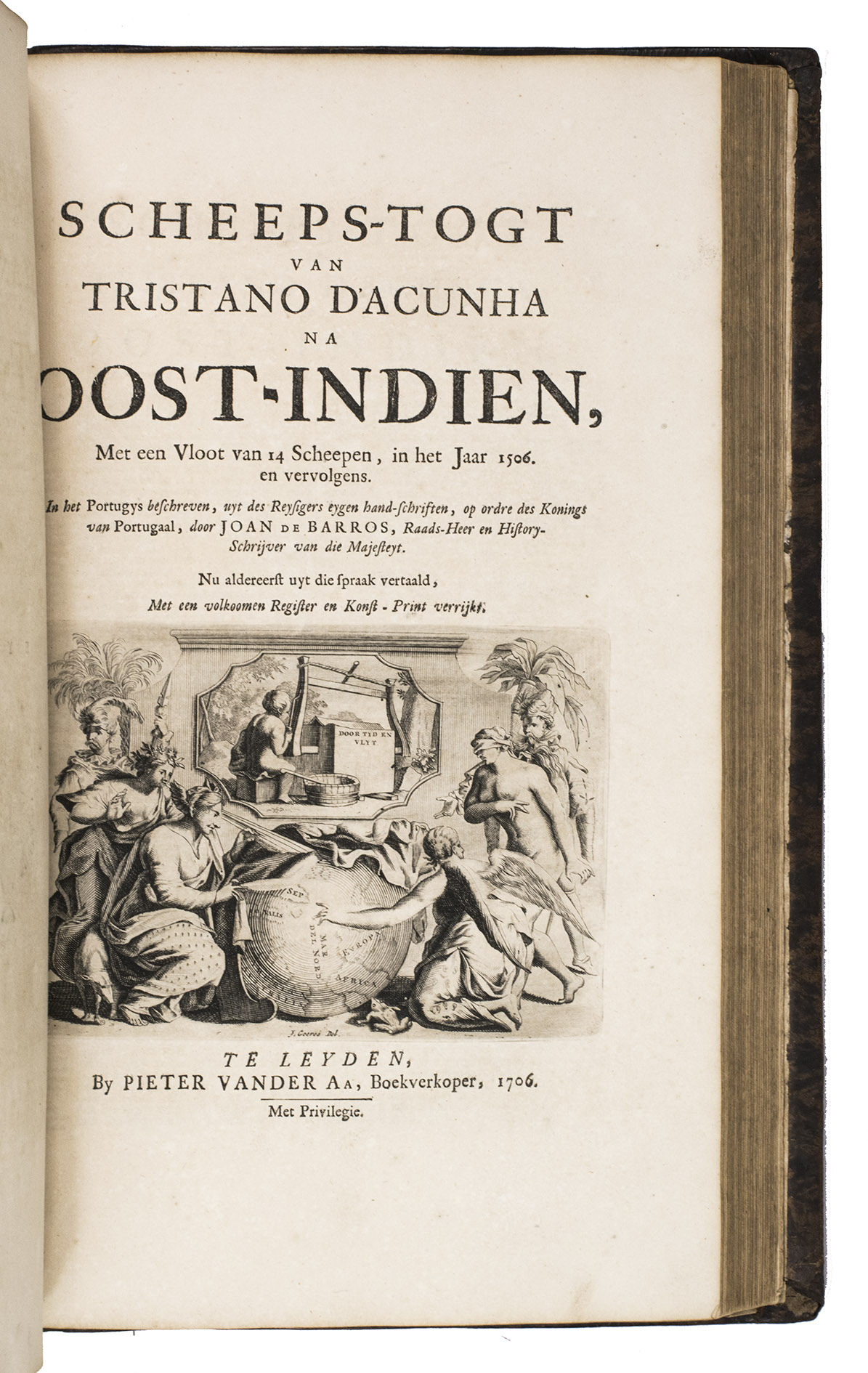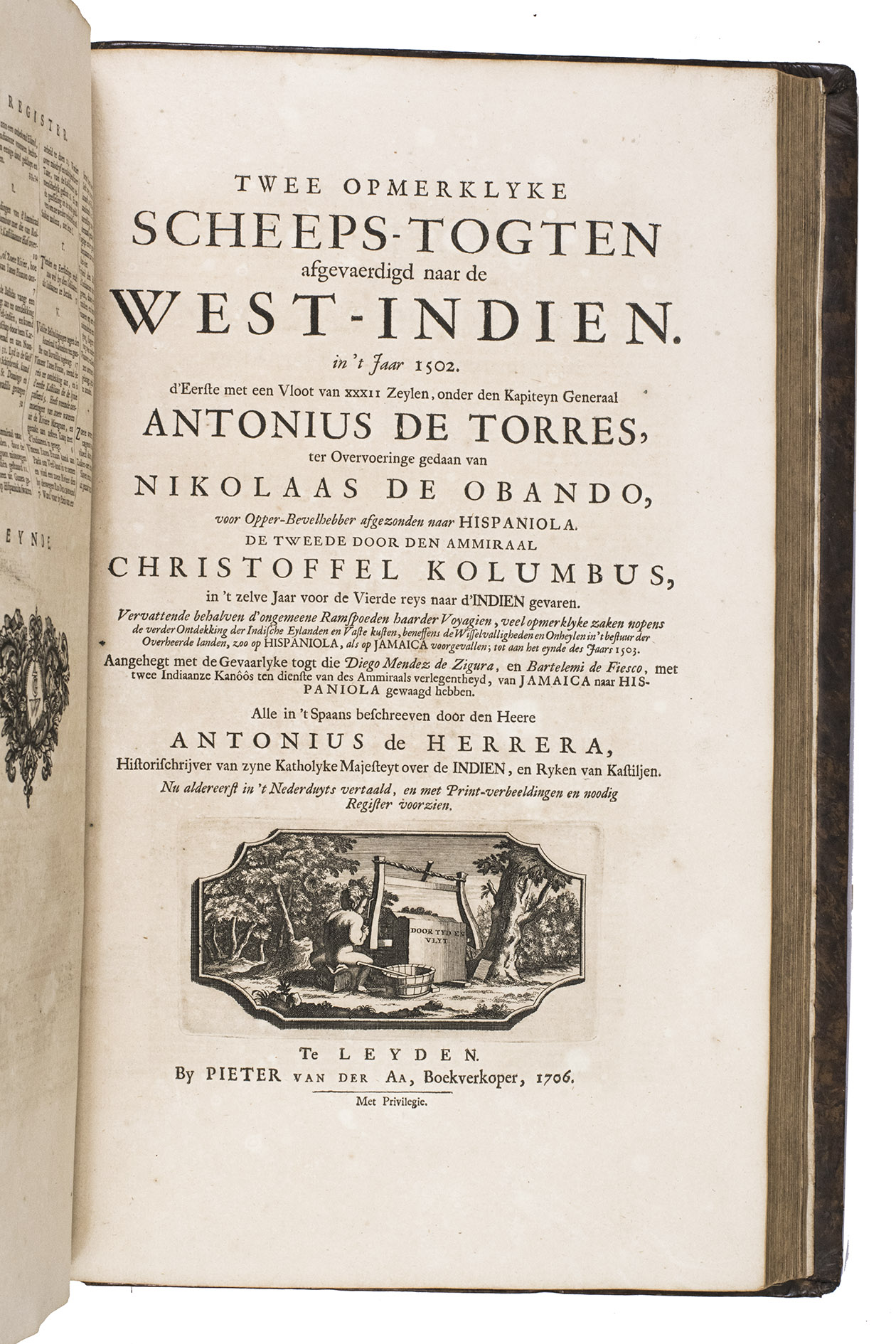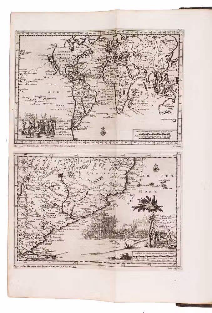 Included are the travel accounts of voyages undertaken by Acosta, Balbi, Cavendish, Chester, Columbus, Cortes, Coutinho, Da Cunha, Drake, Evesko, Frobisher, Da Gama, Garcia, Jenkinson, Harcourt, Herberer, Magallanes, Raleigh, Saris, De Soto, and many others. It was edited and co-published by Pieter van der Aa (1659-1733), known for his ambitious projects. He already started publishing the translated voyages both in small (8vo) and large instalments (folio or 1mo) in 1706, and a year later he published a 28-volume set of the 8vo editions, with the travel accounts arranged chronologically. When this was ready, he proceeded with the folio-edition. For this, he arranged the accounts by country of origin of the travellers, and divided the work into four large divisions of two volumes each. All voyages have their own separate title, with their own index at the end. The present issue is a reissue of these four collections with their own independent title pages and frontispieces, but now includes a new general title-page and list of subscribers. It also includes the original volume titles, which were often removed.